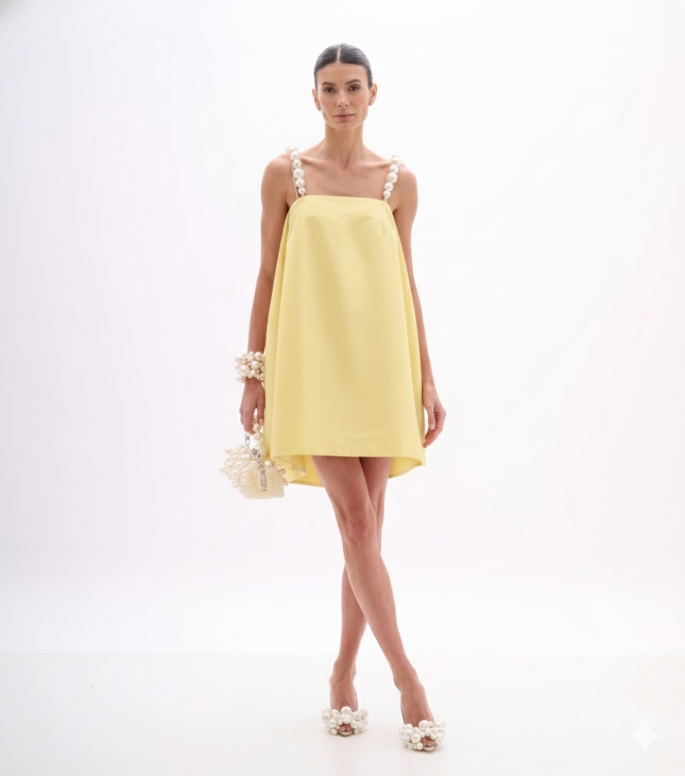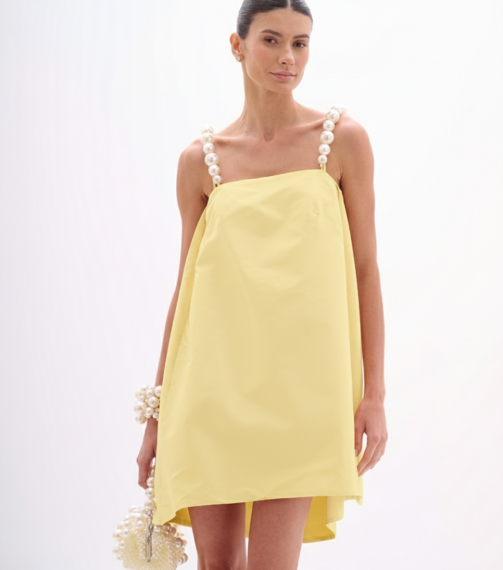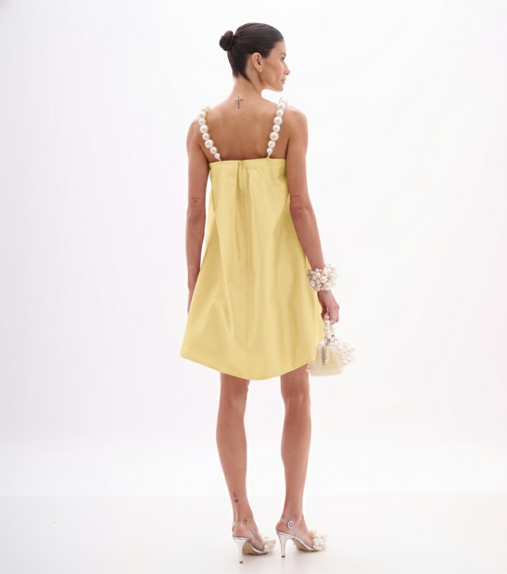 VESTIDO CURTO EM TAFETÁ YELLOW CREAM COM ALÇAS DE PÉROLAS