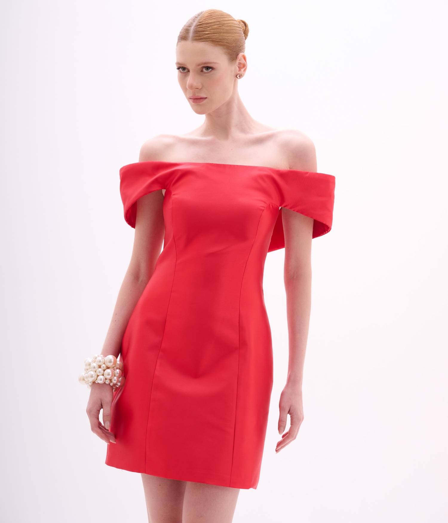 Vestido de festa confeccionado em zibeline vermelho, tecido nobre de estrutura firme e brilho acetinado sutil que confere elegância e sofisticação ao visual. O modelo apresenta decote ombro a ombro com dobra estruturada e alcinhas finas de elástico, que garantem conforto, sustentação e um caimento delicado sobre os ombros.