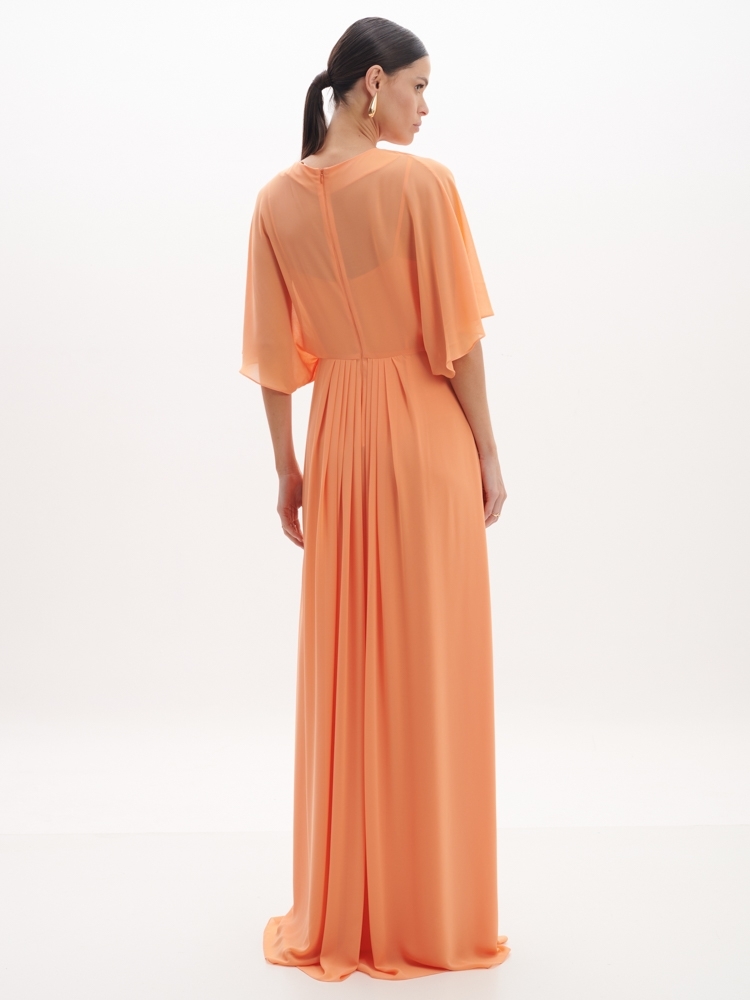 Vestido longo confeccionada em crepe fluido, exala frescor e leveza. Possui decote em "V" confere uma sensualidade equilibrada, modelagem é única com drapeados ao longo do busto, cintura e no caimento da saia.