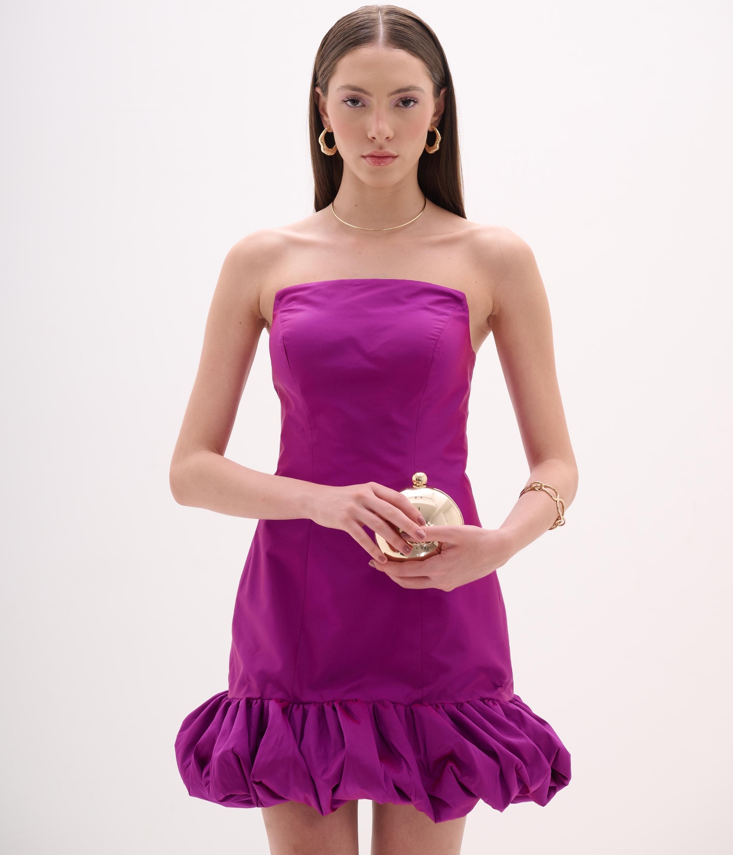 Vestido de festa curto confeccionado em tafetá estruturado, em tom sofisticado de uva — uma cor elegante e atemporal que destaca o brilho acetinado do tecido. O modelo apresenta decote tomara que caia com busto estruturado e silhueta ajustada ao corpo, valorizando as formas com equilíbrio e delicadeza. O babado balonê na barra adiciona volume e movimento, criando um visual contemporâneo e feminino.