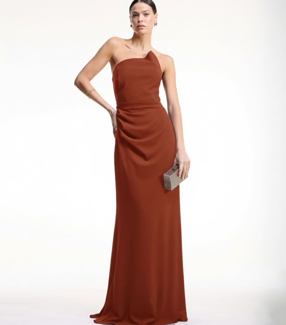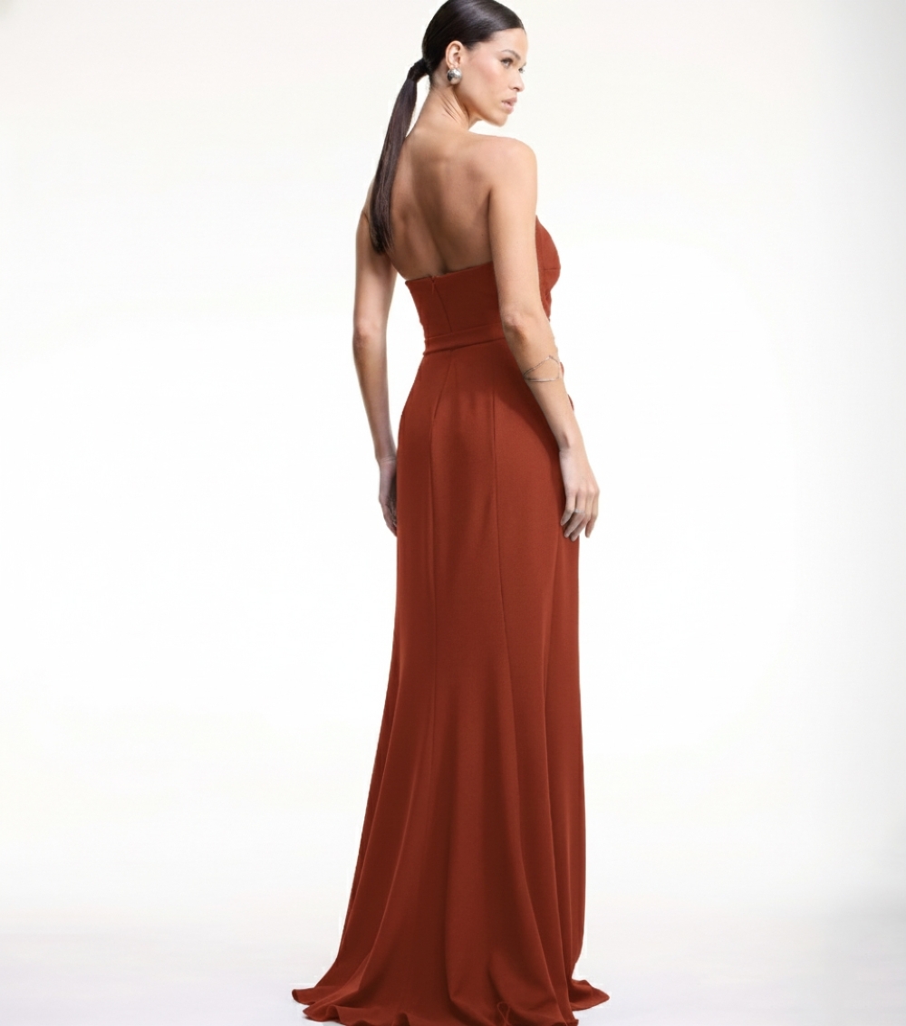 Vestido longo confeccionado em crepe, possui pregas, sem alça, saia ajustada nos quadris e ampla na barra, fechamento. É uma peça minimalista e moderno dando elegância para ocasiões festivas.