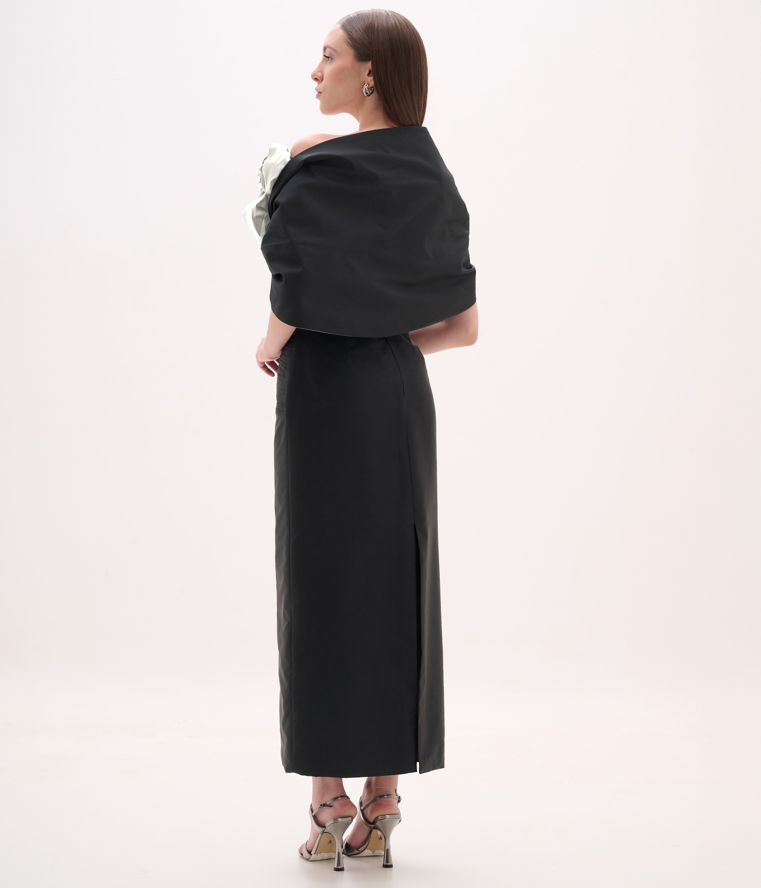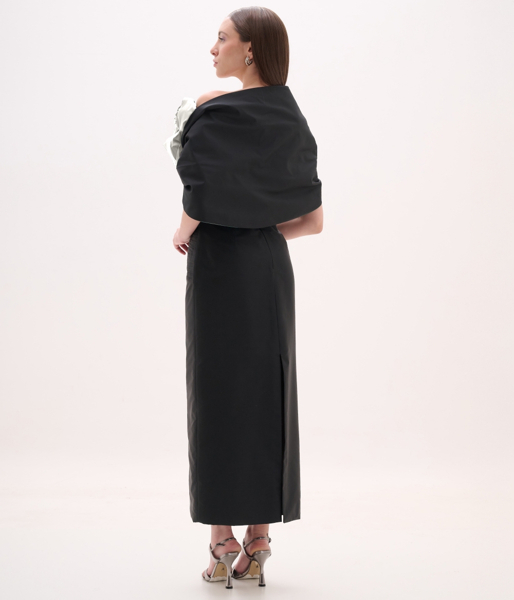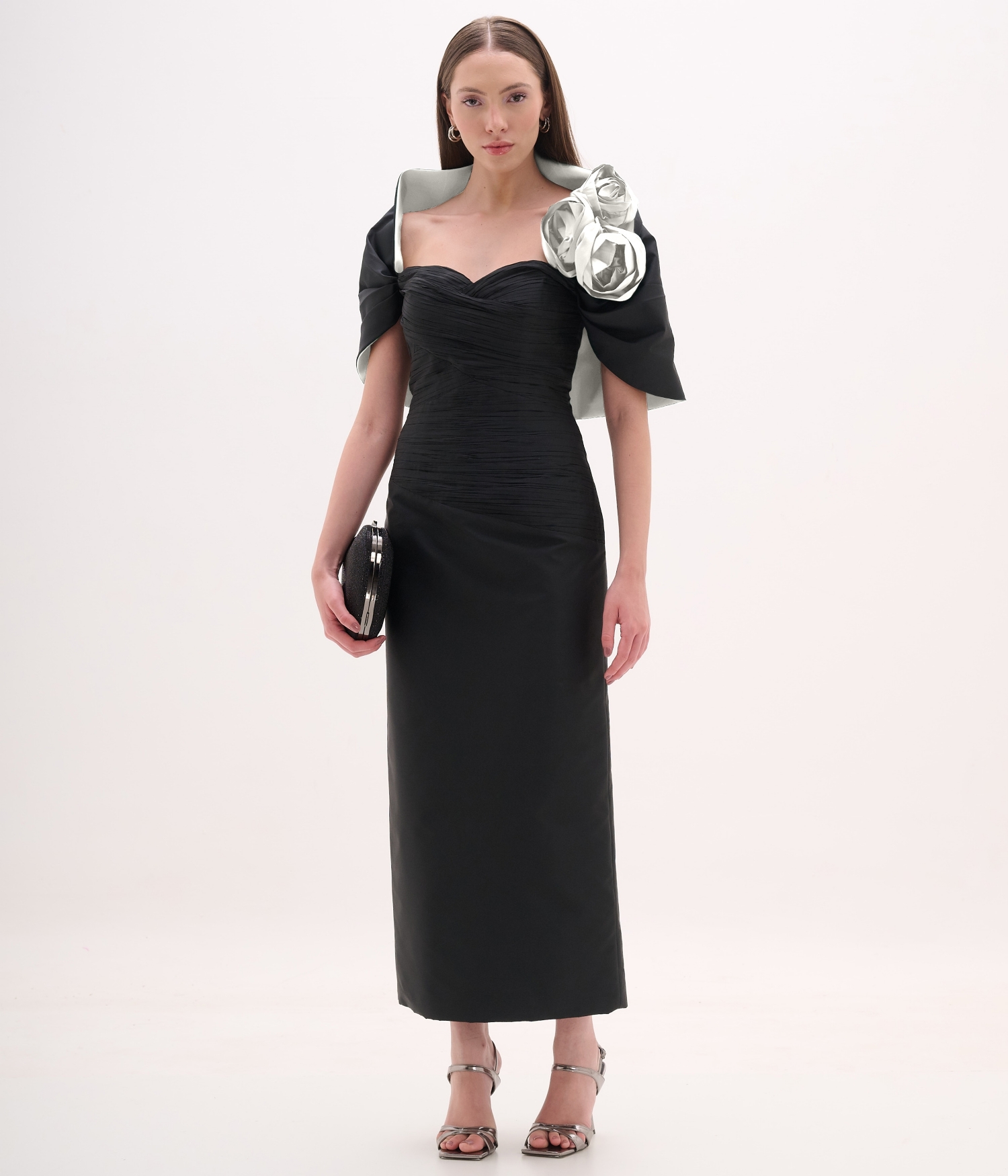 Vestido ideal para madrinhas de casamento à noite, mães de noiva ou noivo, eventos de gala e ocasiões black tie. A capa com flor em contraste traz um toque contemporâneo à proposta clássica do vestido.