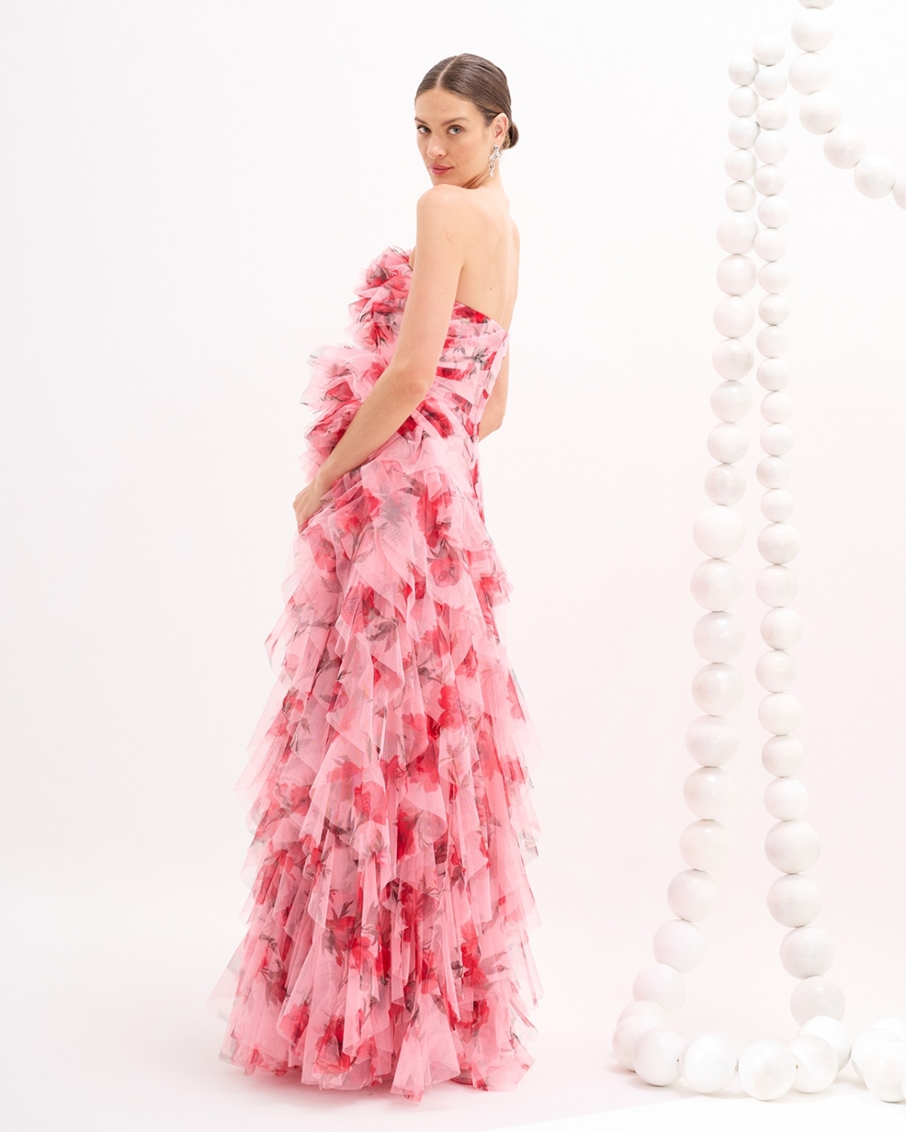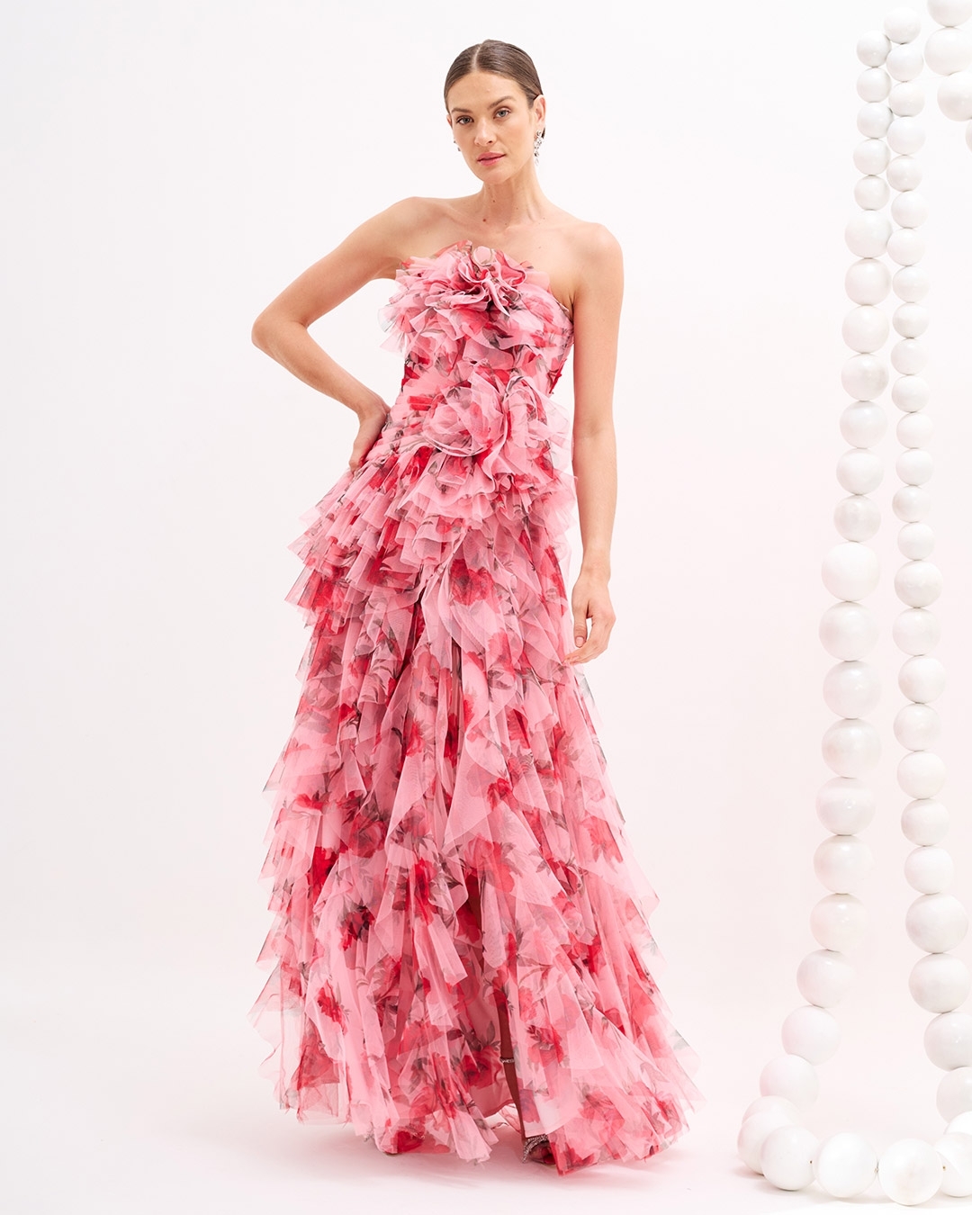 Vestido de festa em tule com saia de babados