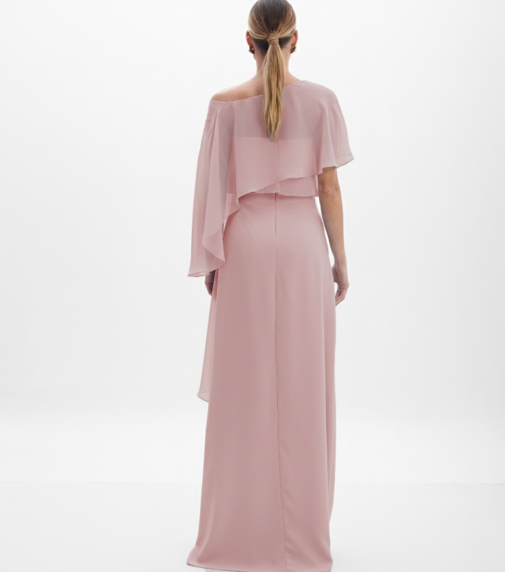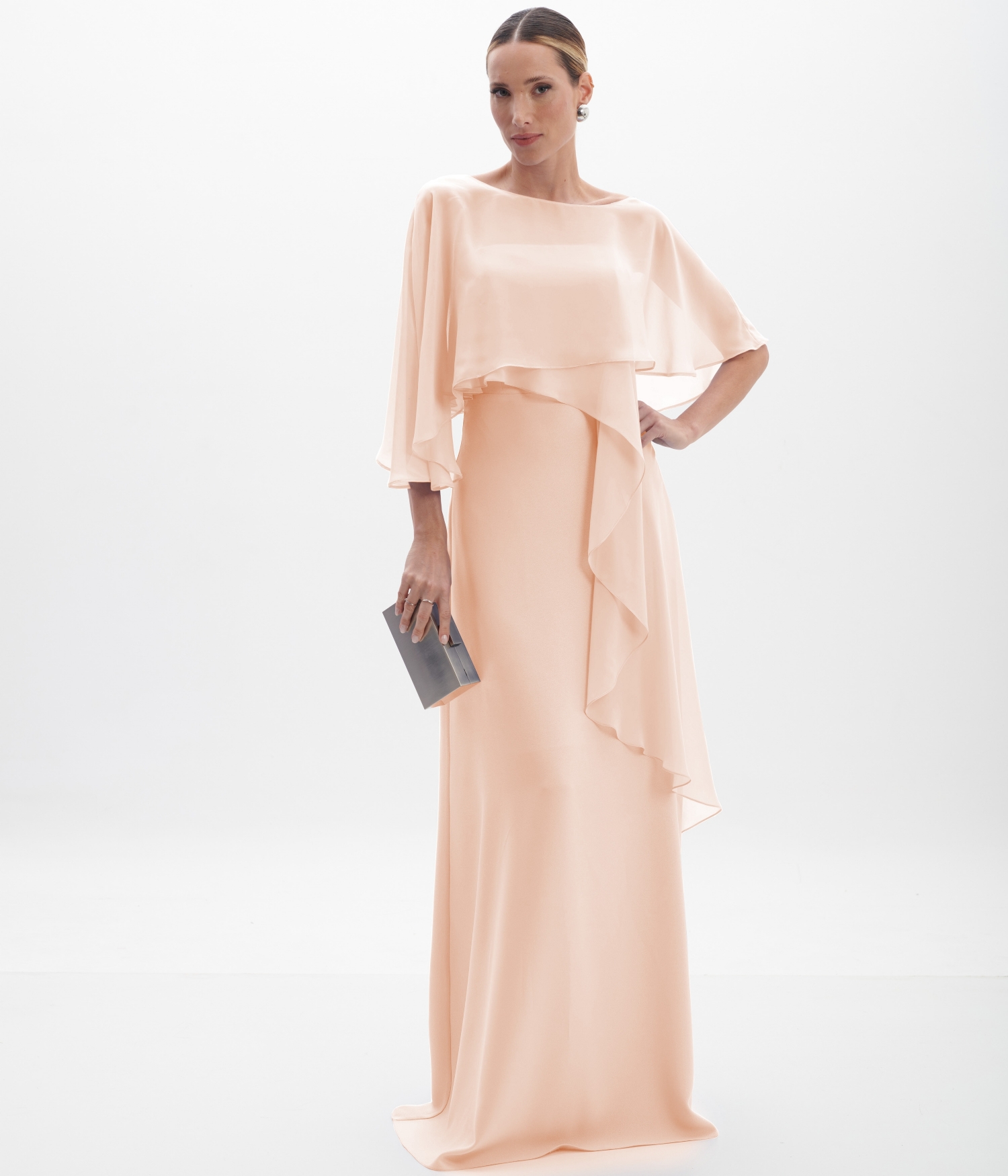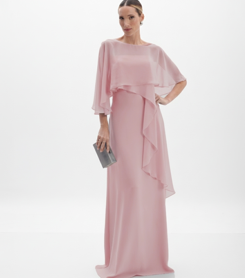 Vestido confeccionada em crepe acetinado leve/ musseline, longo em tecido fluidosem alças, o charme da capa longa deixa o modelo ainda mais exclusivo deixando um visual elegante. Por se tratar de um tecido delicado, é necessário cuidado ao lavar.
