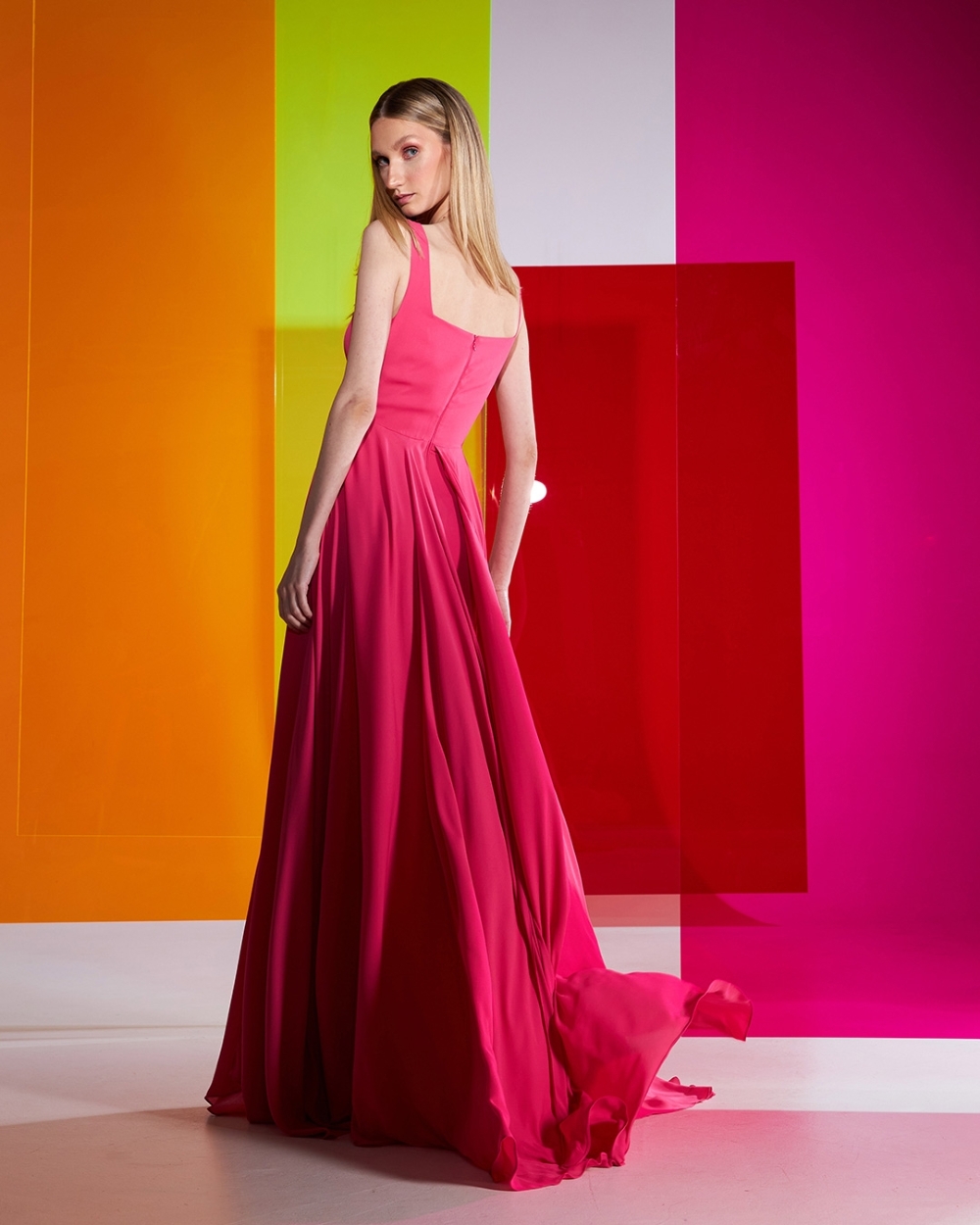 Vestido de festa fluido com decote quadrado e saias sobrepostas
