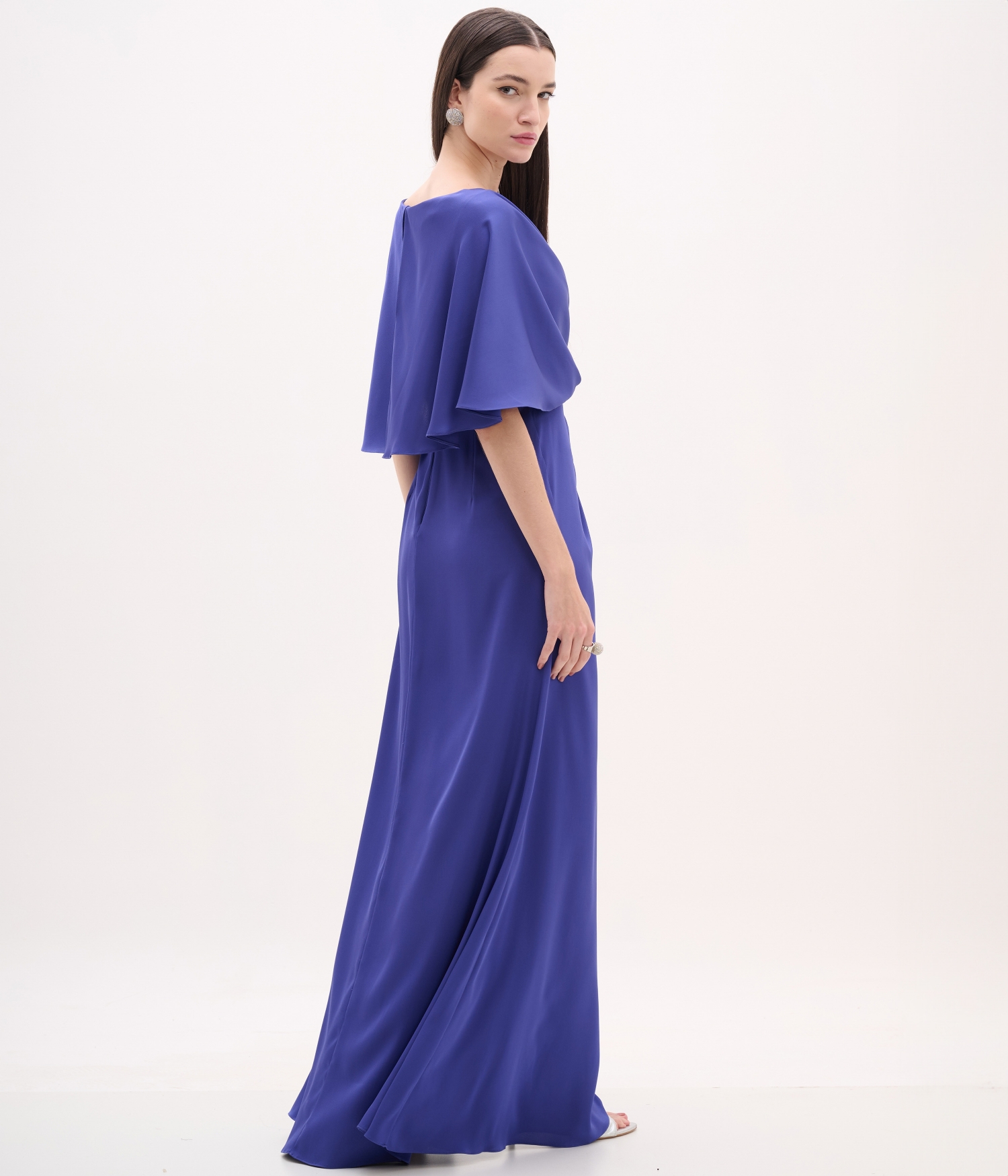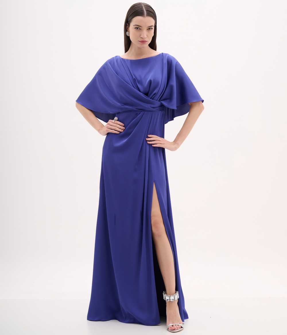 Vestido de festa longo azul em cetim com drapeado frontal e fenda lateral