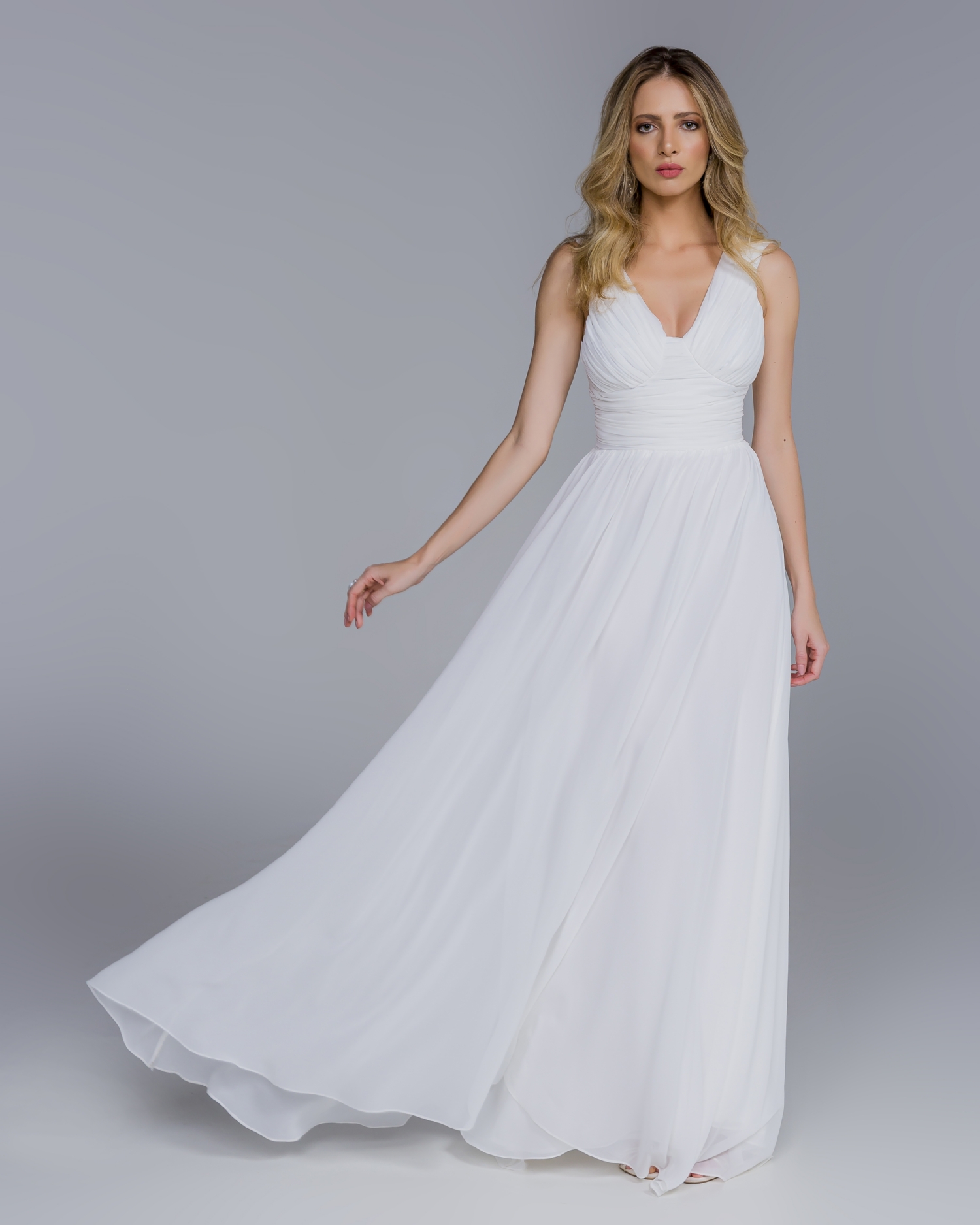 Este vestido de festa longo branco é uma escolha elegante e atemporal para ocasiões especiais. Com decote V e caimento fluido, o modelo destaca a silhueta com leveza e sofisticação. Ideal para quem busca um vestido para casamento, seja como madrinha, mãe da noiva ou convidada de destaque.