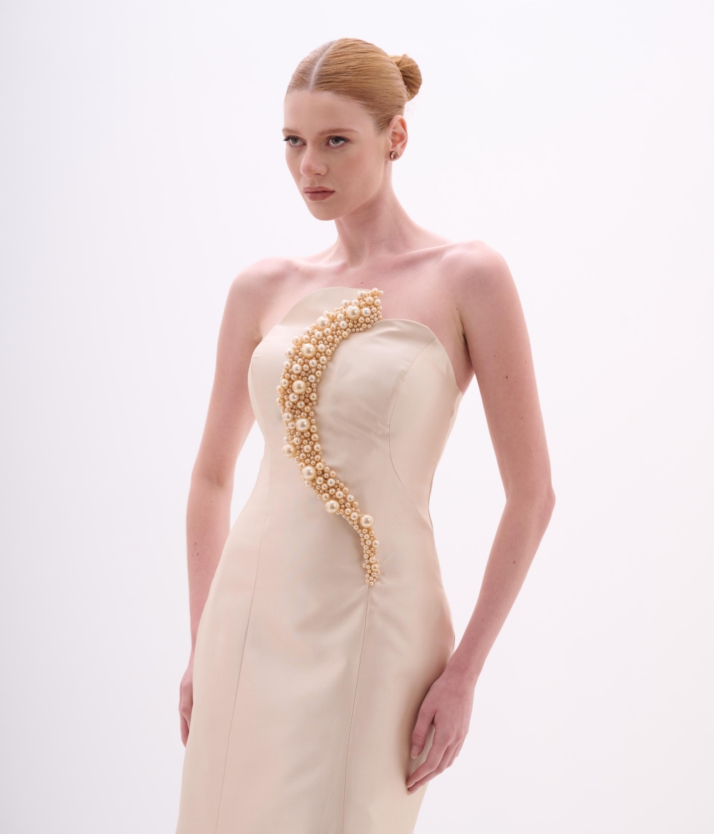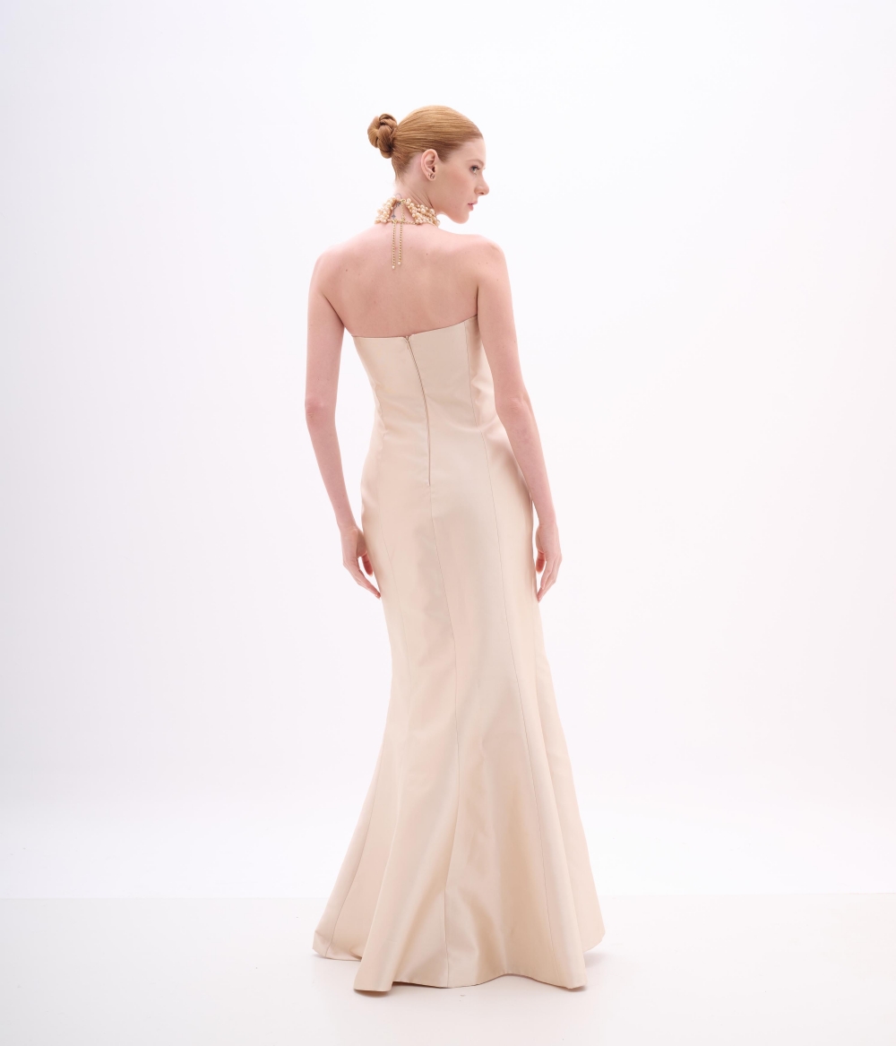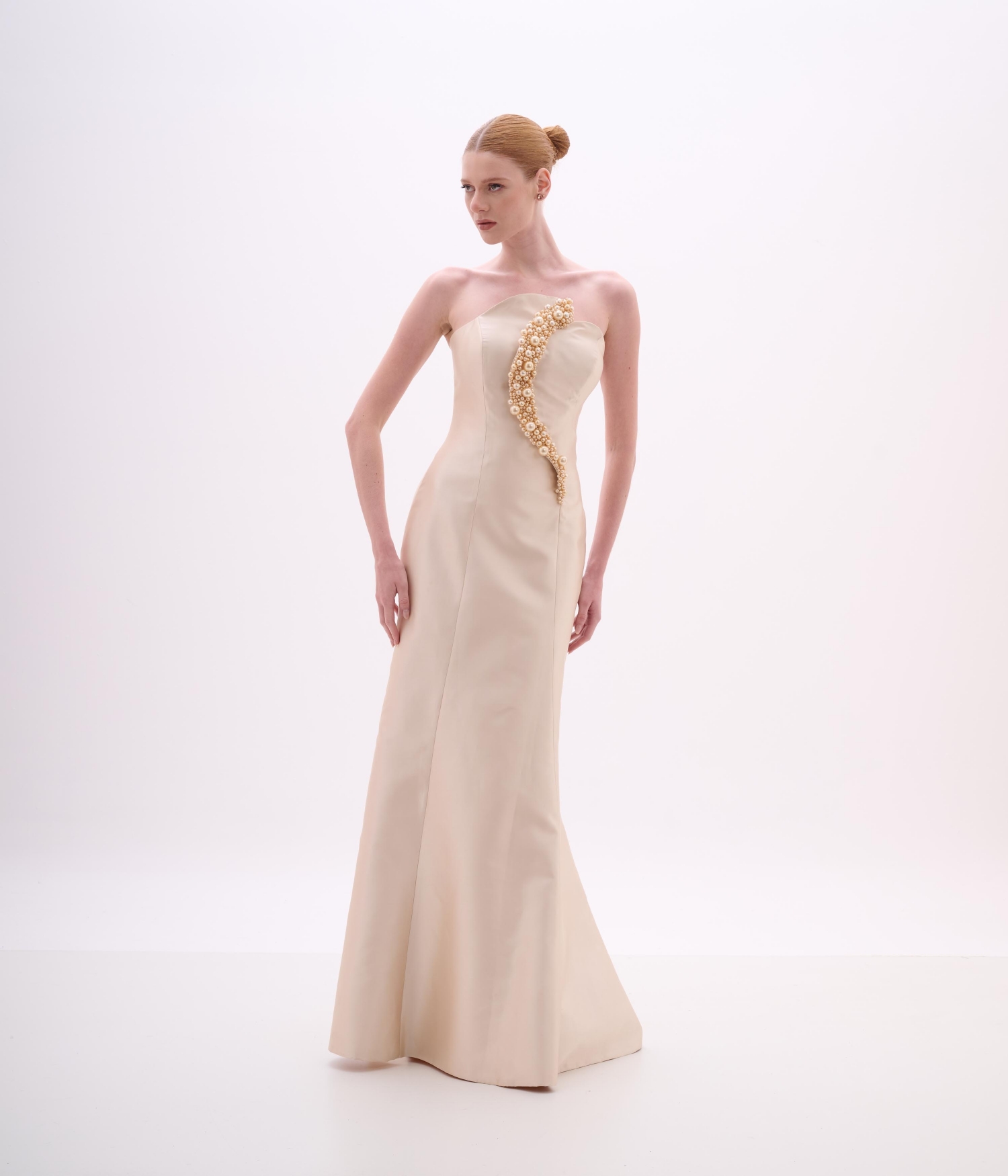 Este vestido de festa longo em tom areia combina a sofisticação do zibeline com a delicadeza da pérola, resultando em uma peça elegante e feminina. Ideal para ocasiões formais e cerimônias especiais, o modelo destaca-se pelo trabalho artesanal nas aplicações e pelo caimento refinado.