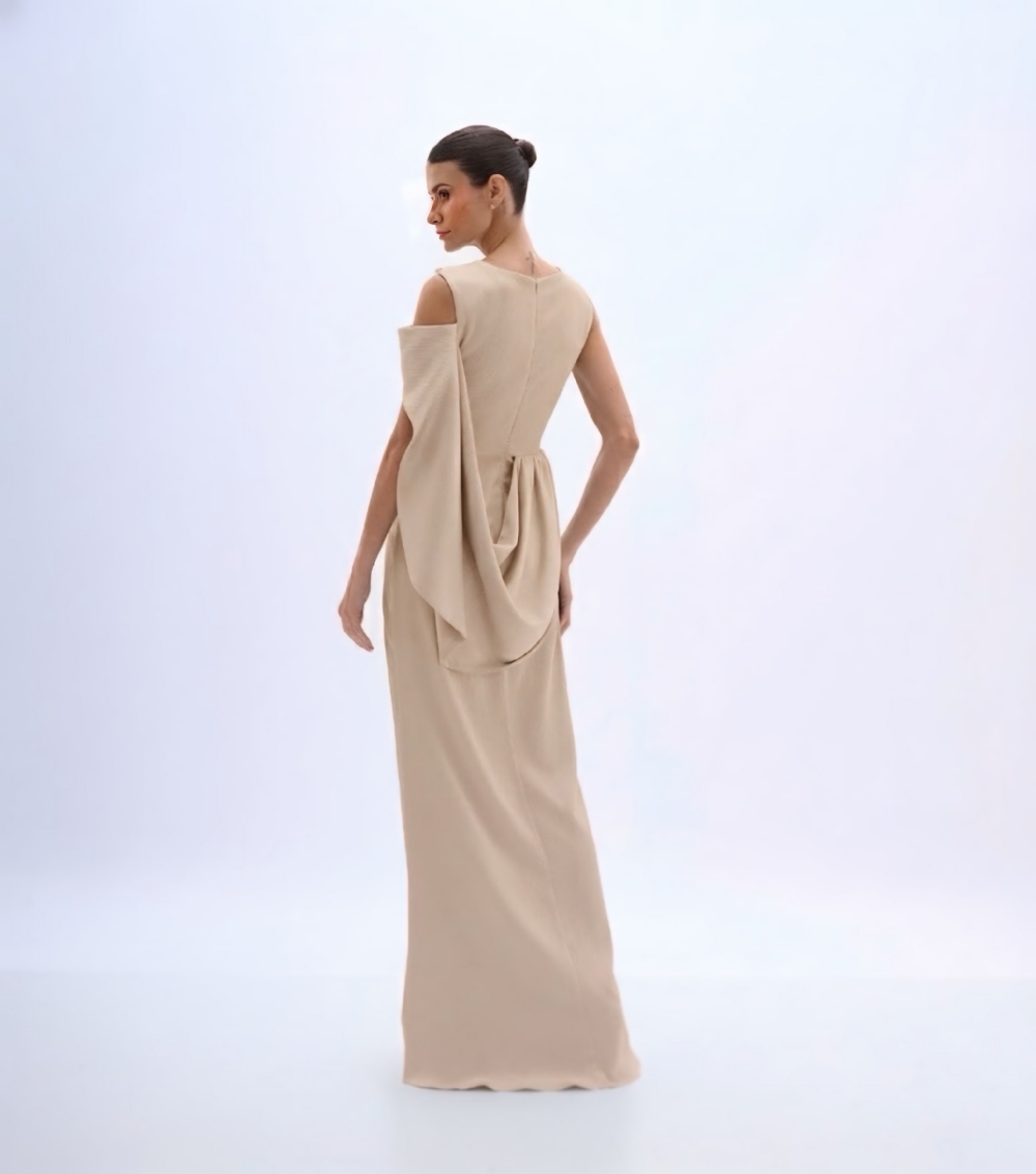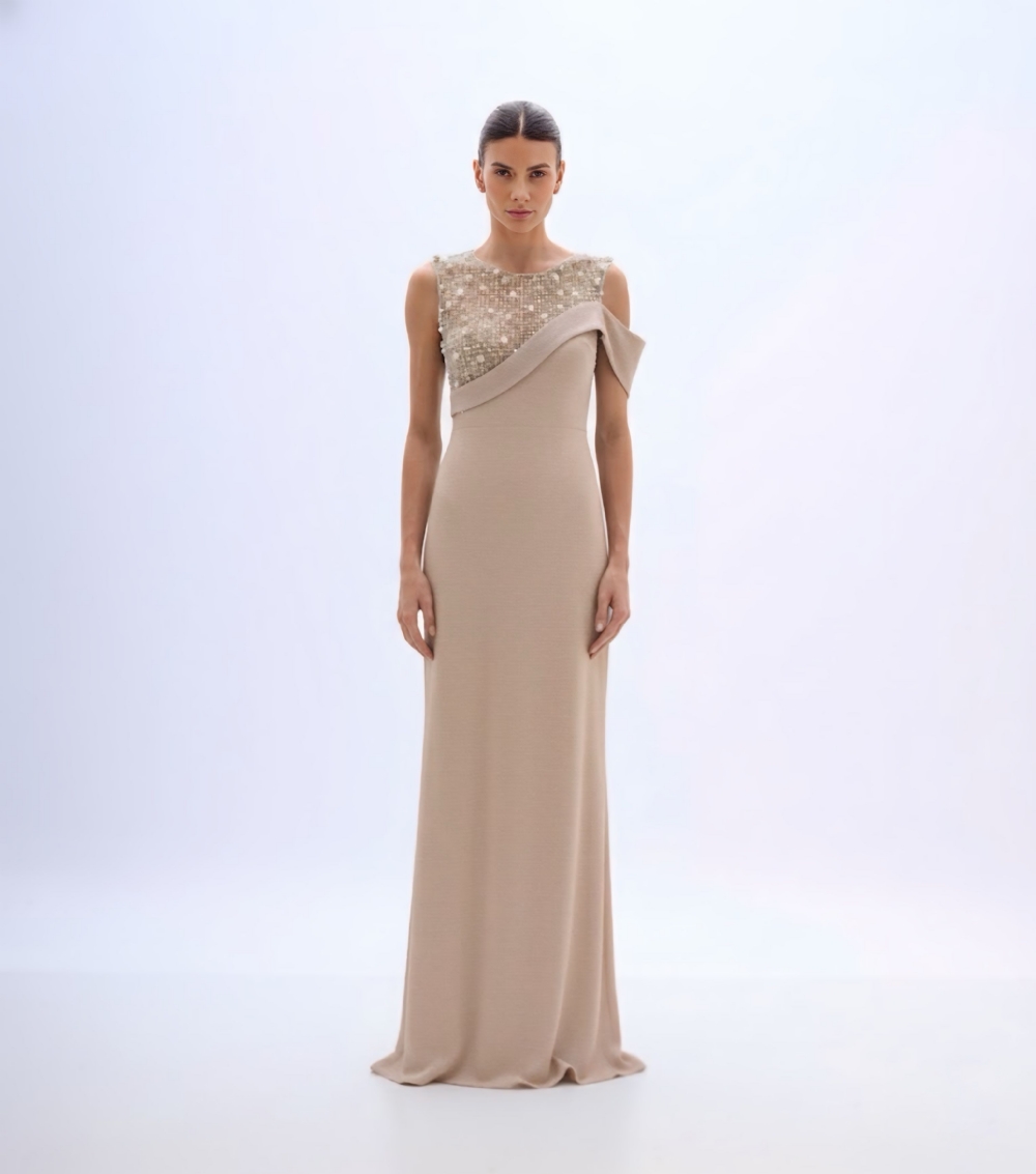 Vestido de festa longo em cetim plissê com bordado de pérolas
