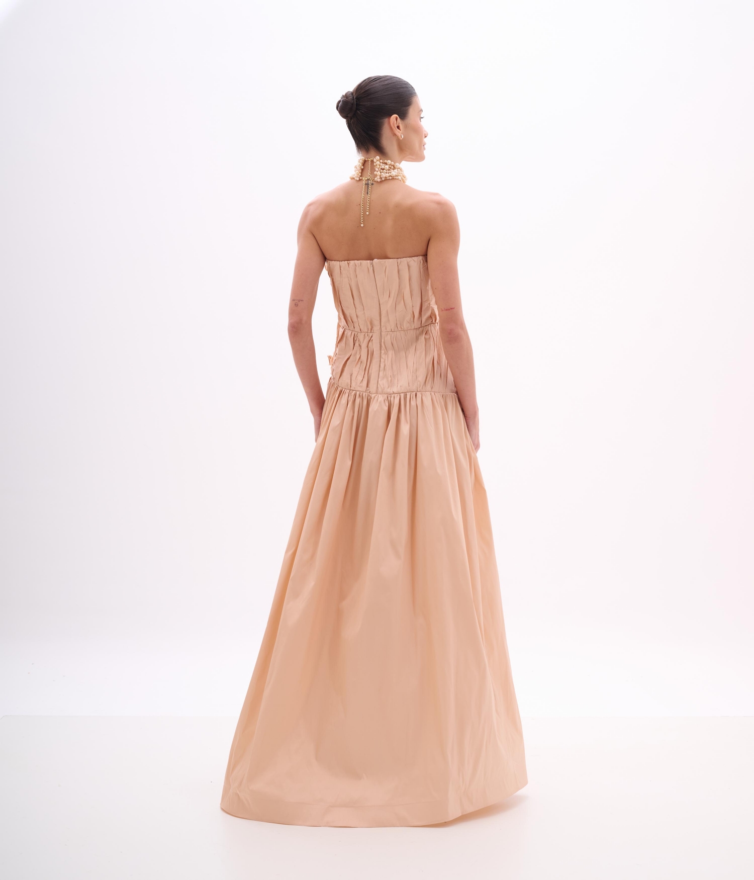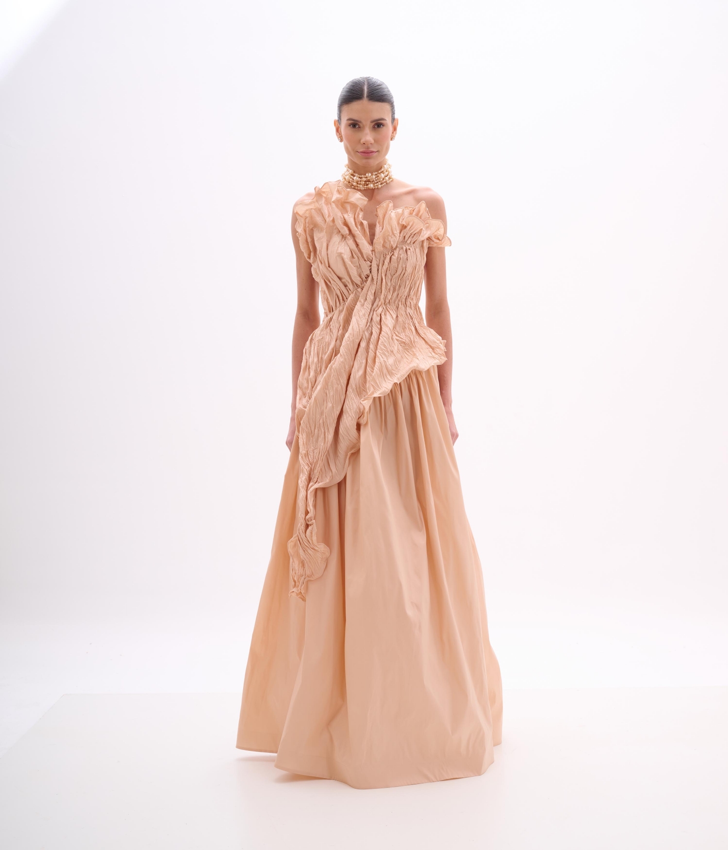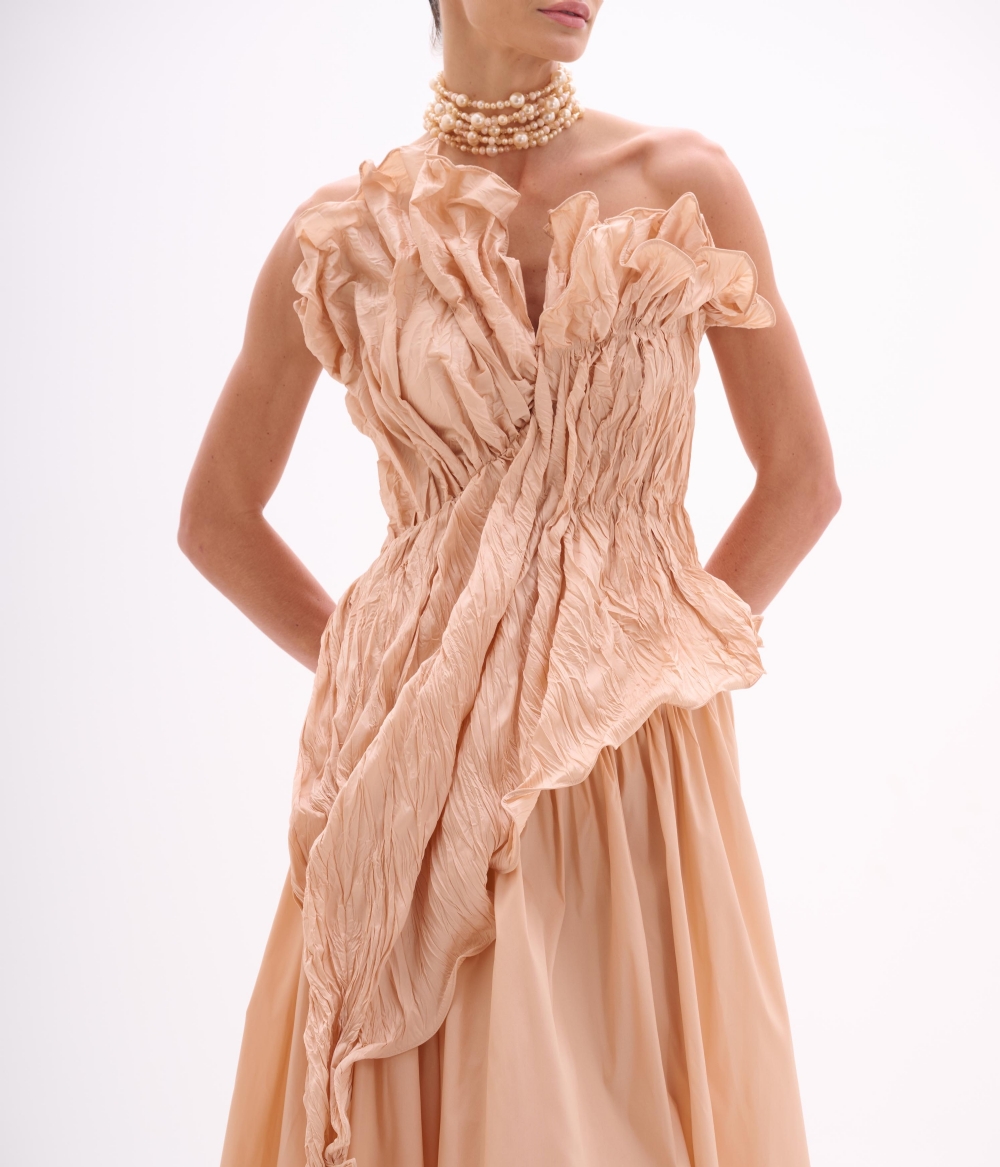 Vestido de festa longo em tafetá shell com drapeado escultural