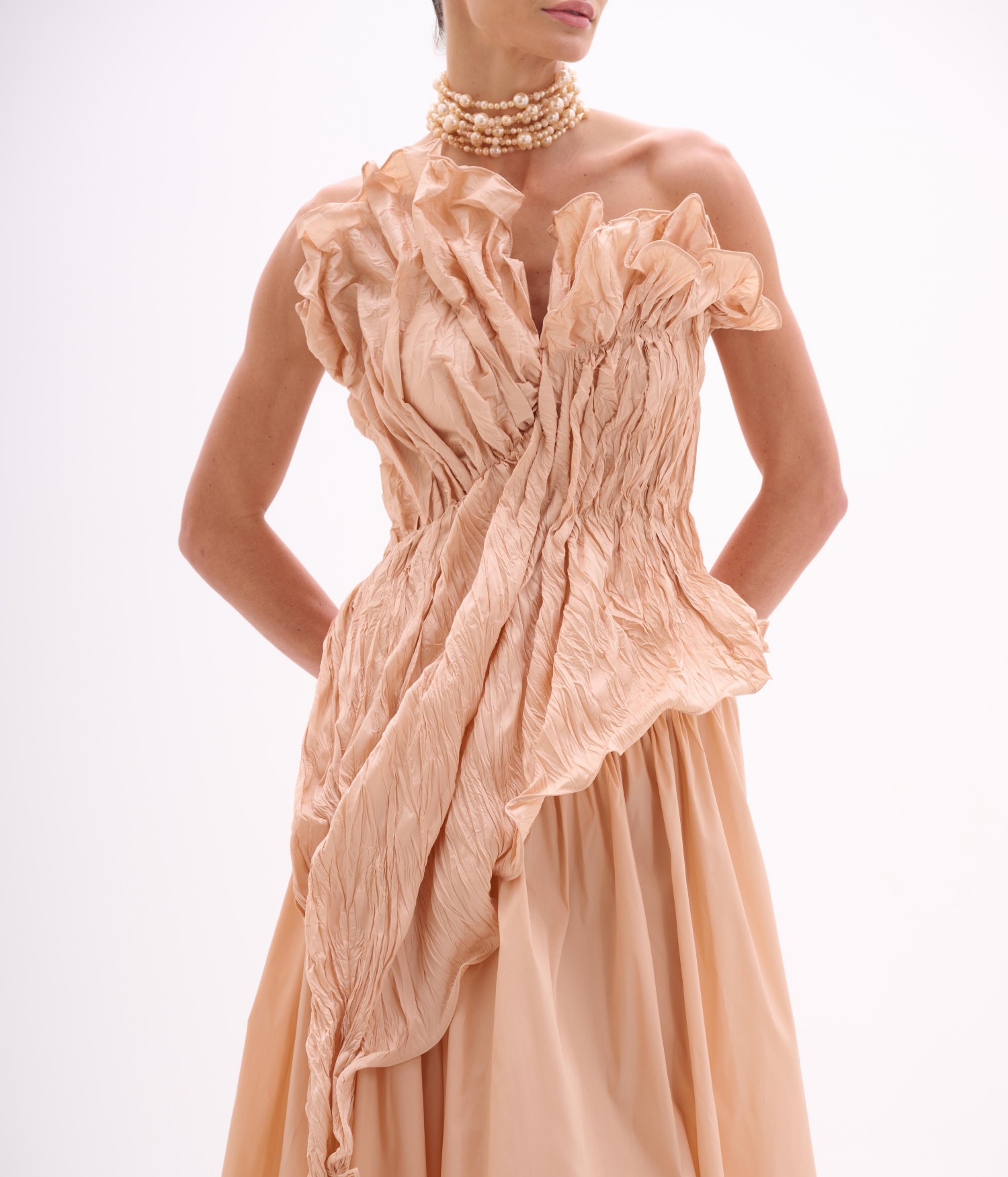 • Vestido longo com busto assimétrico e drapeado escultural.