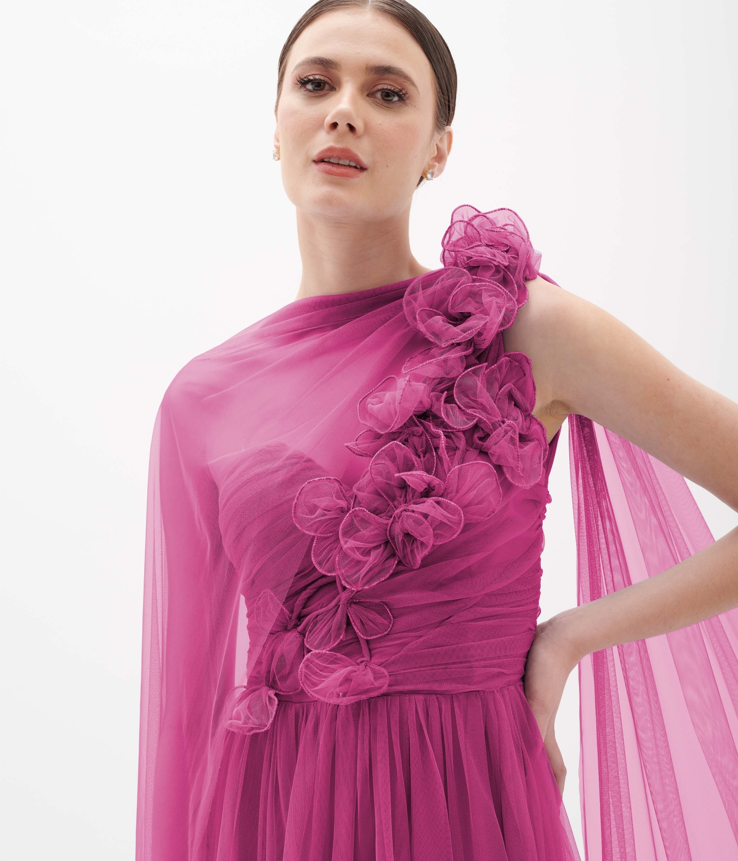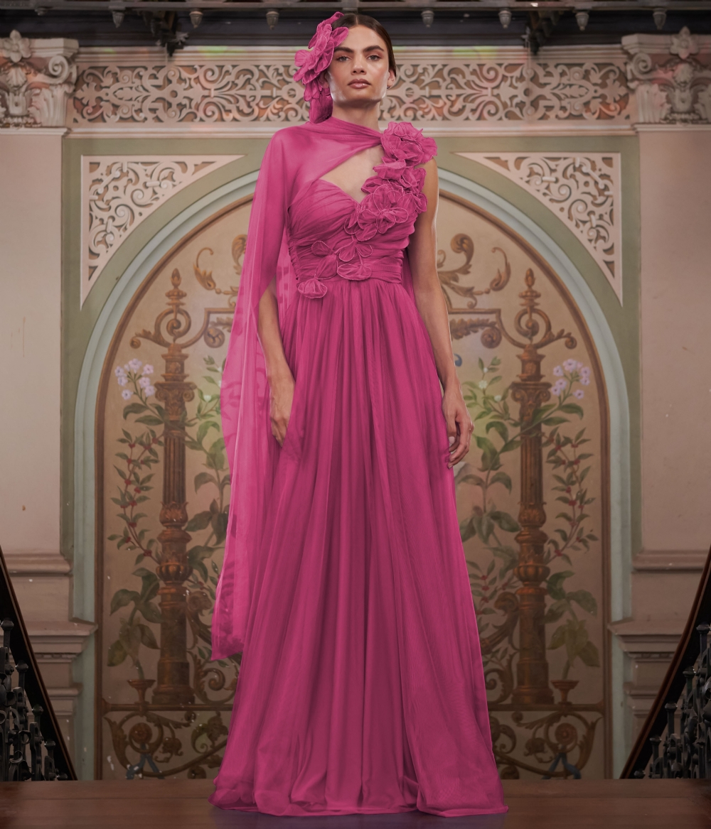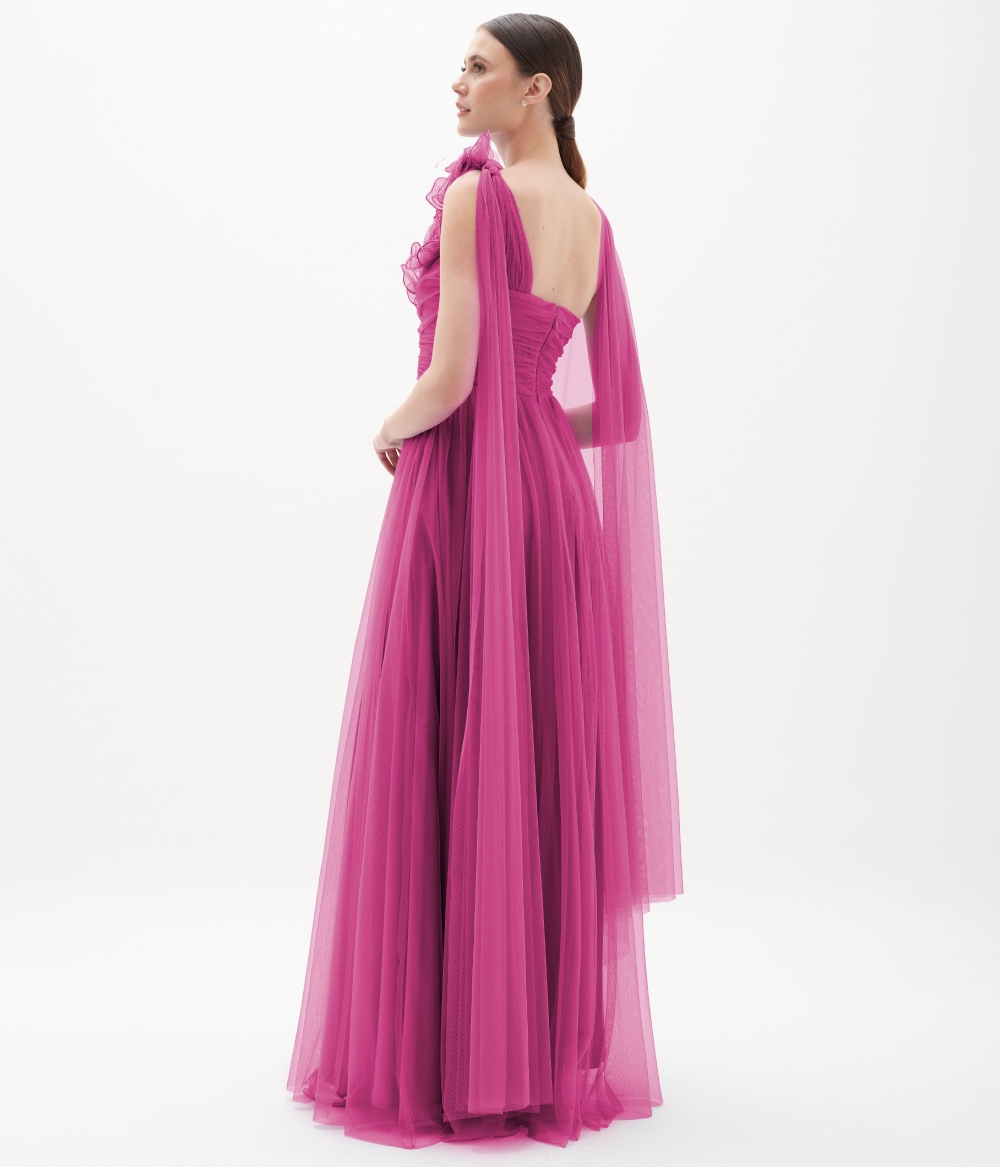 Vestido de festa Longo em tule de um ombro com broche ref.VL8884