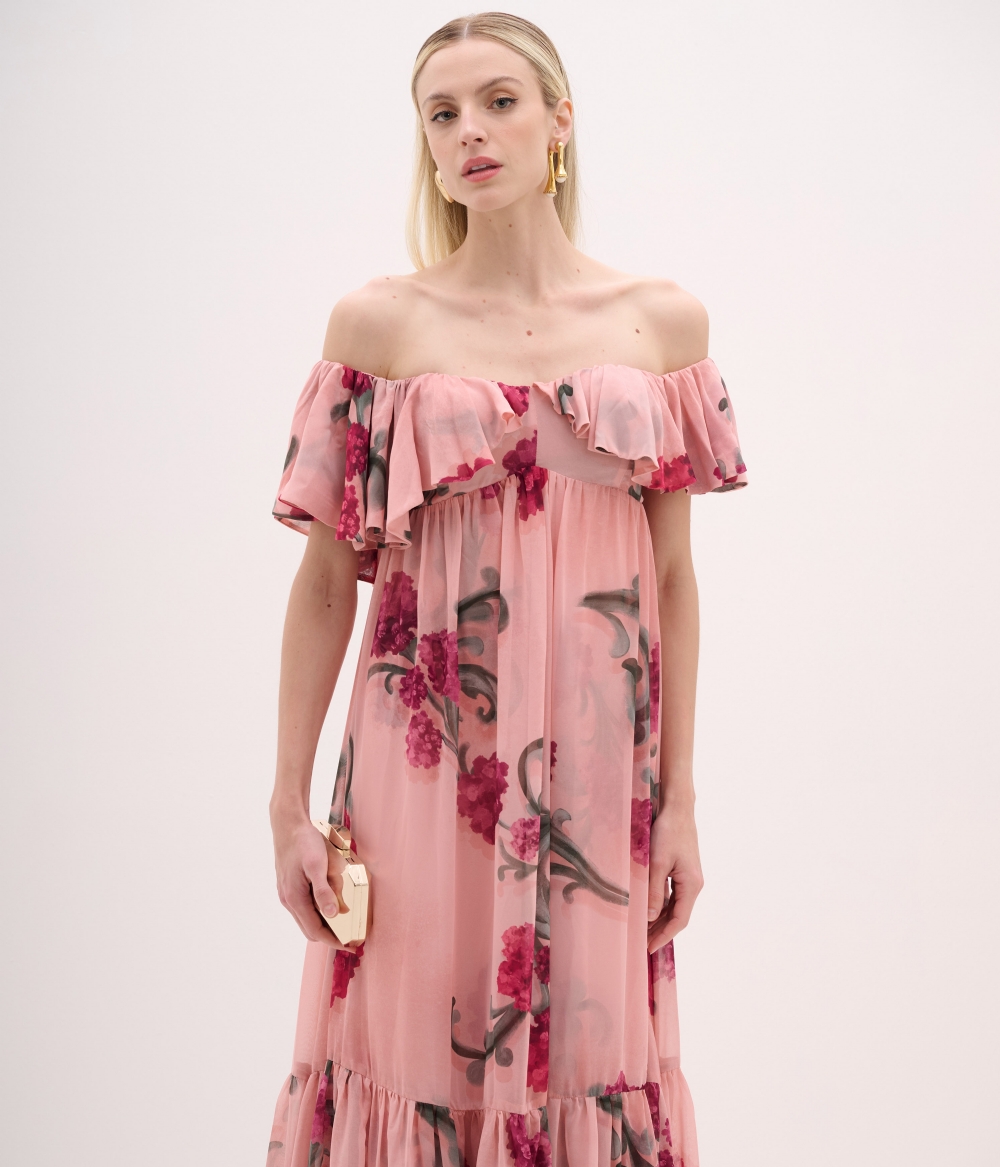 Vestido de festa longo com estampa floral em tons de rosa e vinho, que combina leveza, romantismo e sofisticação. O modelo apresenta decote ombro a ombro com babado fluido, conferindo um ar delicado e feminino. A saia ampla com recortes franzidos cria um movimento gracioso, perfeito para ocasiões elegantes ao ar livre ou celebrações diurnas.