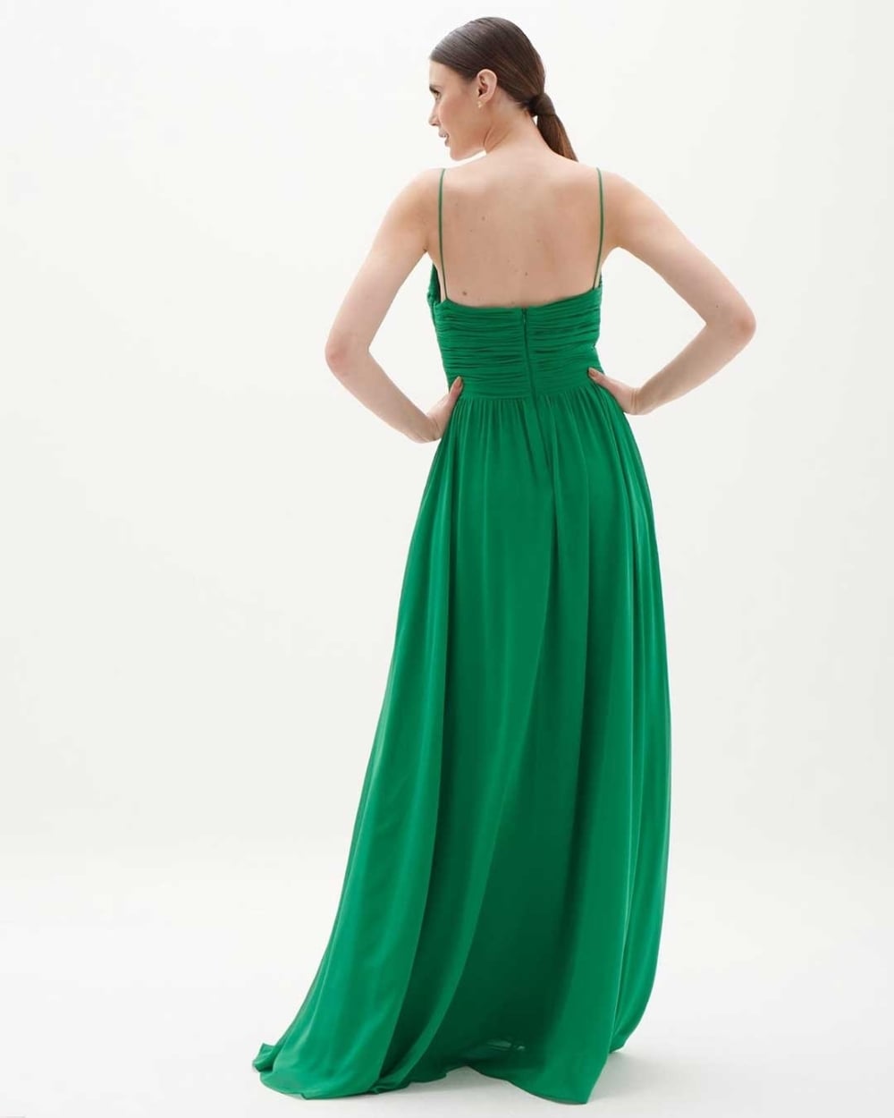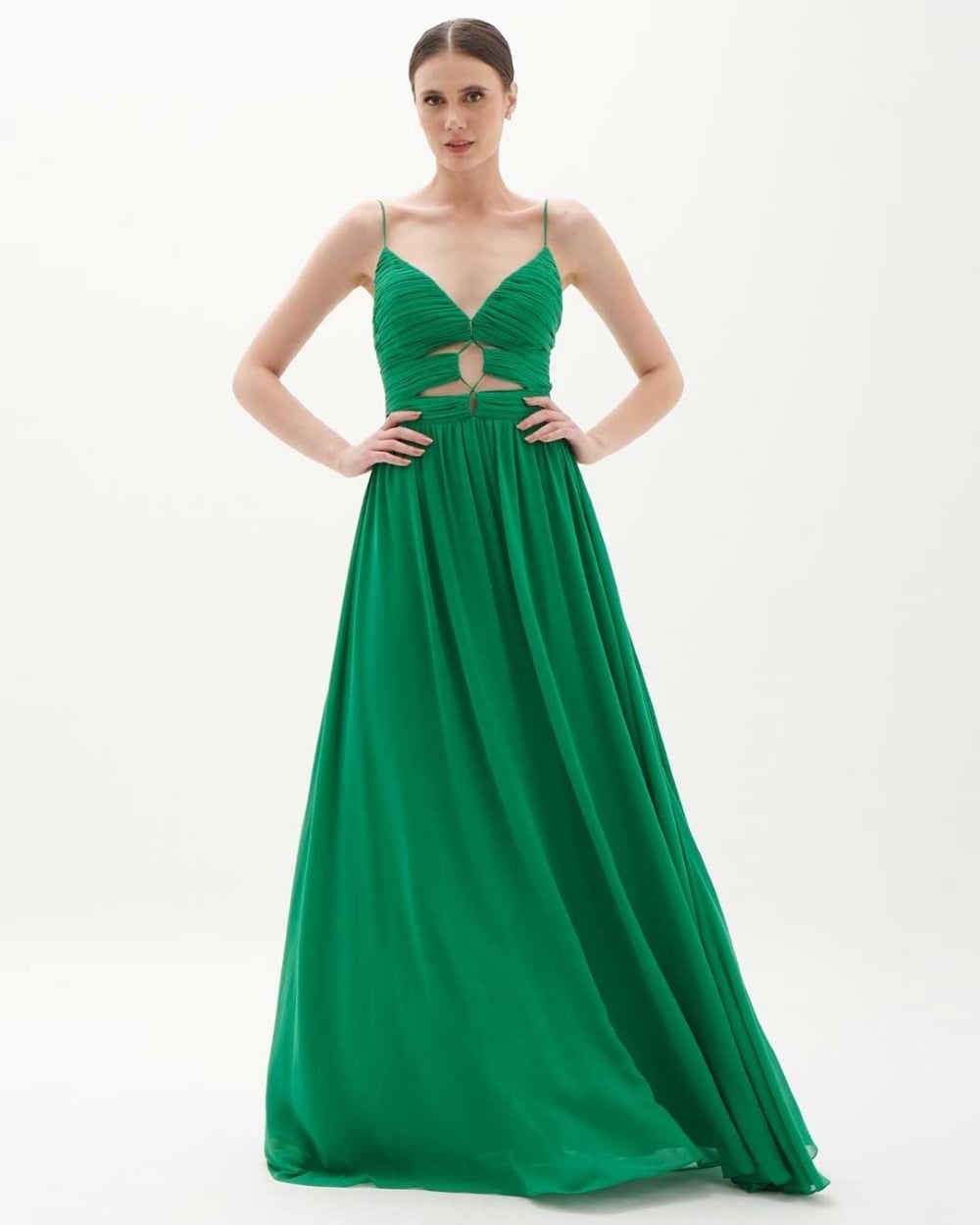 Vestido de festa longo fluido alça detalhes