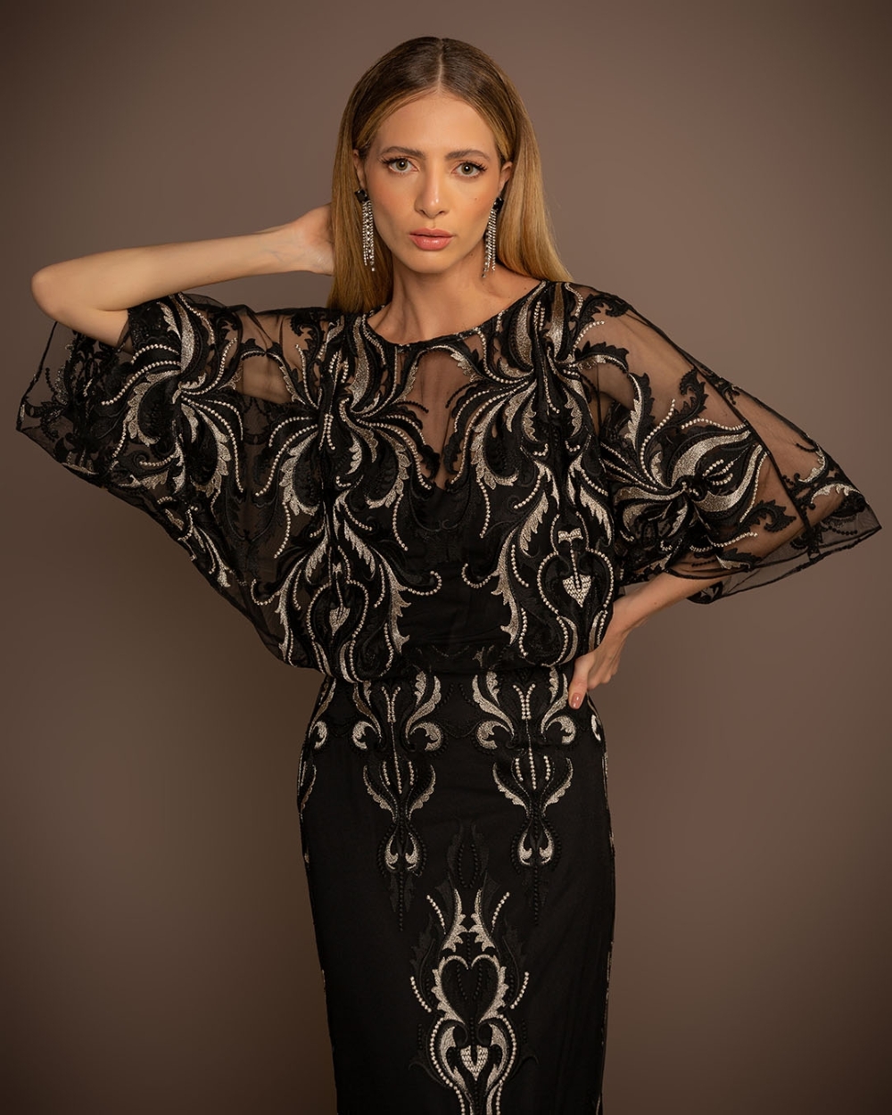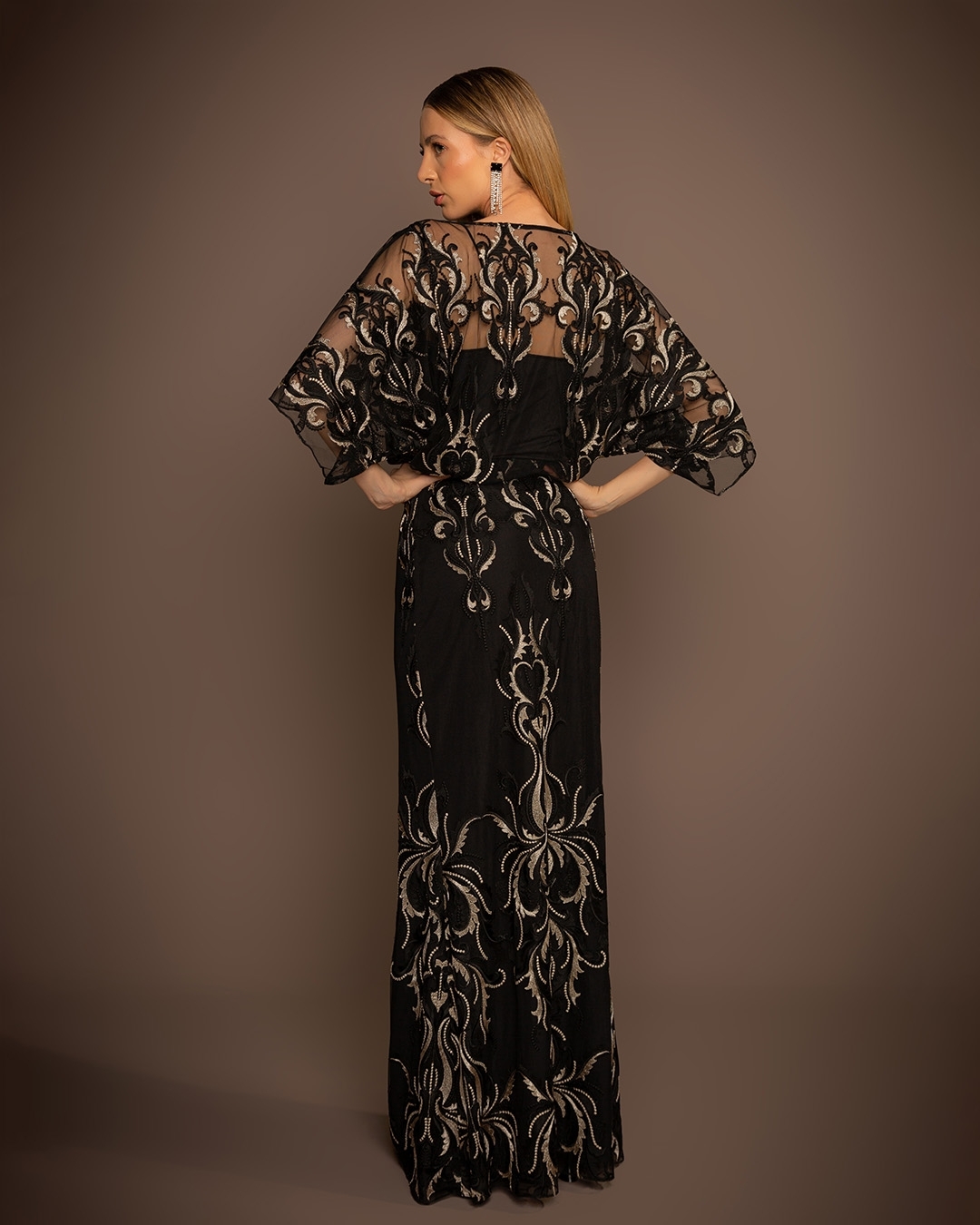 Vestido de festa longo kafta com renda