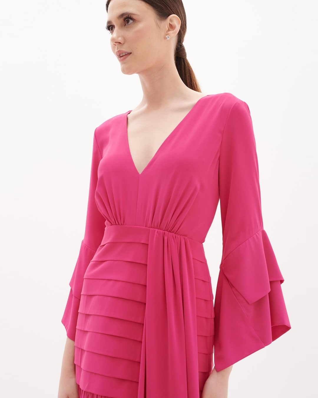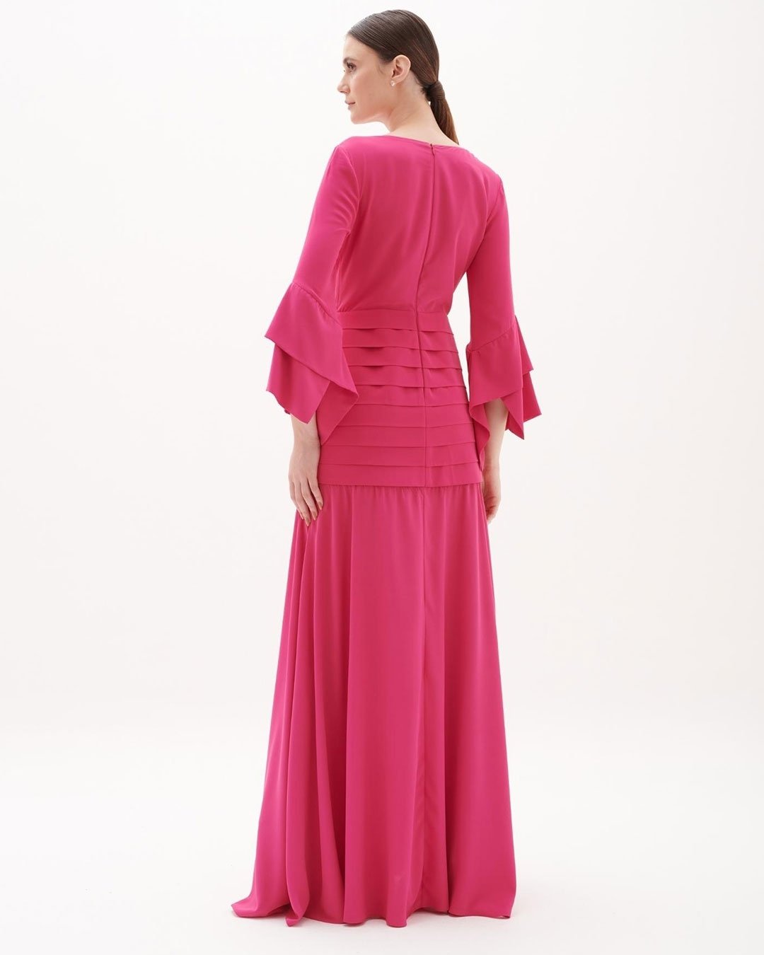 Vestido de festa longo pink em crepe com decote V e mangas flare
