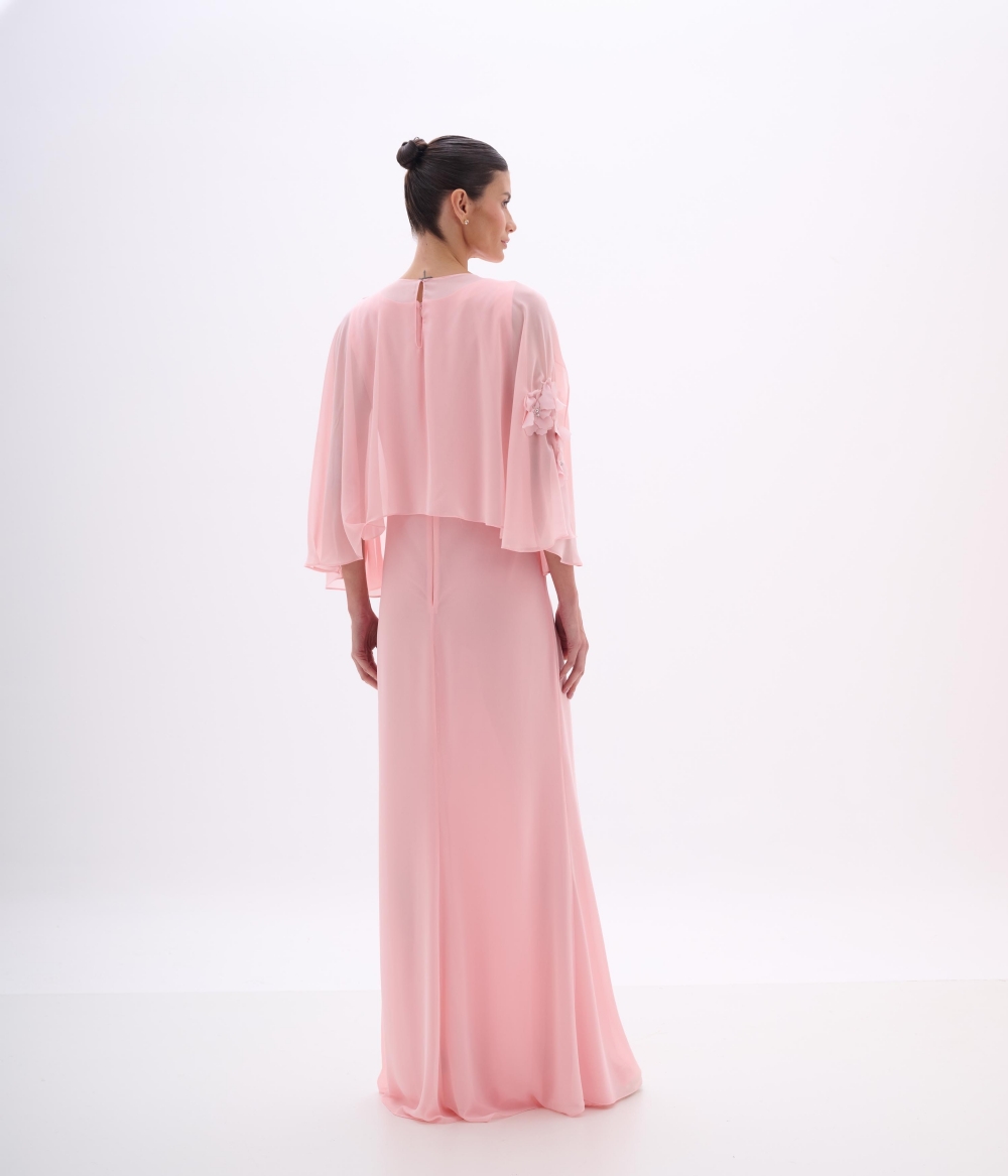 Vestido de festa longo rosa com capa e aplicações florais 3D