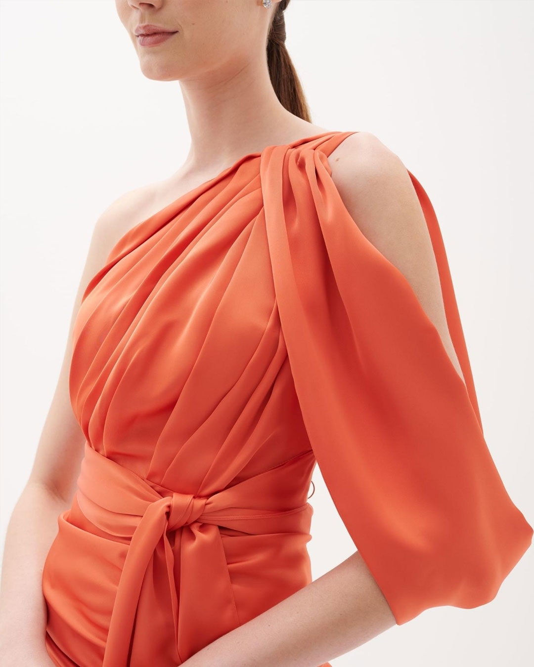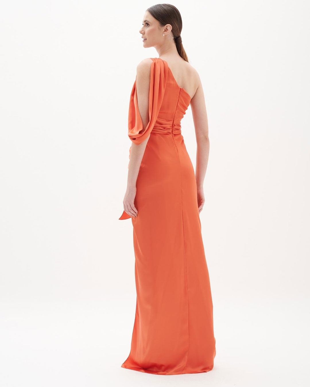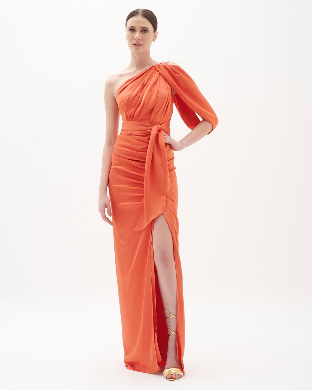 Vestido de festa longo saia justa detalhes ombro drapeado e faixa