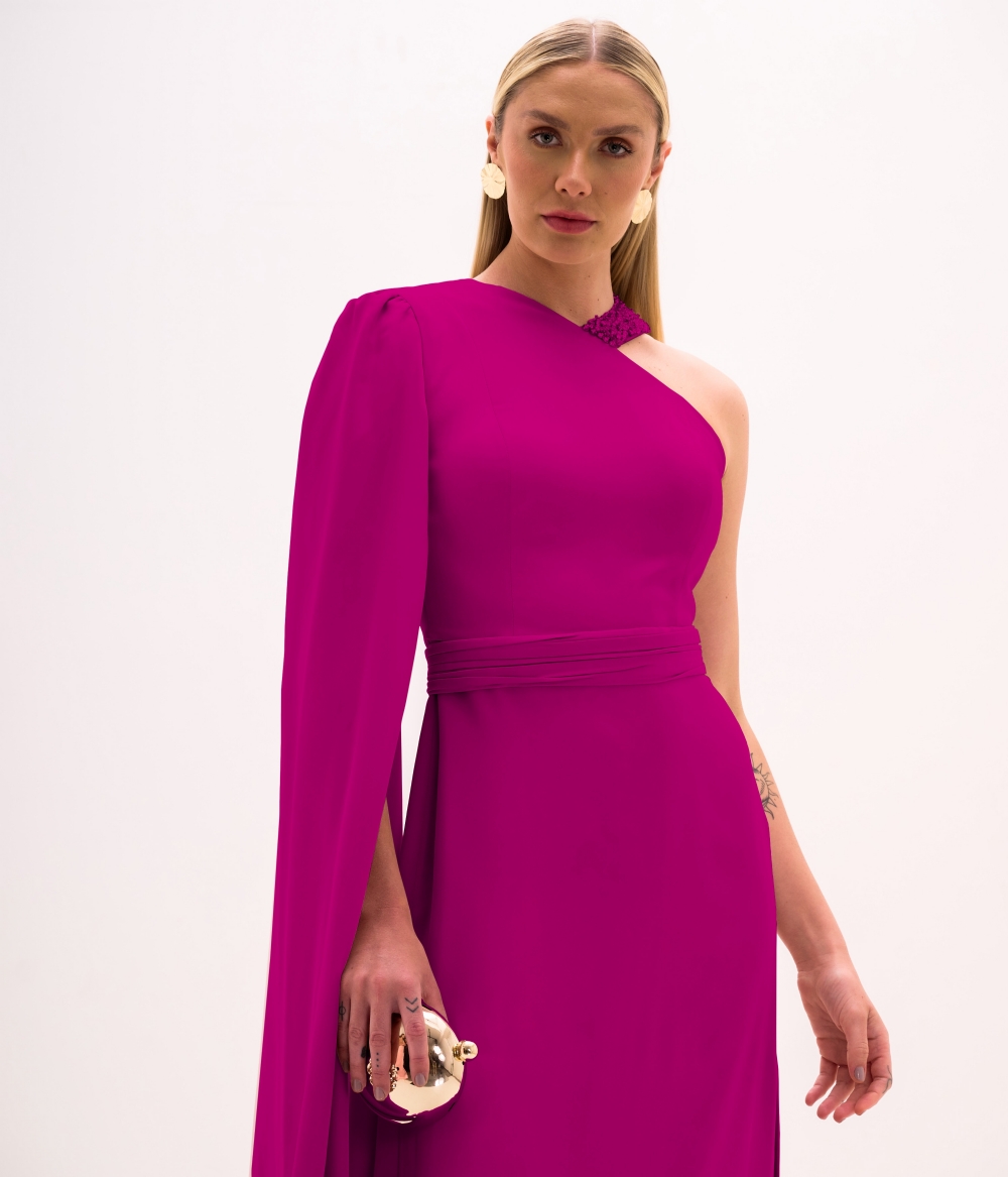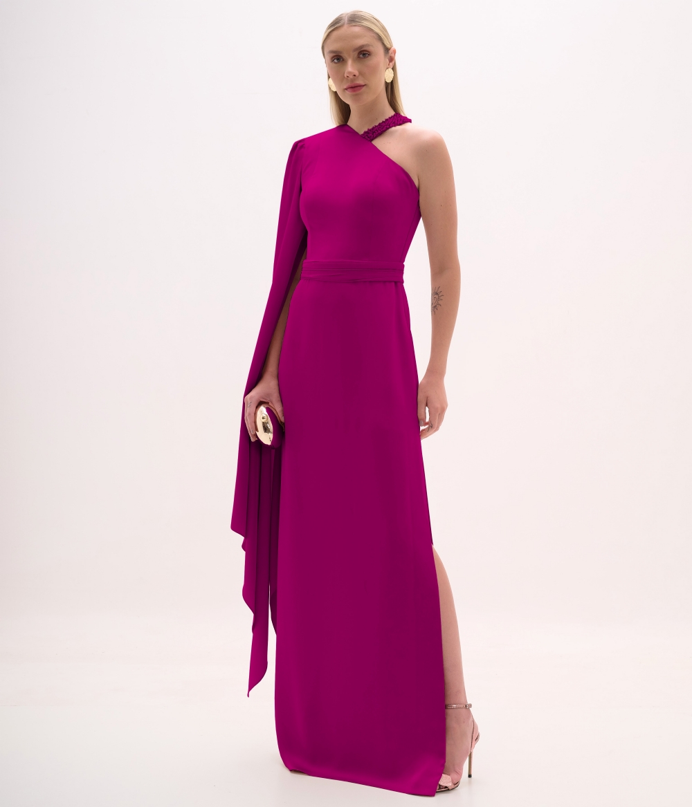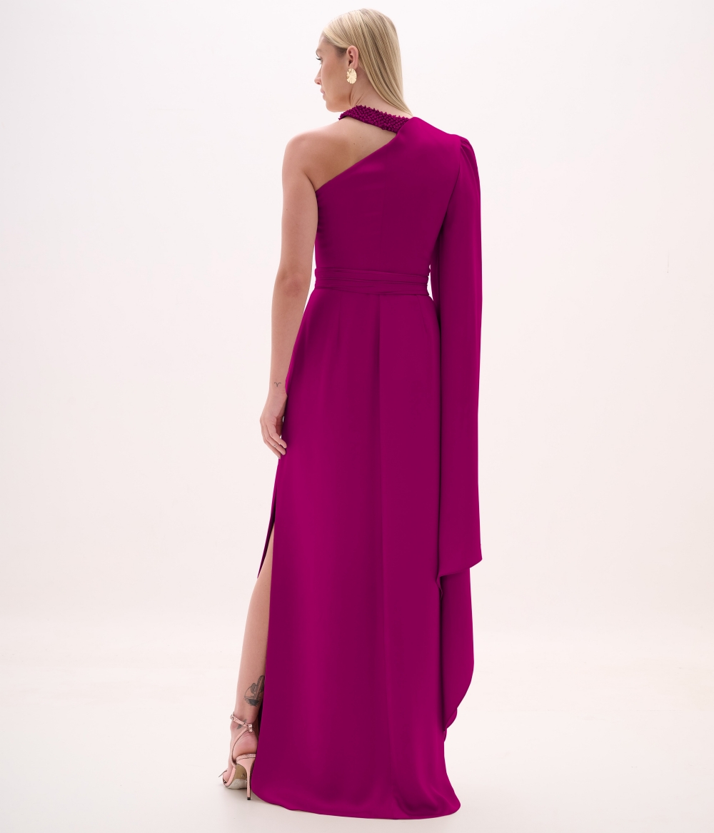 Vestido de festa longo um ombro só com gola bordada