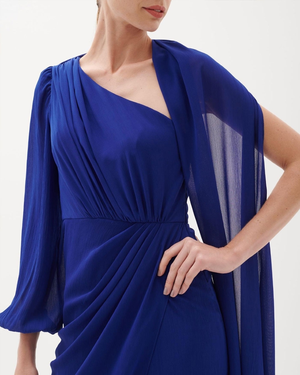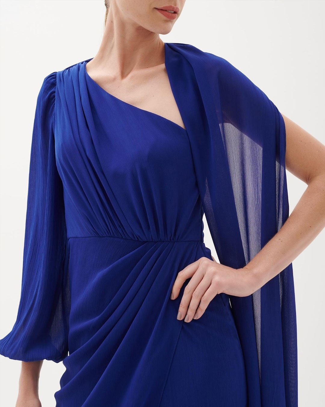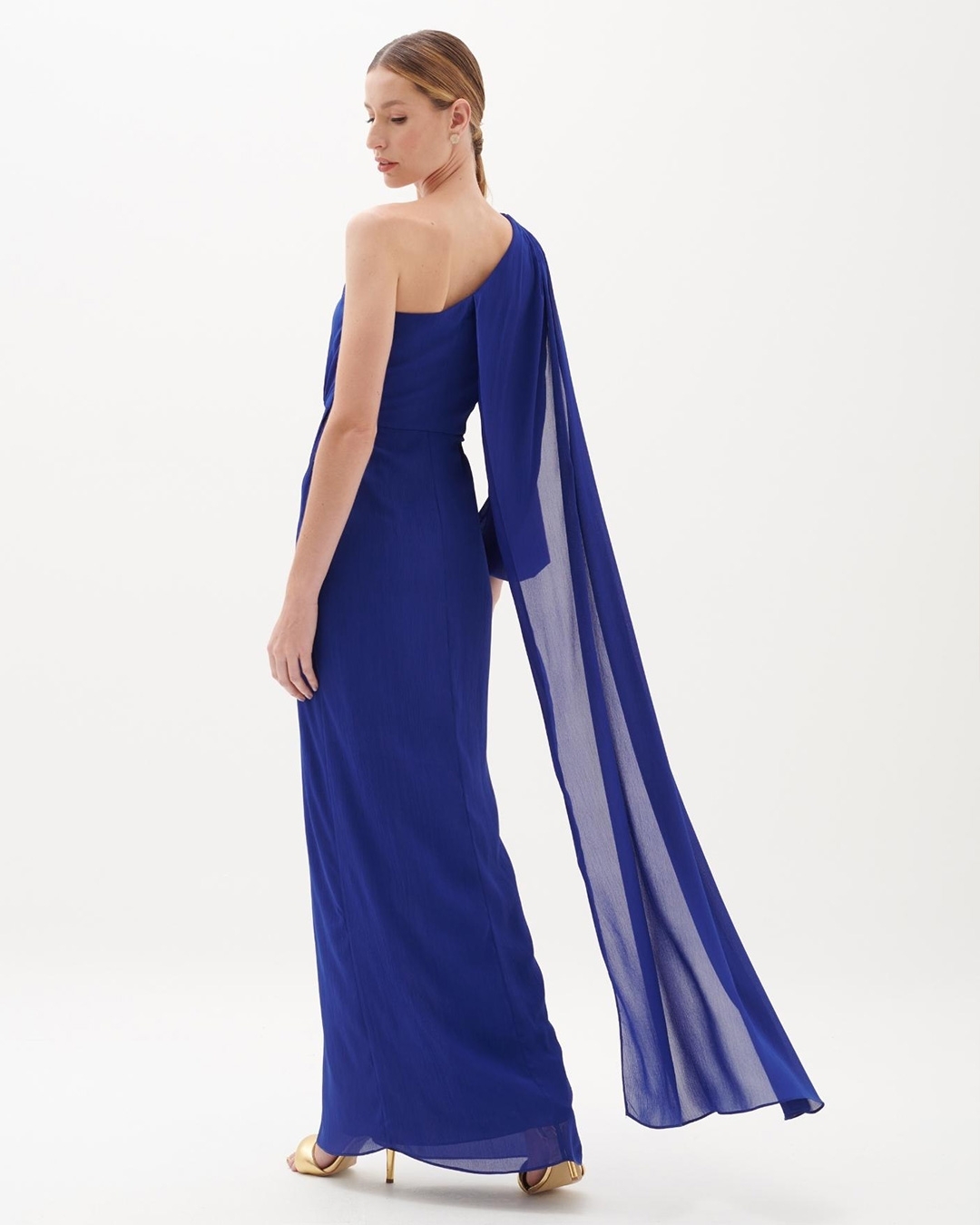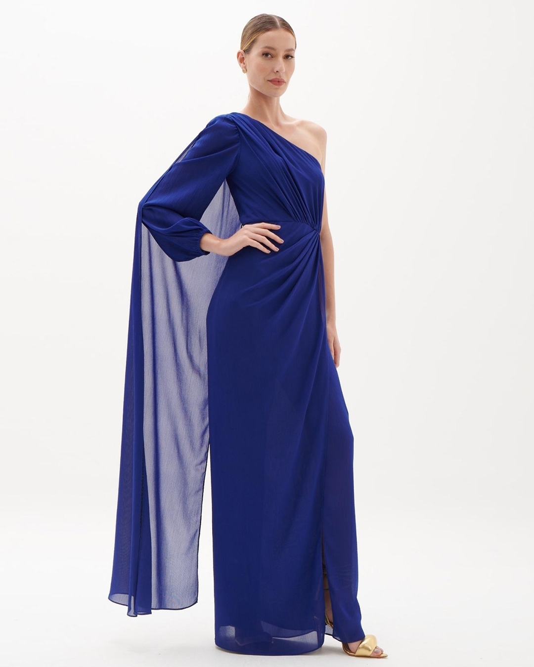 Vestido de festa longo uma manga comprida e capa fluida e transpassado