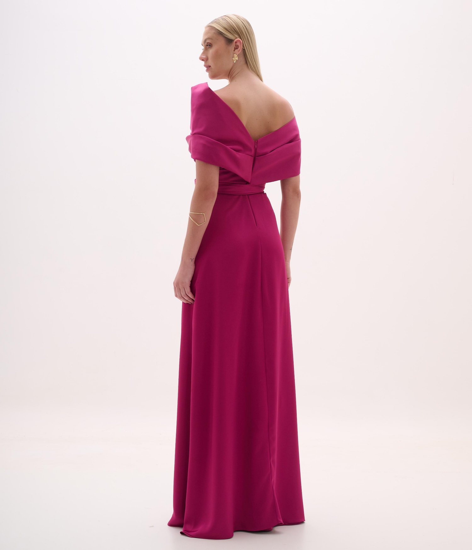 Este vestido de festa longo em tom uva destaca-se pelo caimento fluido e pelo trabalho de drapeados no corpo, criando um visual sofisticado e atemporal. O modelo ombro a ombro com sobreposição assimétrica valoriza o colo e traz elegância moderna para ocasiões formais.