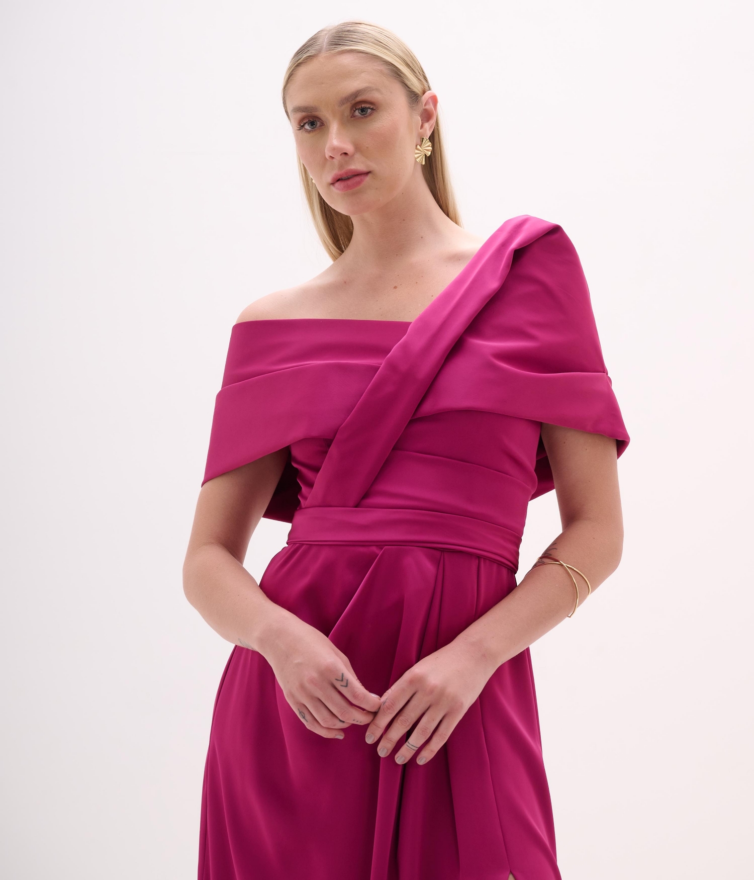 Decote ombro a ombro com sobreposição e drapeados estruturados
