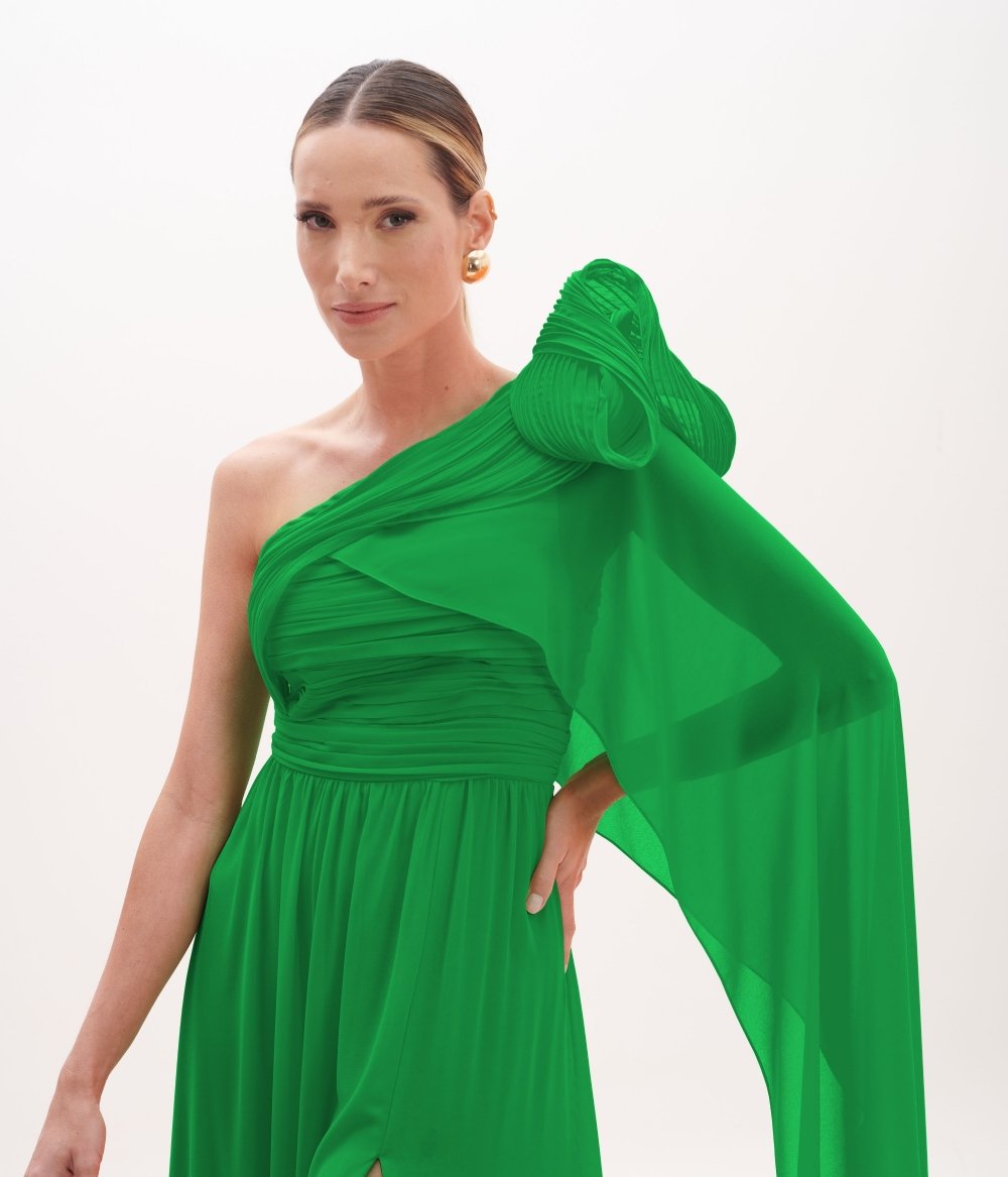 Vestido de festa longo verde com um ombro só e fenda frontal
