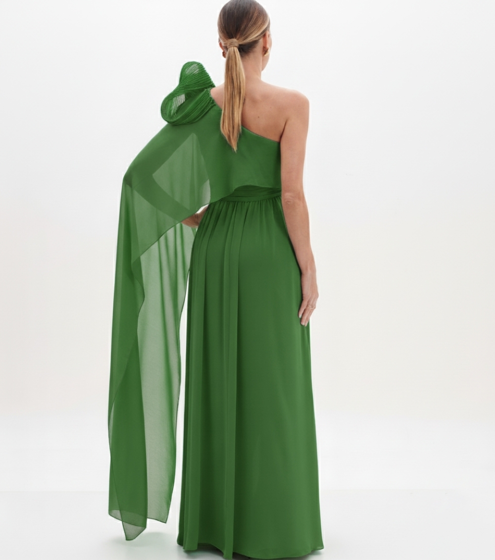 Vestido de festa longo verde com um ombro só e fenda frontal