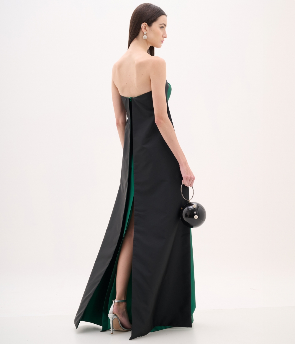 Este vestido de festa longo em tom verde esmeralda é uma opção elegante e sofisticada para eventos formais. O design minimalista com recortes verticais cria um visual alongado e refinado, enquanto o decote tomara que caia valoriza o colo com equilíbrio e modernidade, resultando em um vestido elegante de presença marcante.