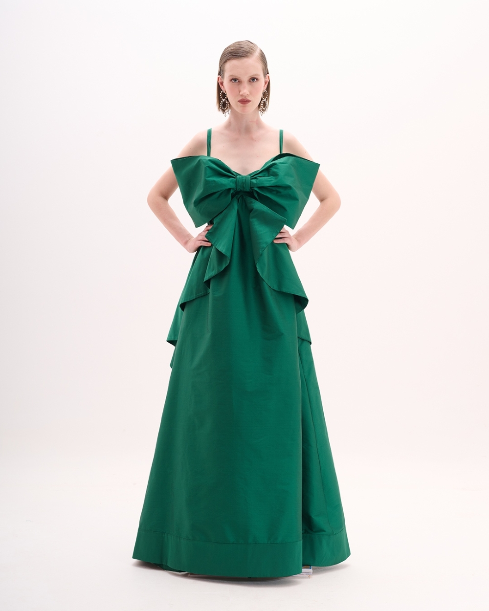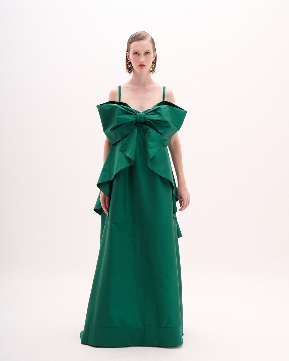 Vestido de festa imponente em tom de verde esmeralda, que combina intensidade e sofisticação. O modelo apresenta silhueta fluida e feminina, com alças finas e decote reto, valorizando o colo com naturalidade. O destaque fica por conta do laço estruturado frontal, que cria uma sobreposição escultural sobre o busto e a saia, adicionando volume e movimento à composição.