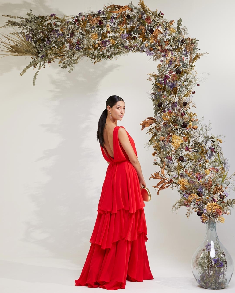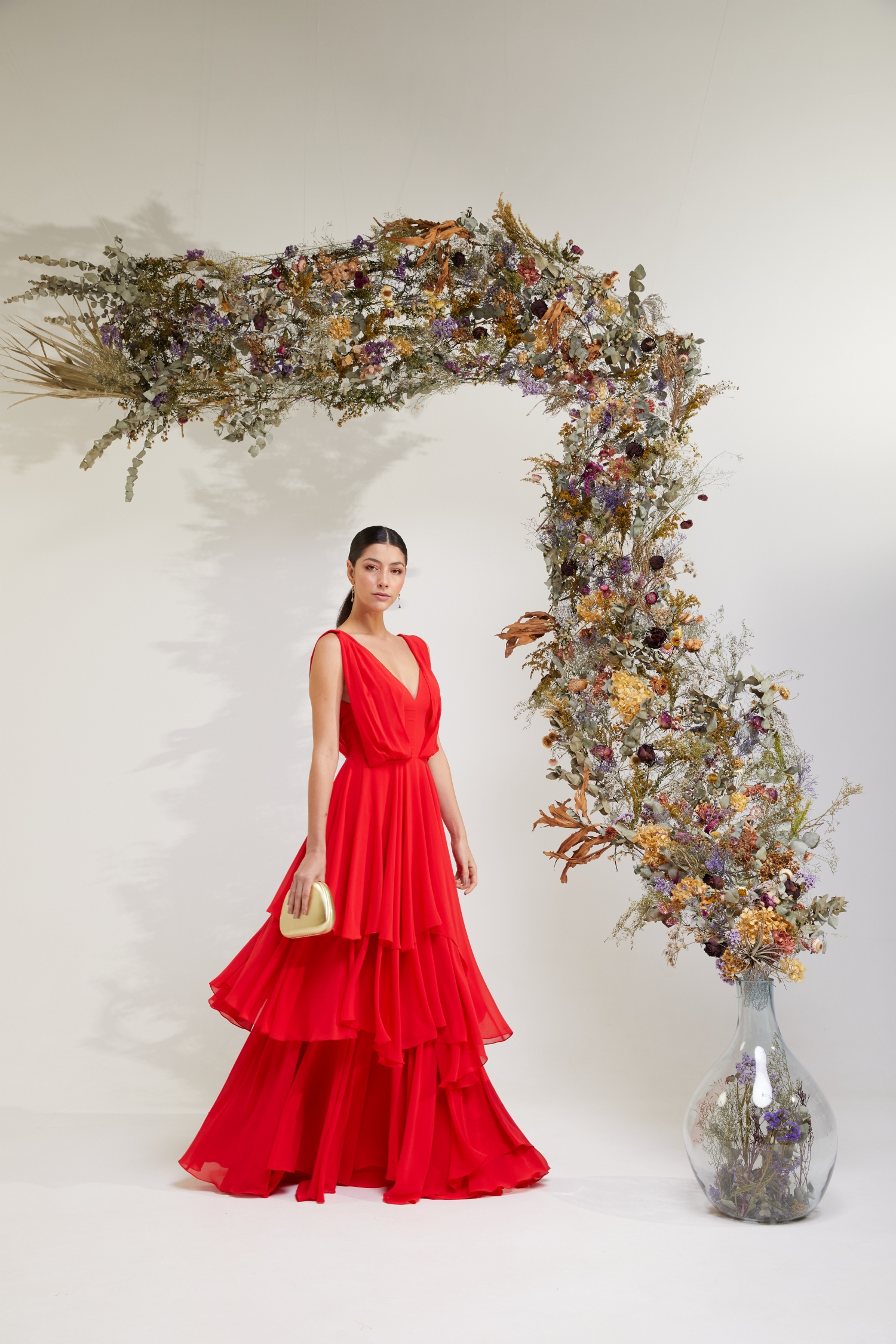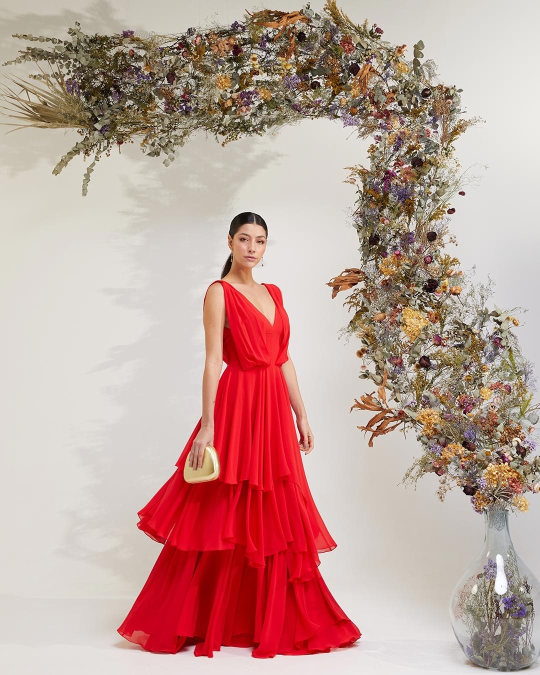 Modelo: longo, com decote V e saia em camadas