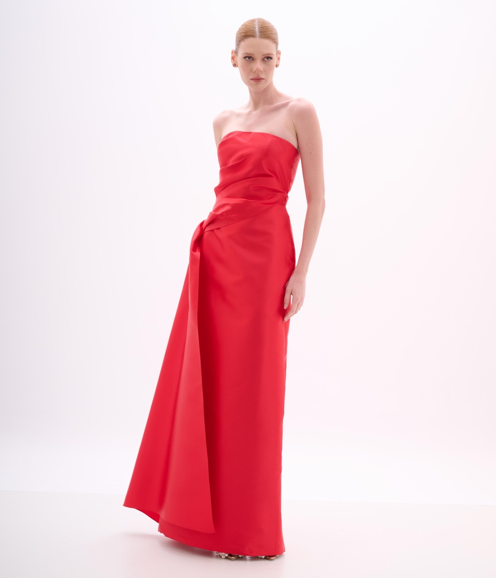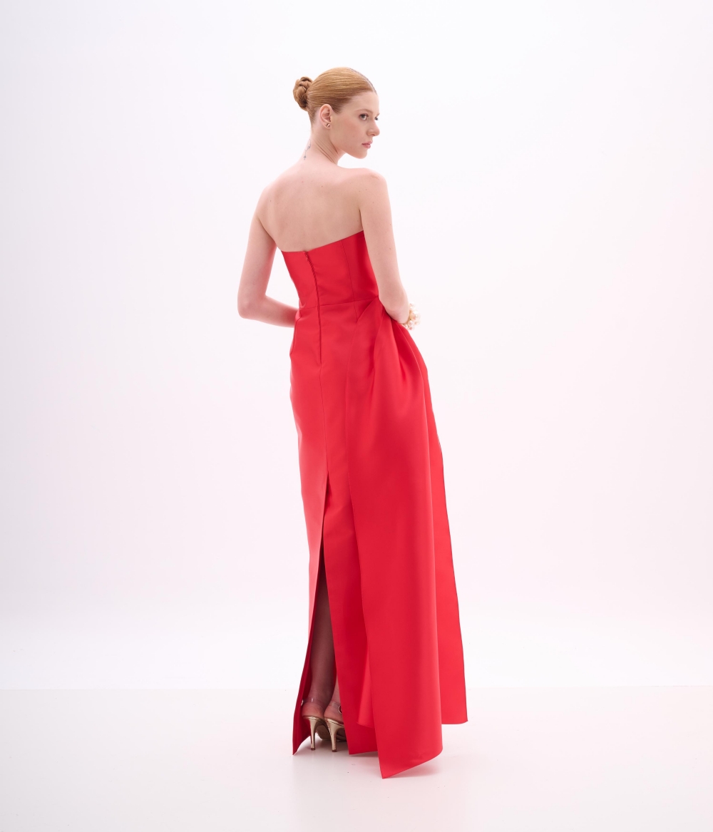 Vestido de festa longo vermelho em zibeline tomara que caia com fenda posterior