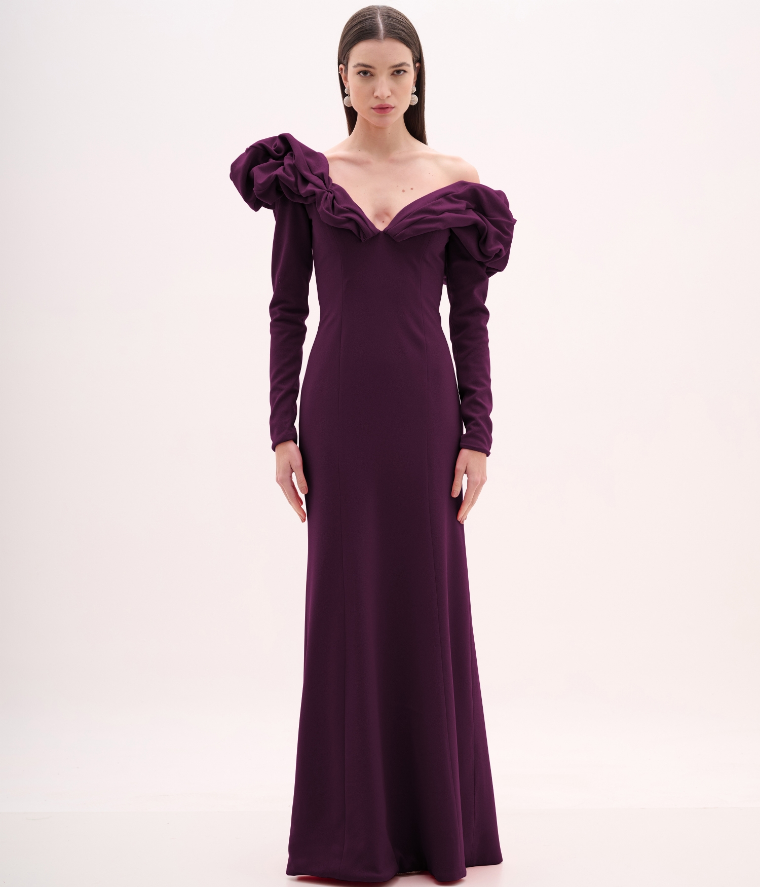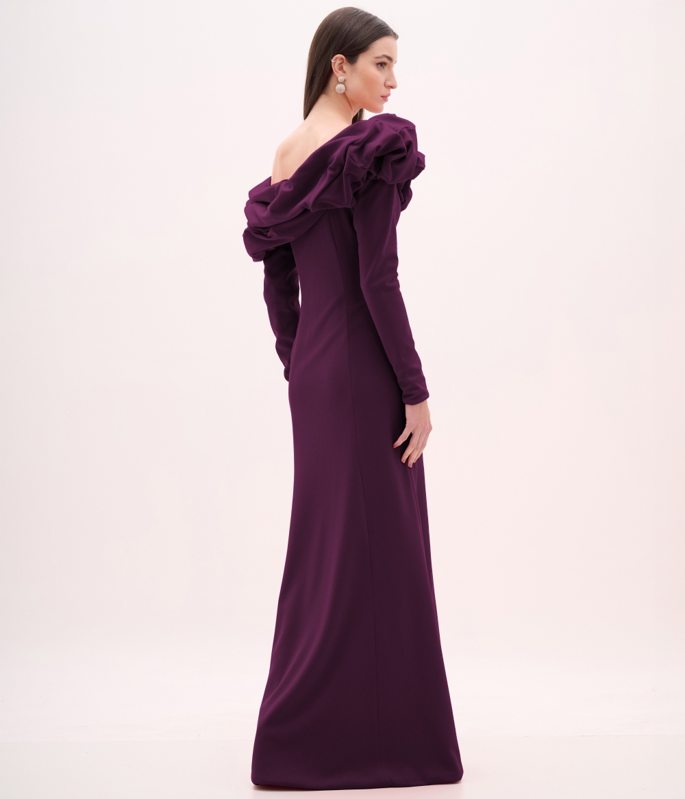 Vestido de festa longo vinho com decote ombro a ombro e mangas longas