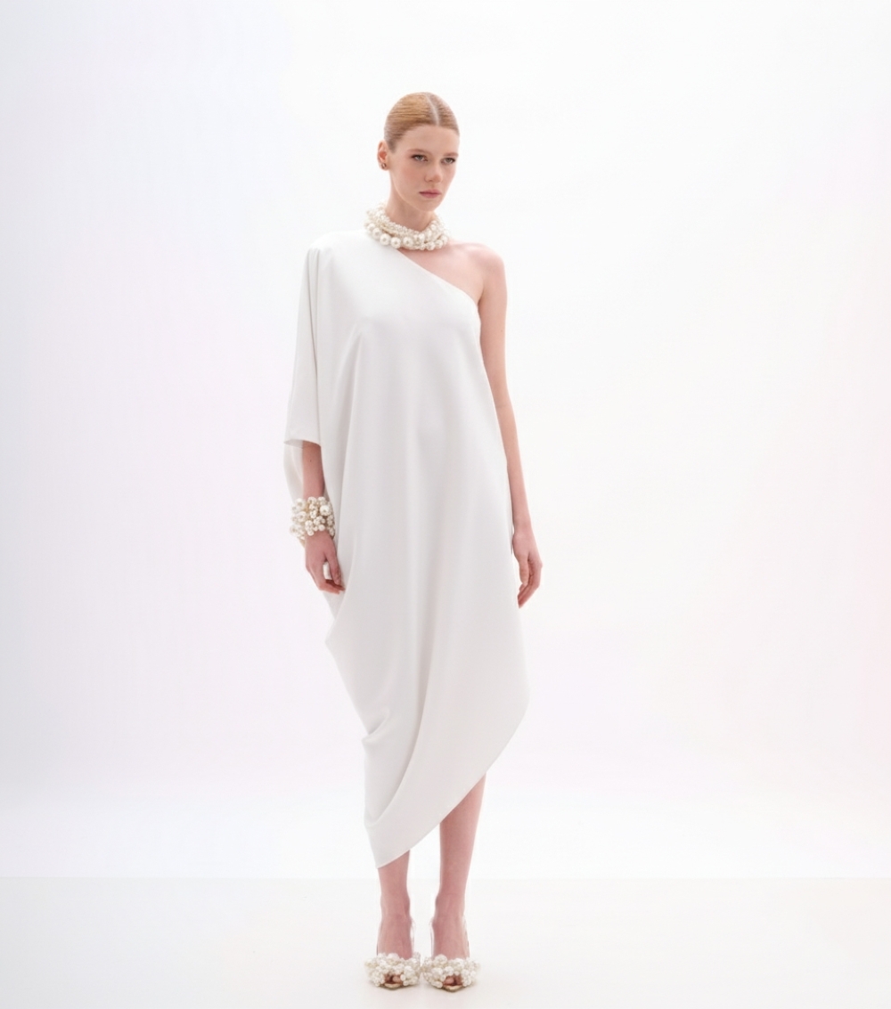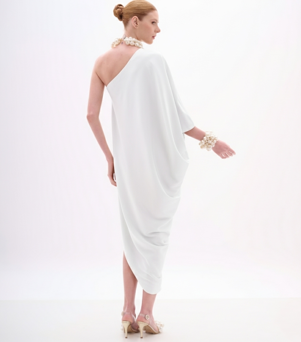 Vestido confeccionado em cetim pesado. Possui shape longuete, de um ombro só, manga como continuação do corpo, recorte assimetrico na barra sofisticado e inusitado.
