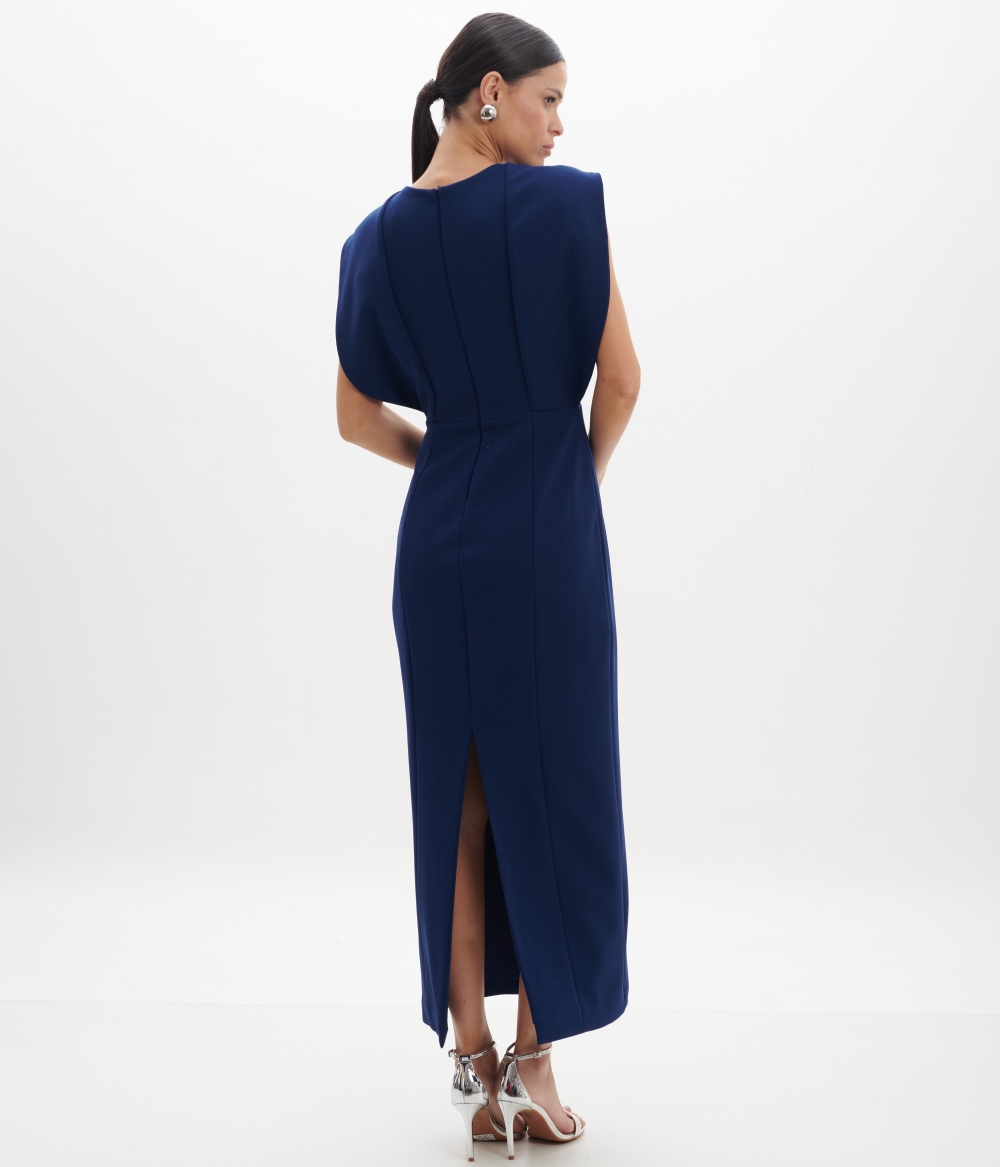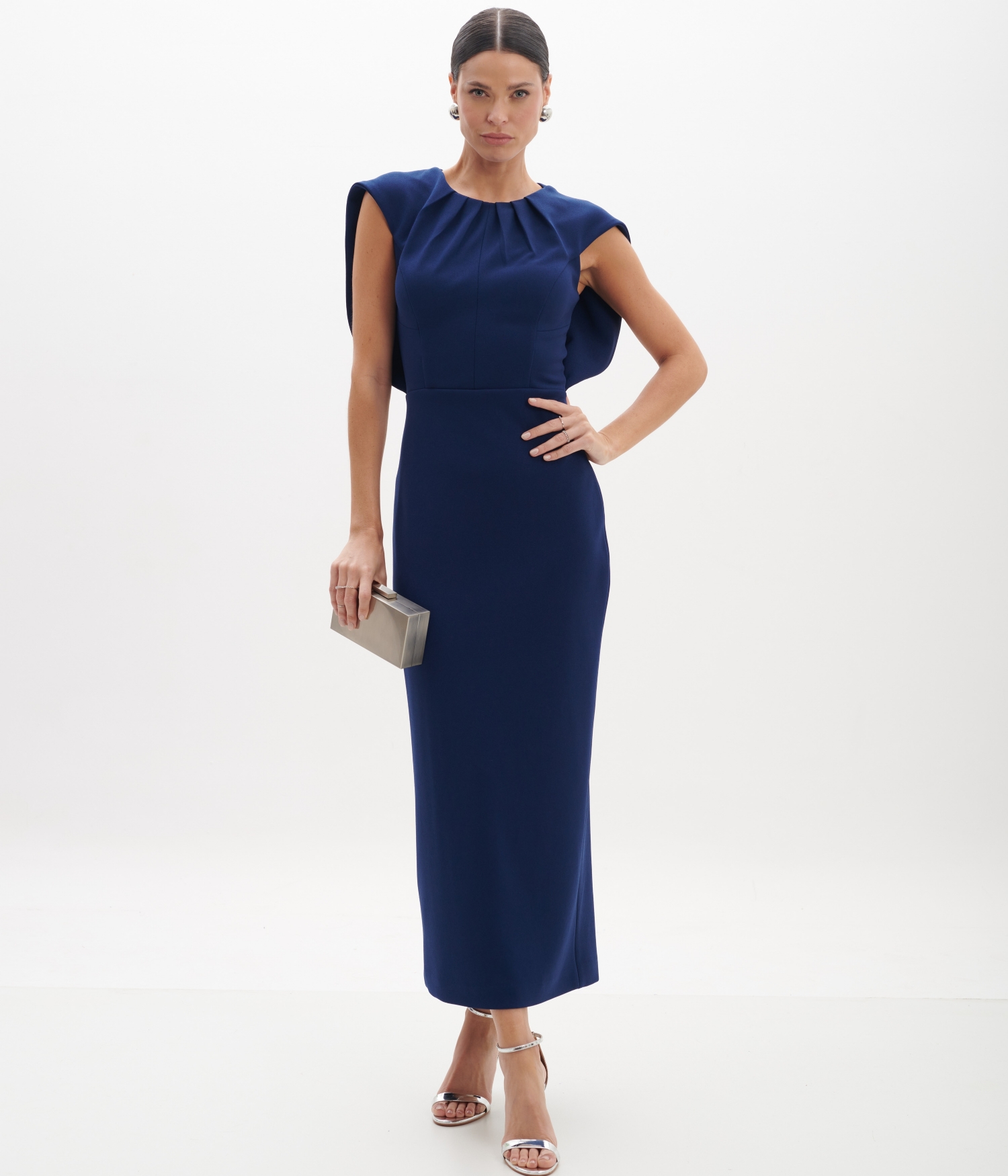 Vestido confeccionado em malha de crepe. Apresenta modelagem ajustada combinando sofisticação e versatilidade com mangas amplas e comprimento longuete, destacando um estilo moderno e ousado.