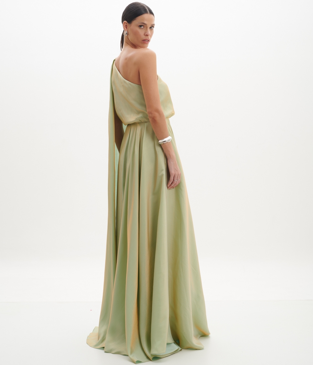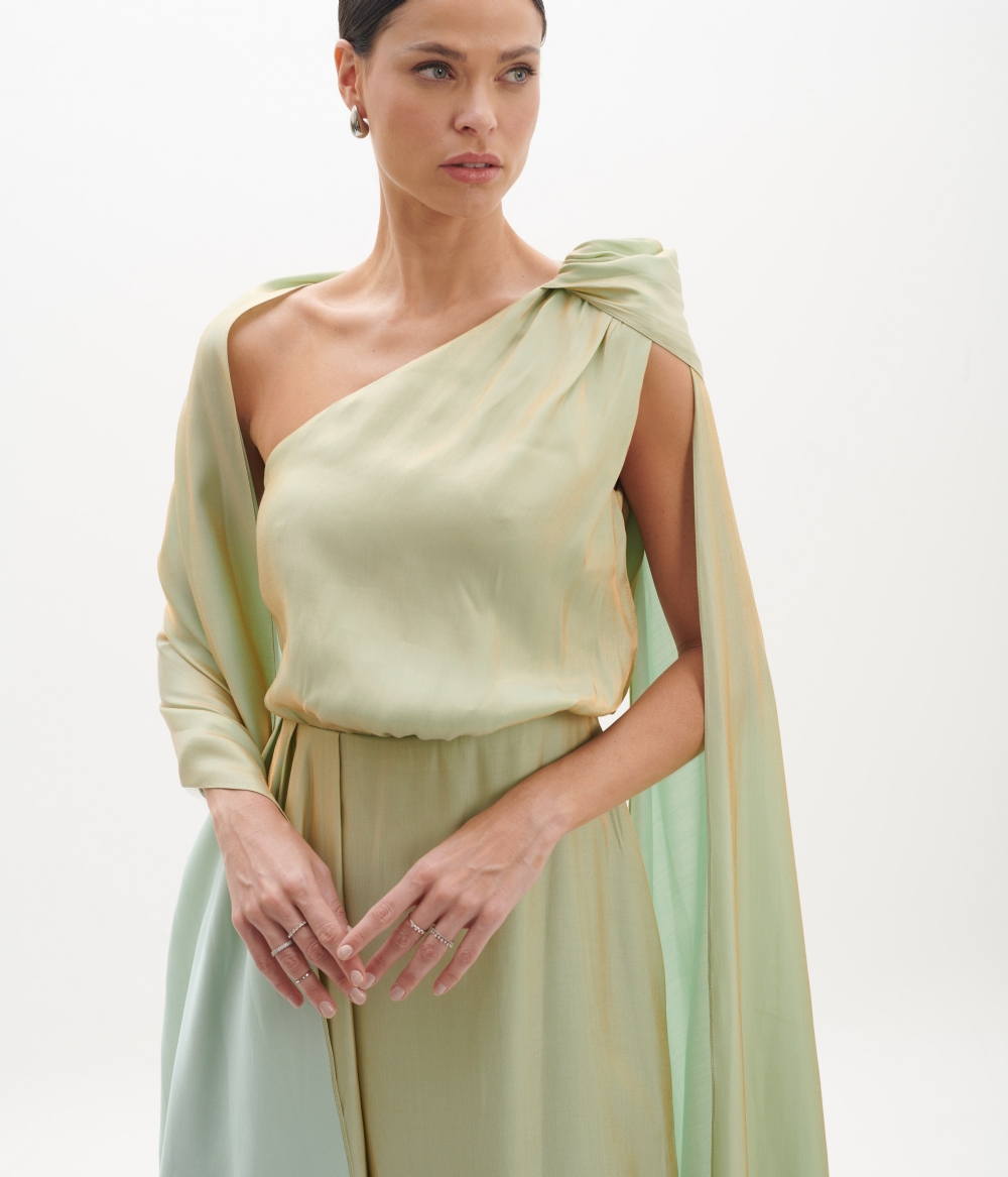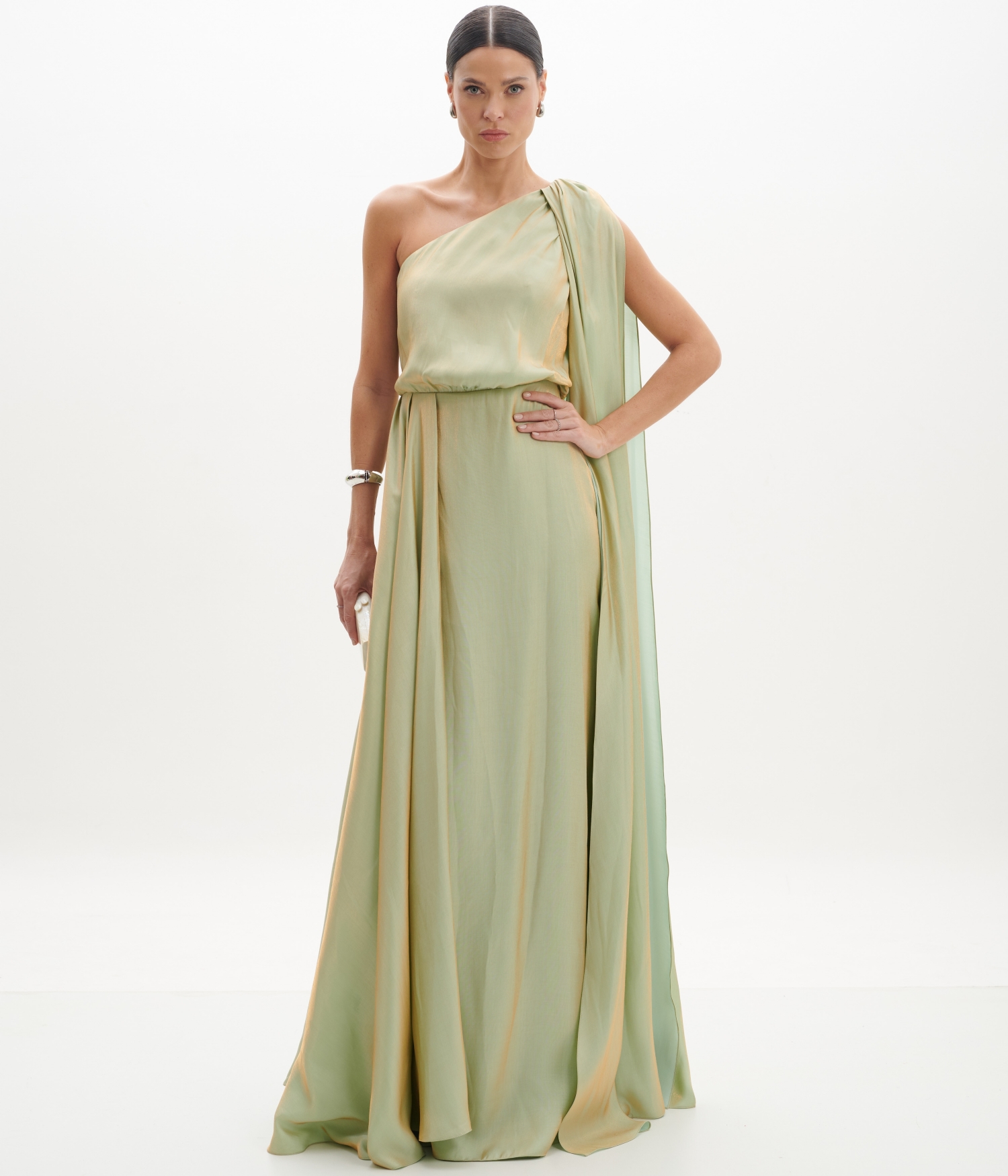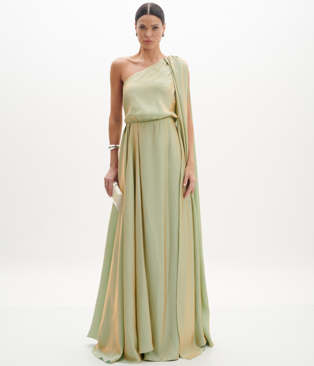 Vestido confeccionado em rayon optical. A combinação harmoniosa entre a modelagem e tecido fluido revela sofisticação. A peça possui decote assimétrico e manga fluida de ombro só criam um visual elegante e contemporâneo.