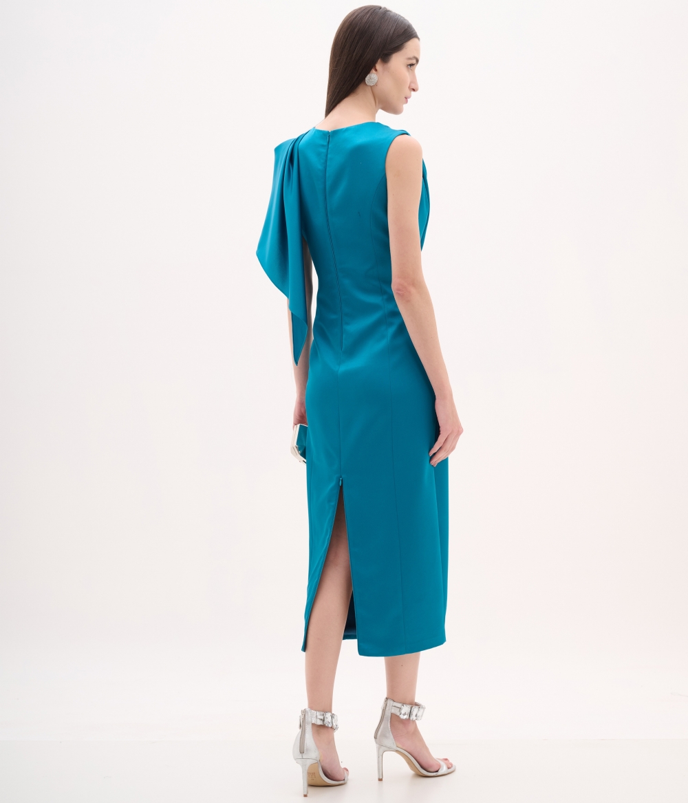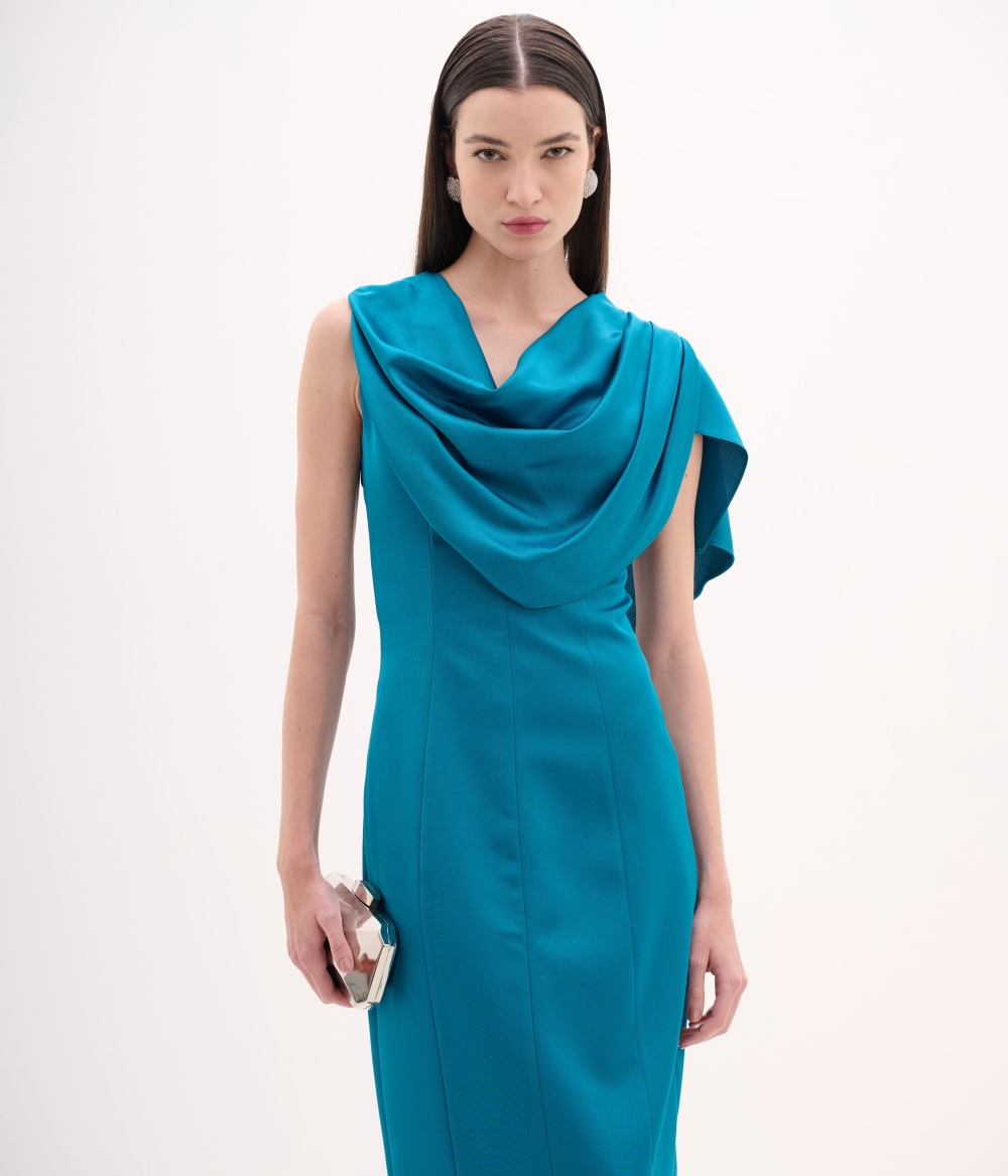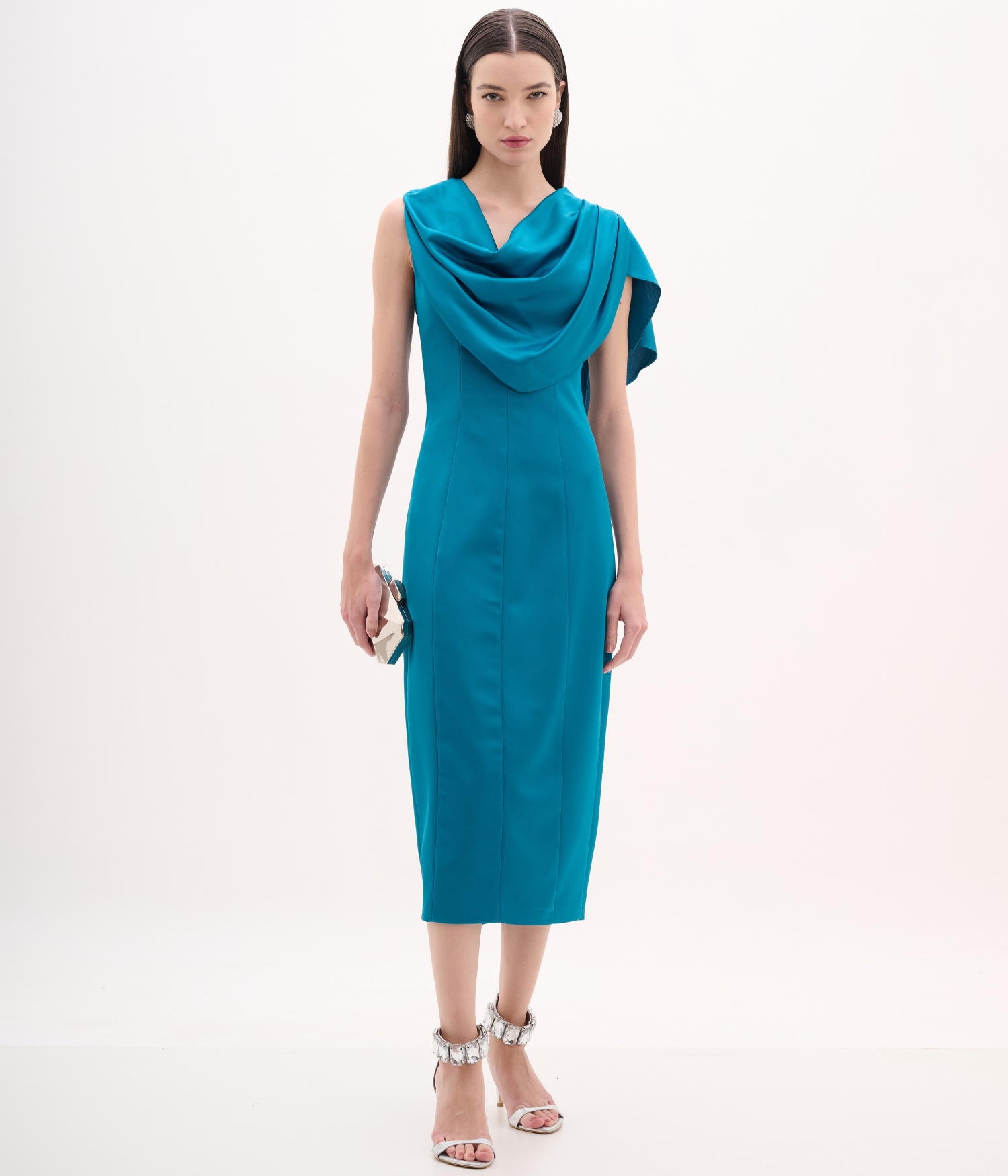 O vestido de festa midi azul é uma peça sofisticada e atemporal, perfeita para quem busca elegância em eventos formais e sociais. A modelagem reta valoriza a silhueta, enquanto a gola drapeada com detalhe sobre o ombro adiciona modernidade e sofisticação ao look.