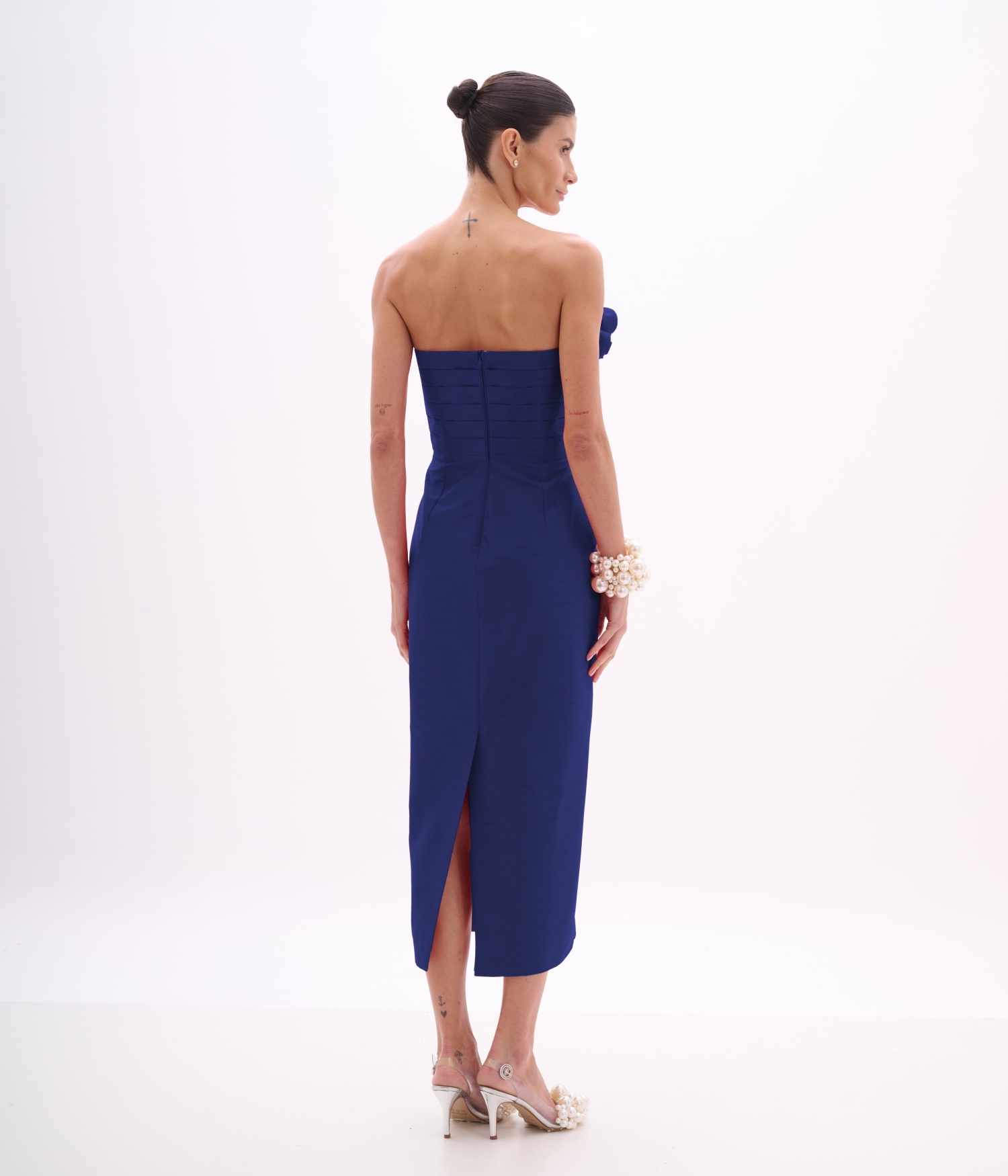 Modelo: Midi tomara que caia com detalhe escultórico e fenda posterior