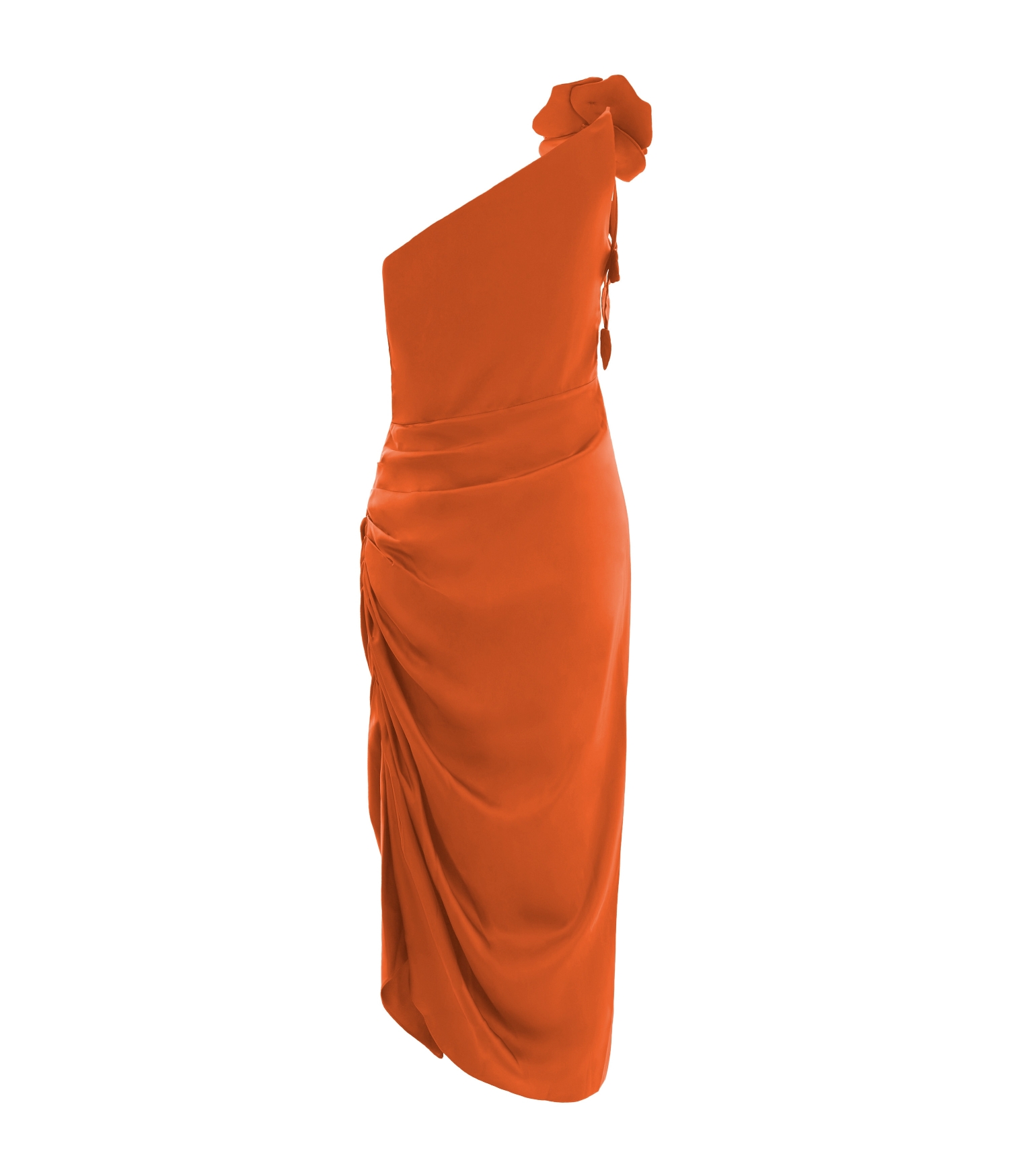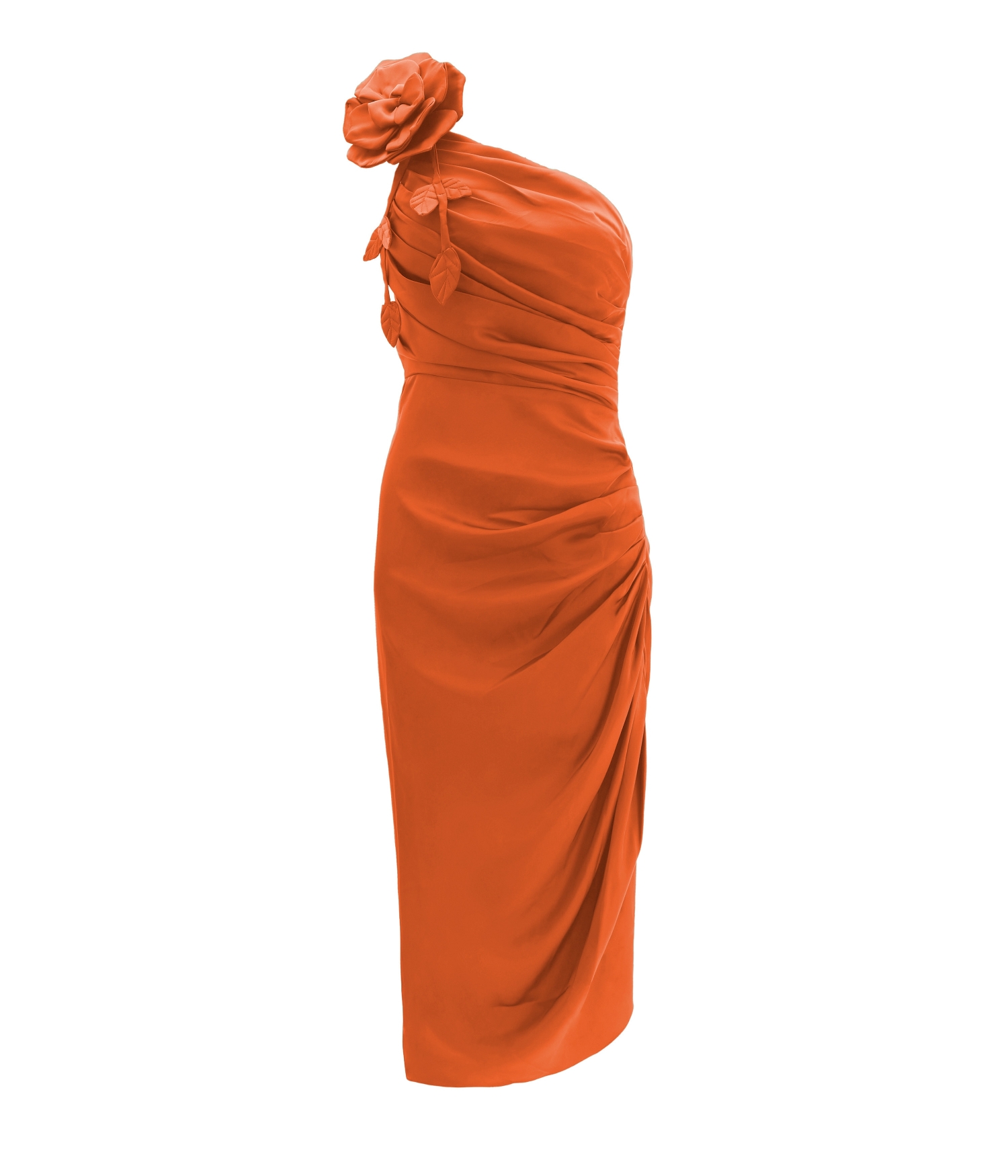 Vestido de festa mídi drapeado aplicação de flor