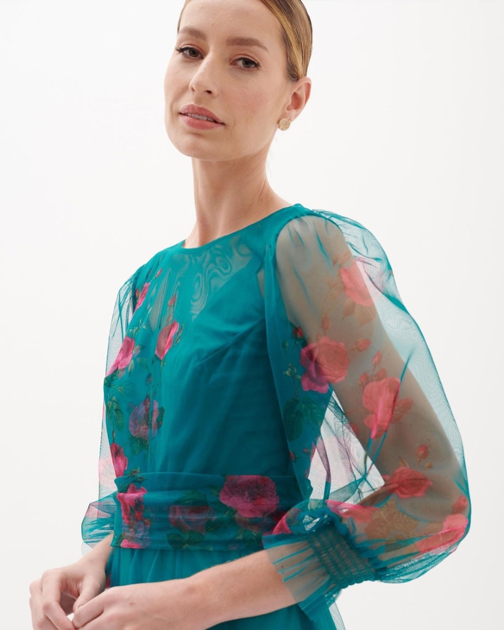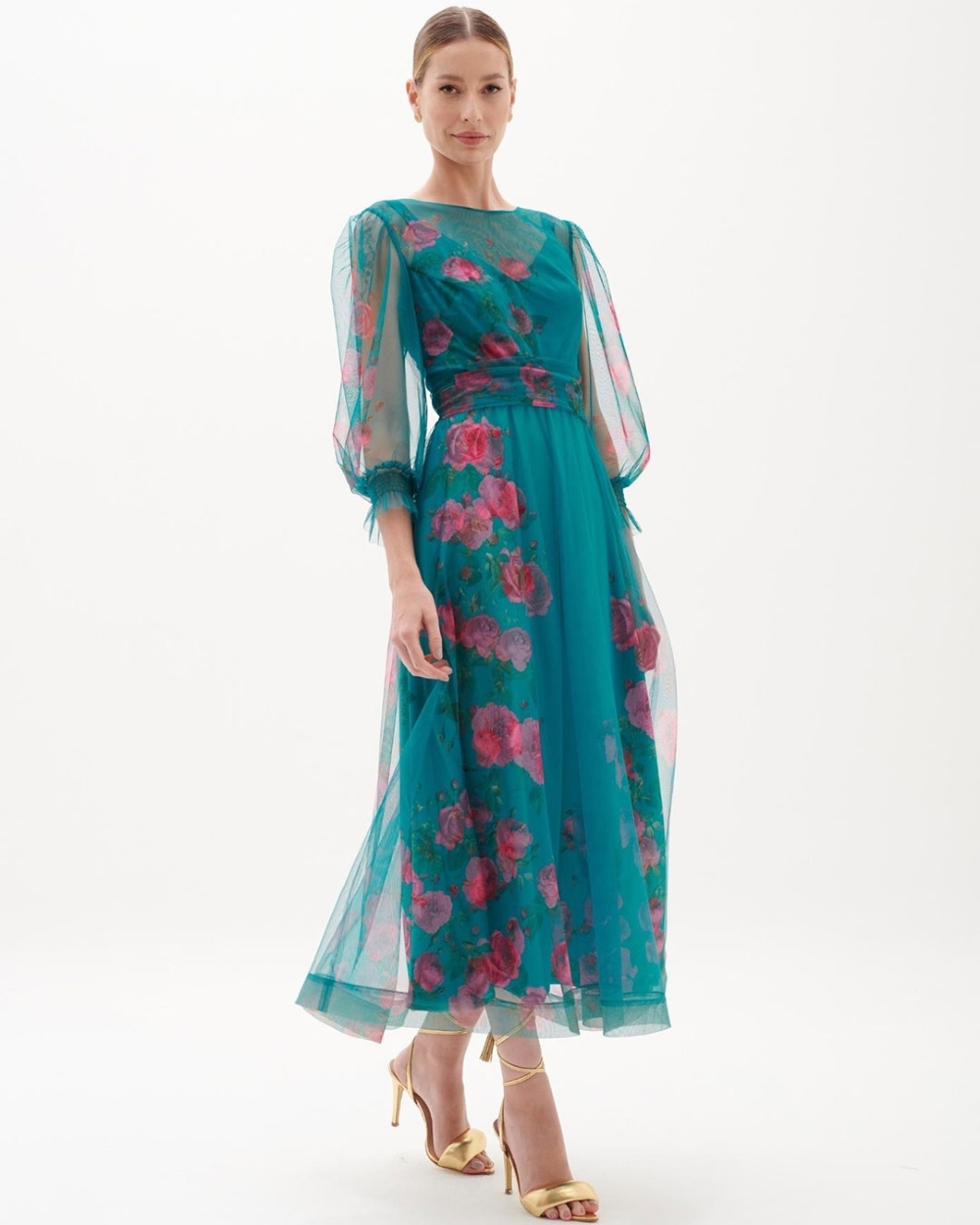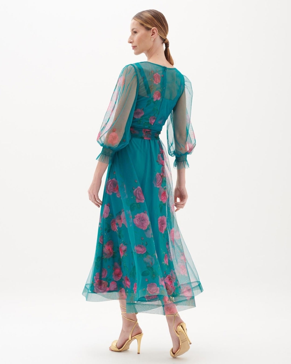 Vestido de festa mídi em tule estampado