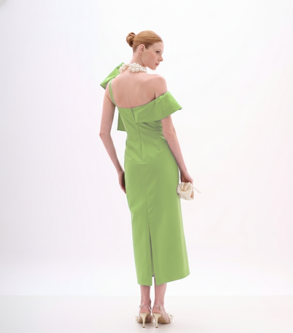 Vestido de festa midi Energy Green com decote ombro a ombro e laço