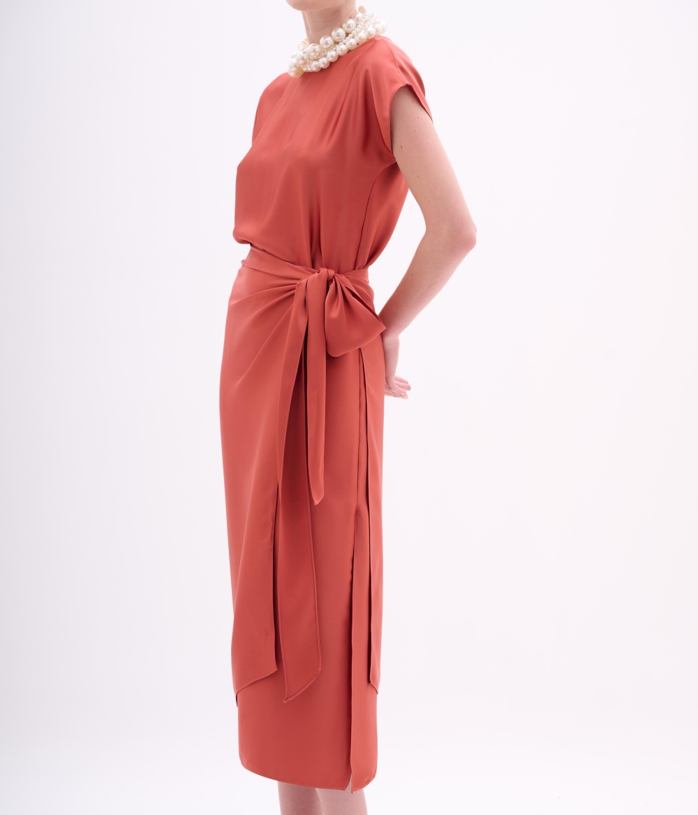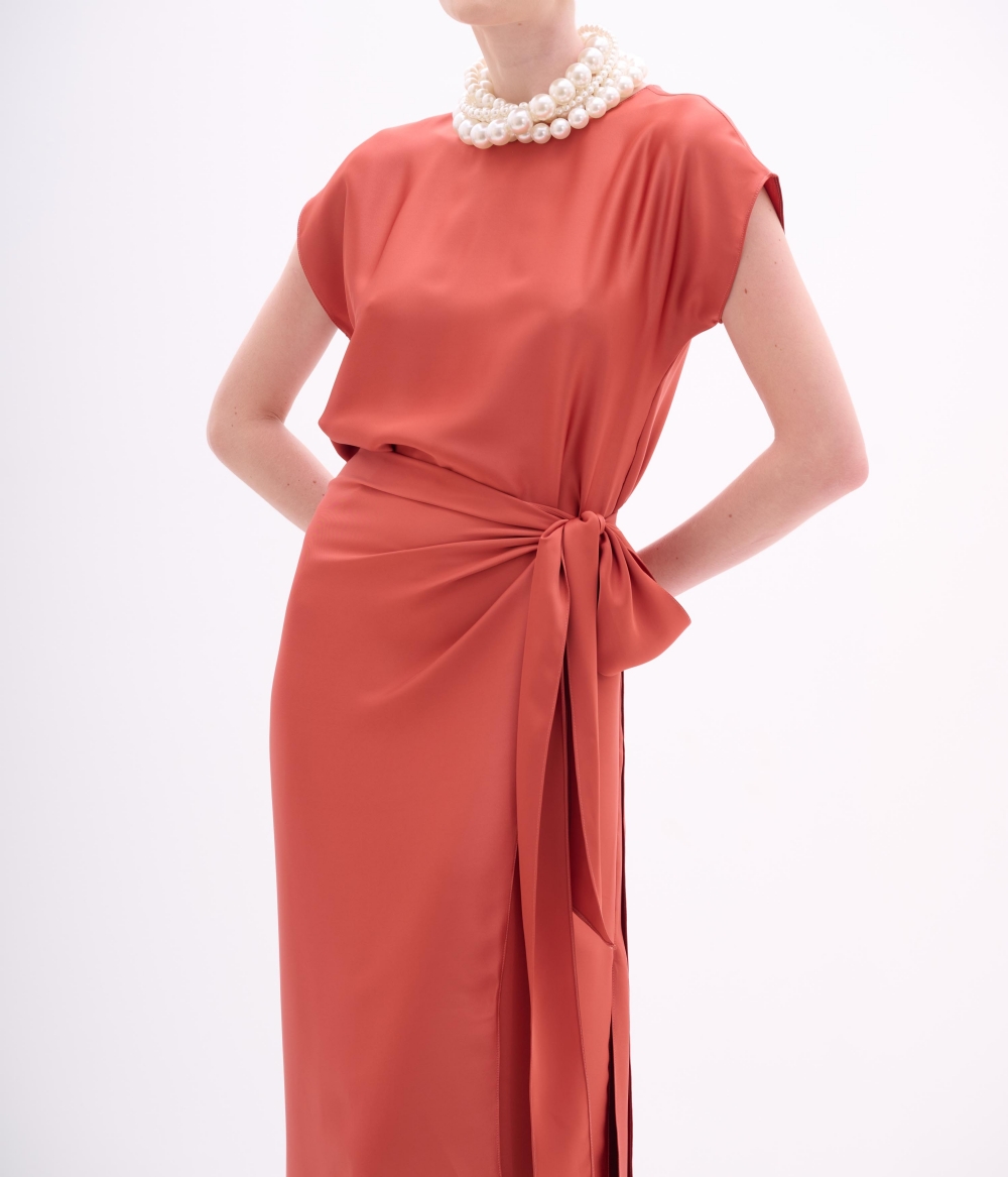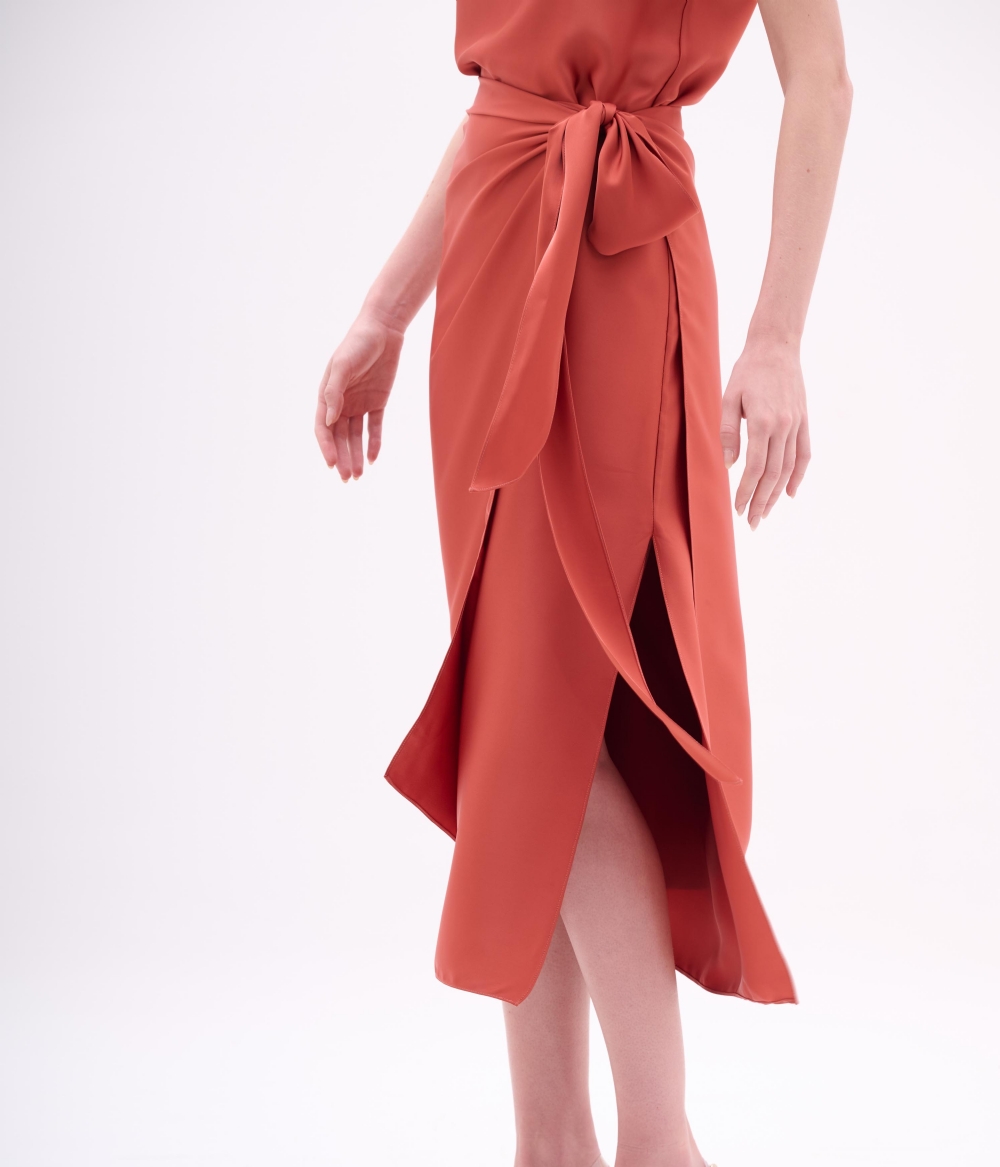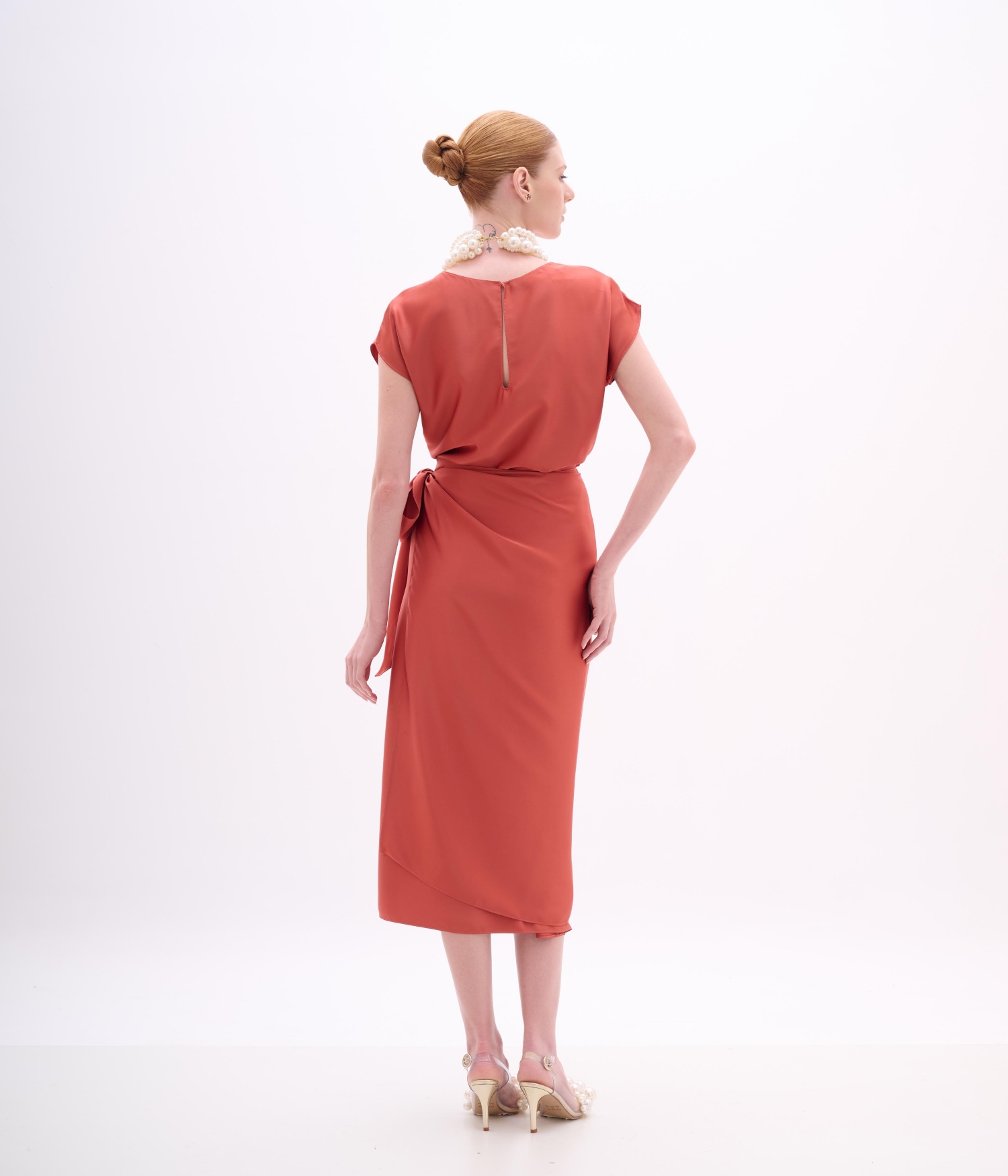 Ideal para madrinhas, convidadas de casamento, eventos diurnos e celebrações que pedem um vestido de festa terracota sofisticado e atemporal.