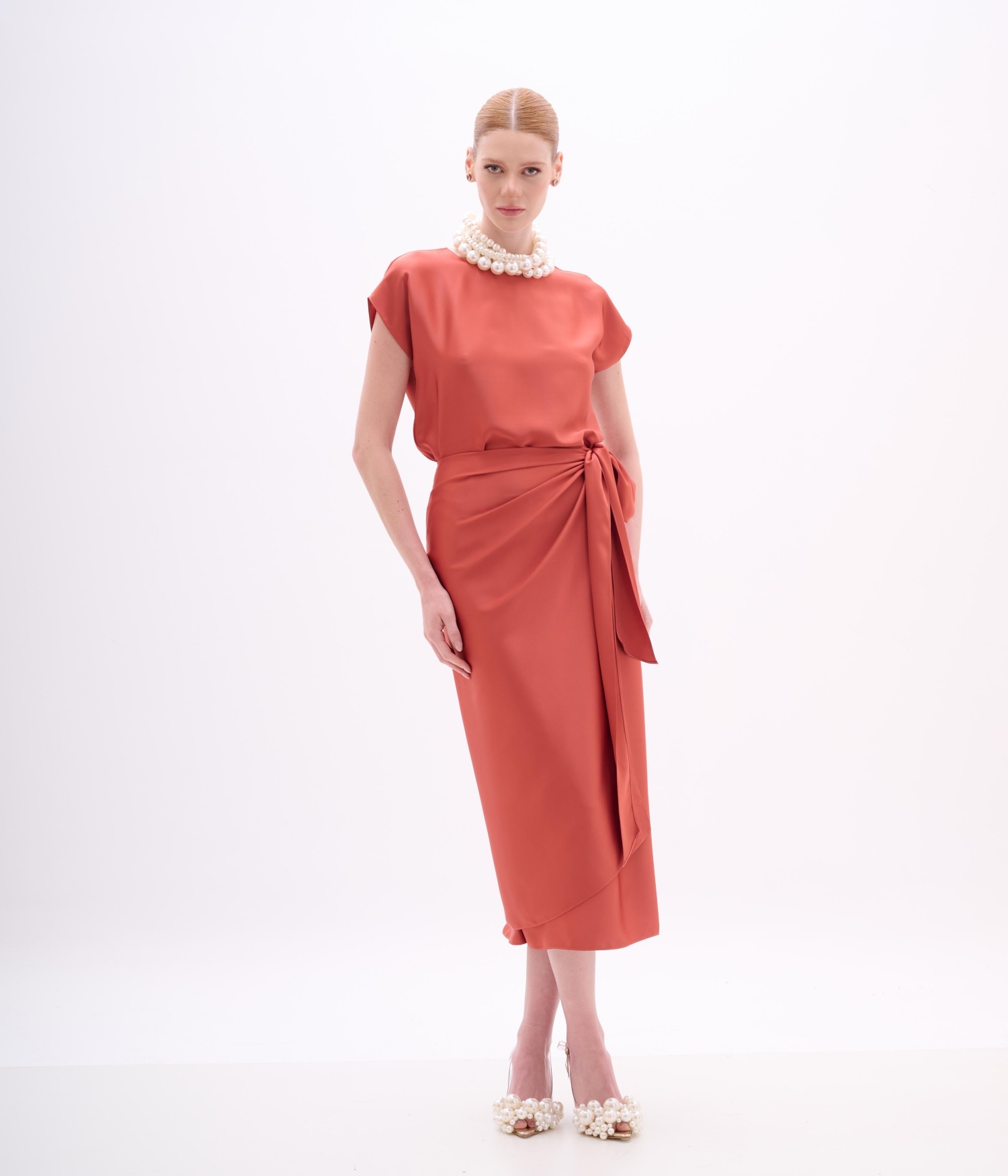 O vestido de festa midi terracota em cetim é uma proposta elegante e minimalista para eventos que pedem sofisticação. Com caimento leve e acabamento acetinado, o modelo é perfeito para quem busca um vestido elegante e contemporâneo para casamento, recepções ou celebrações especiais.