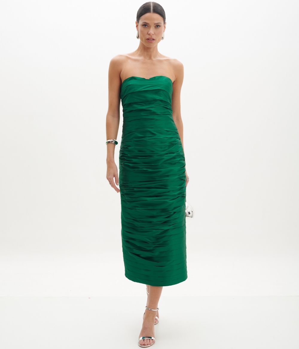 Vestido de festa confeccionado em tafetá na cor verde esmeralda, tecido de aspecto nobre, estrutura firme e leve brilho acetinado. O modelo tomara que caia apresenta busto modelado e corpo todo drapeado, criando um efeito texturizado que valoriza a silhueta com elegância e modernidade. O comprimento midi equilibra sofisticação e frescor, resultando em uma peça atemporal e de presença marcante.