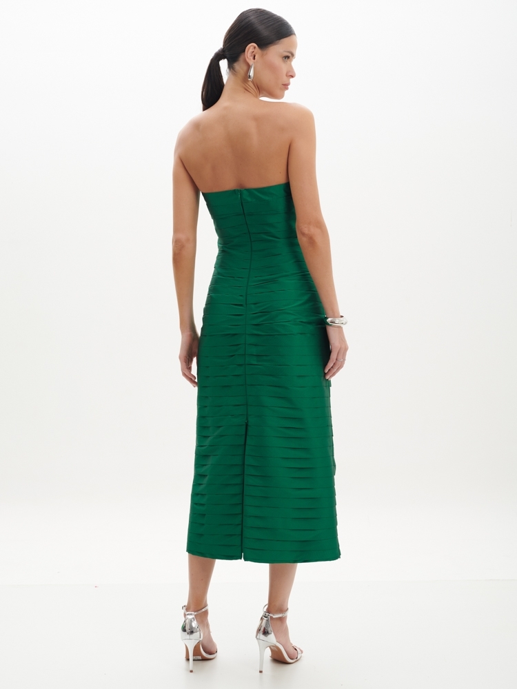 Vestido de festa midi verde esmeralda em tafetá tomara que caia drapeado