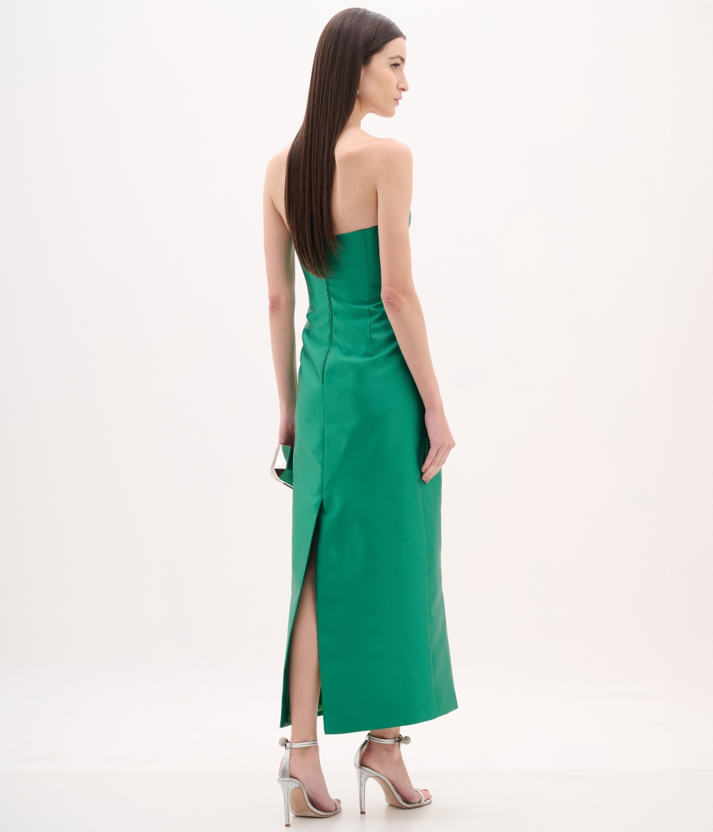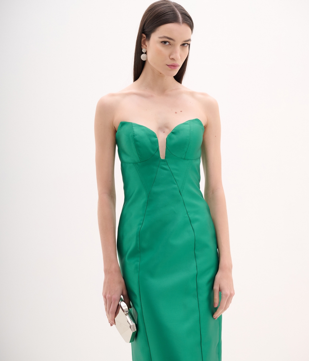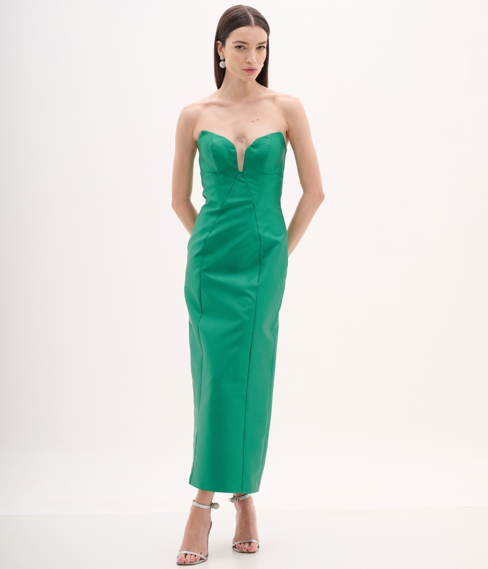 Vestido de festa midi verde esmeralda em zibeline tomara que caia com decote coração