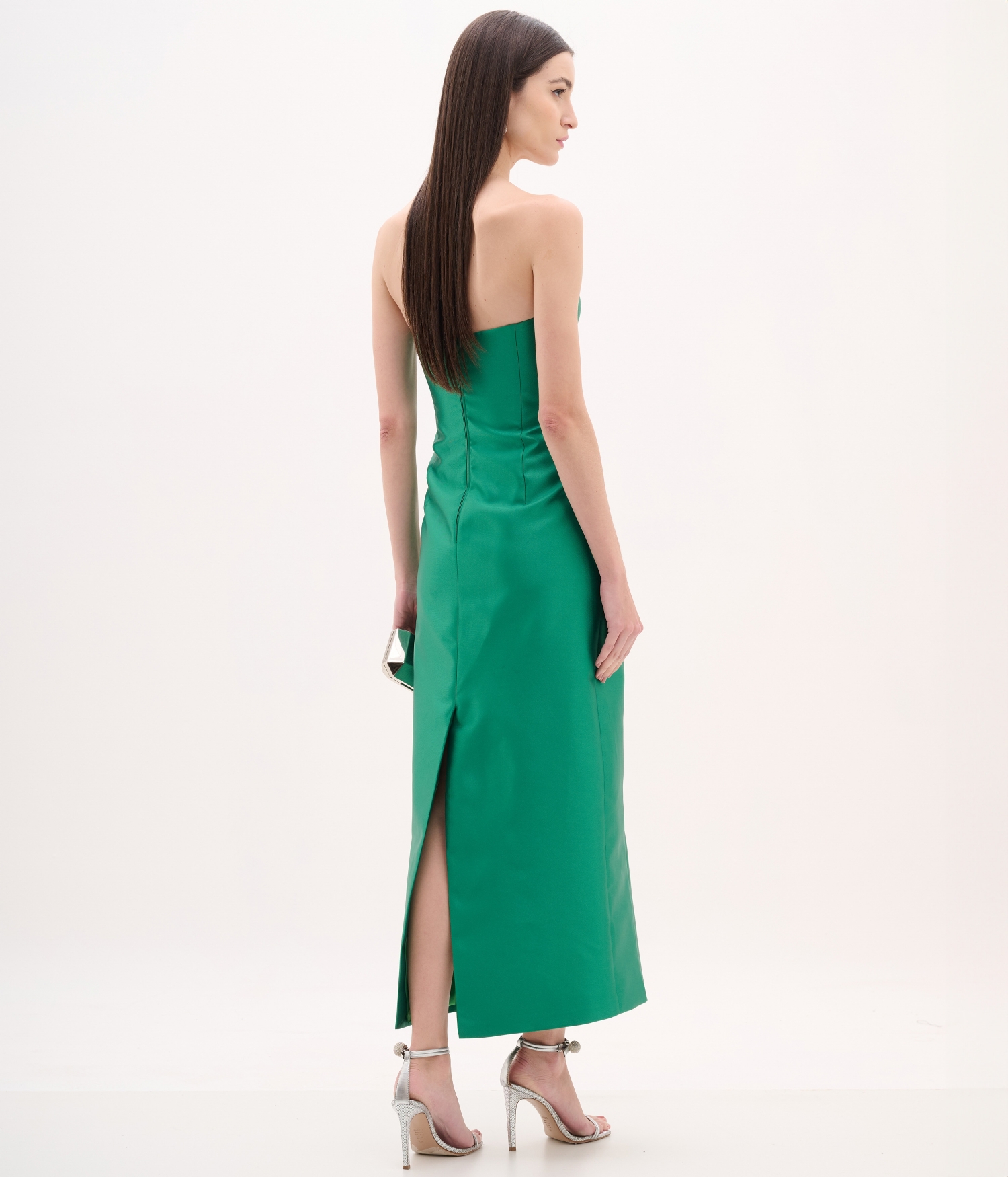 Vestido de festa confeccionado em zibeline na cor verde esmeralda, tecido de aspecto nobre e estrutura firme que confere elegância e sofisticação ao visual. O modelo apresenta decote tomara que caia com recorte em formato de coração e leve abertura frontal, que valoriza o colo de forma moderna e delicada. A modelagem ajustada ao corpo destaca a silhueta com elegância, enquanto o comprimento midi traz um toque contemporâneo e refinado.