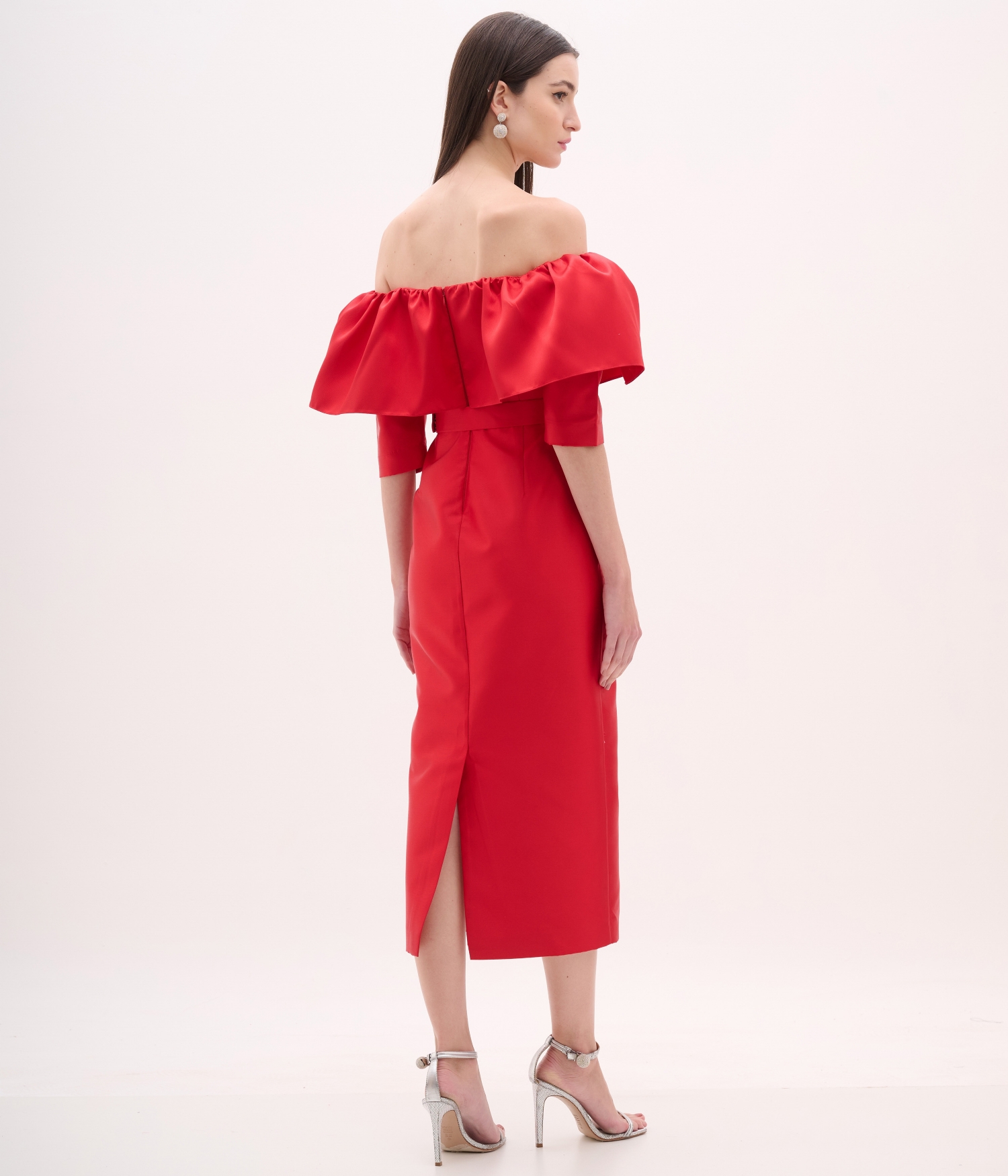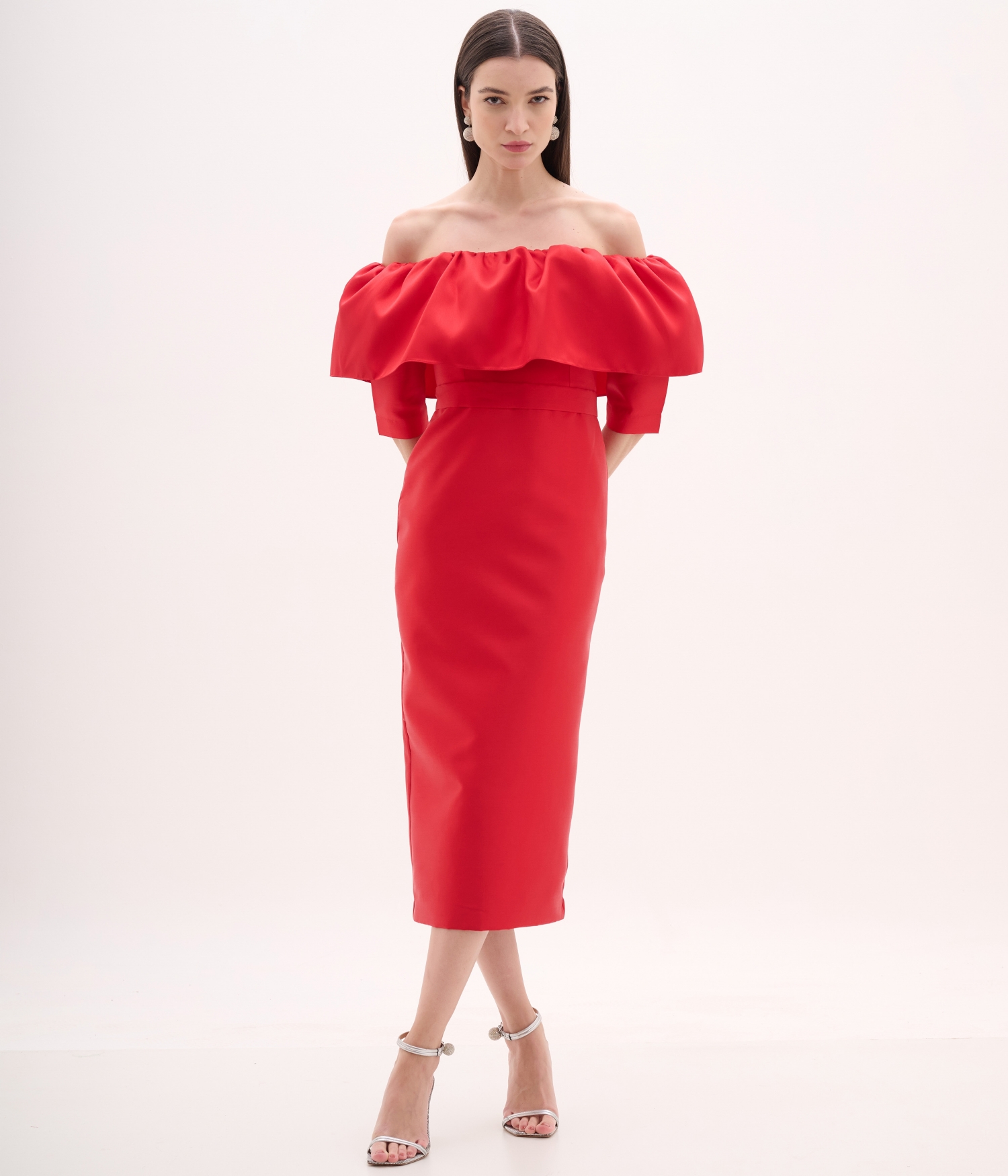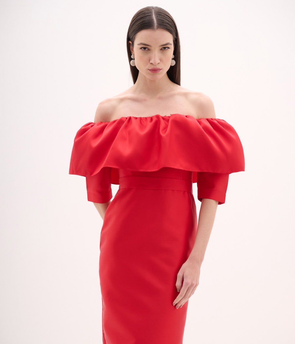 Vestido de festa midi vermelho em zibeline com decote ombro a ombro