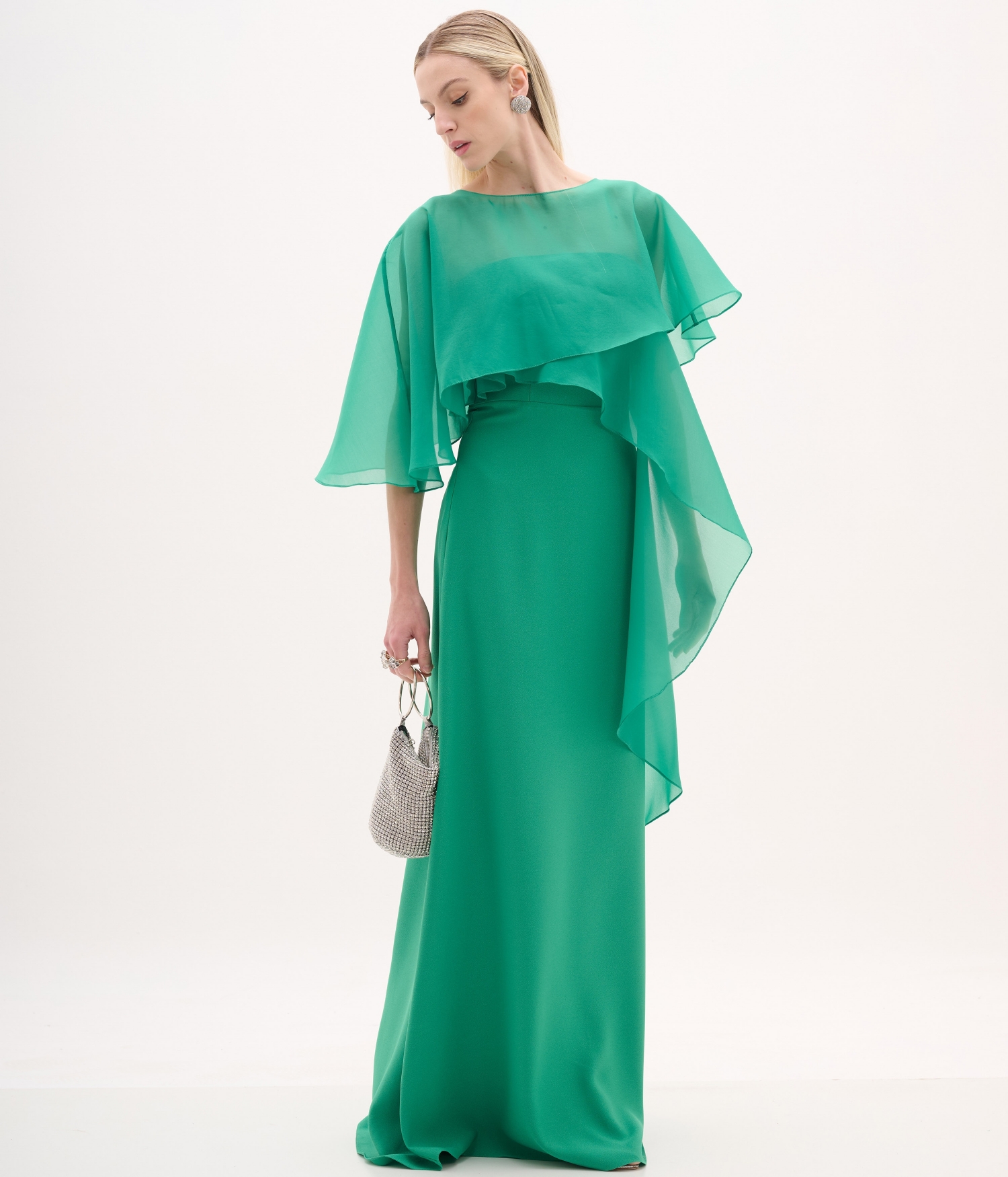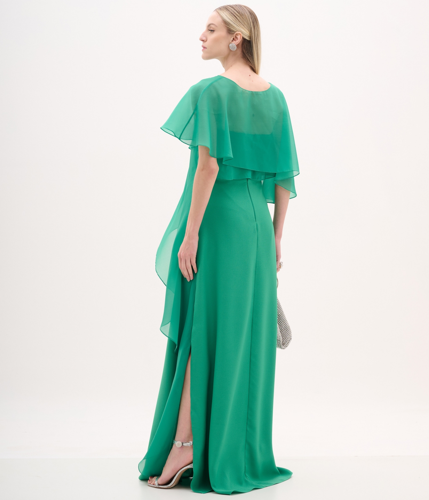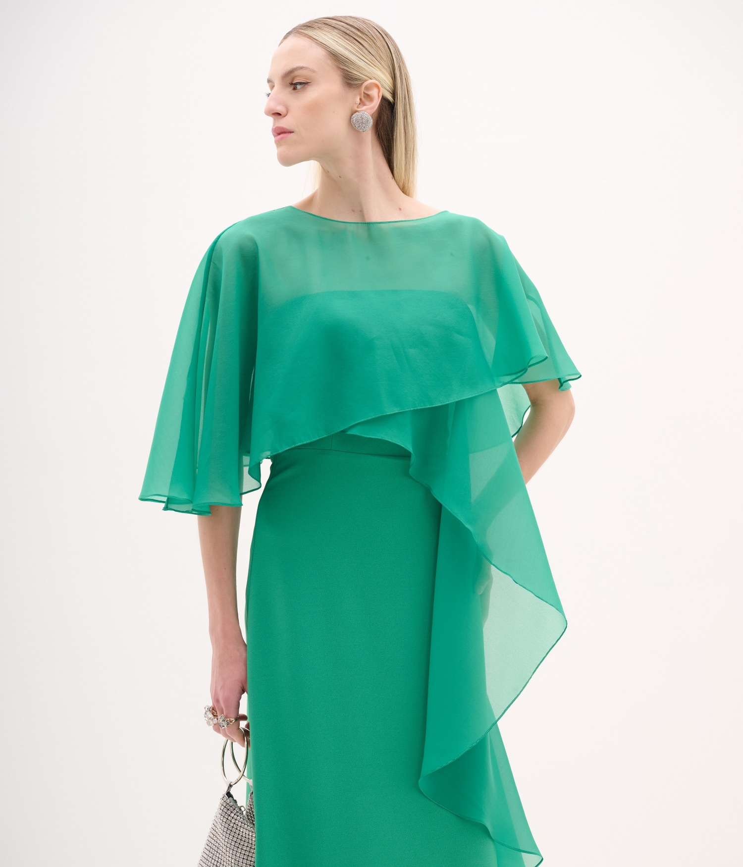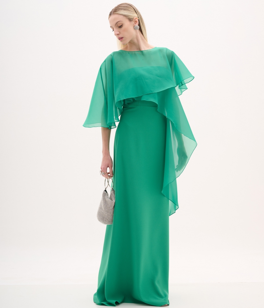 Vestido confeccionado em organza c/ crepe acetinado leve.