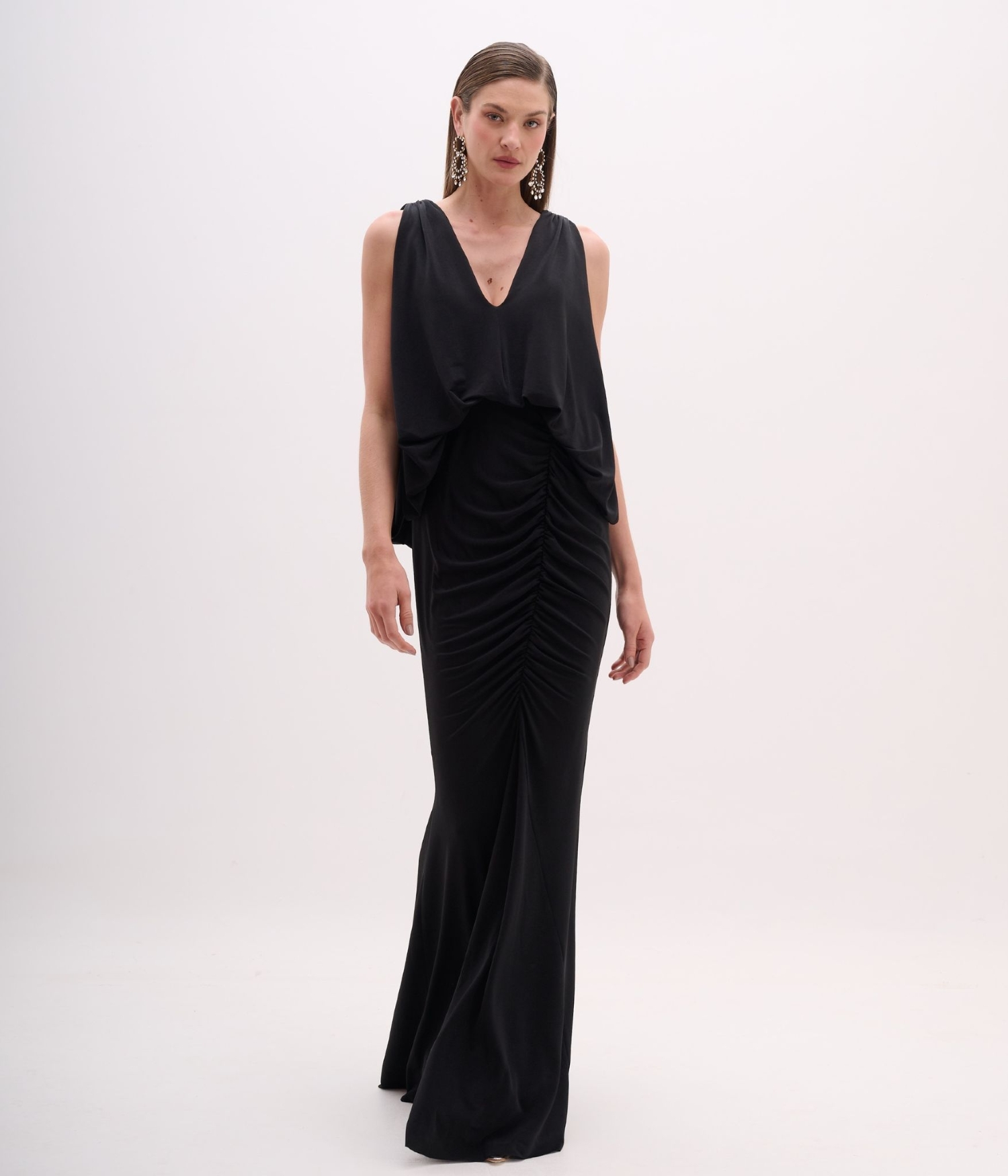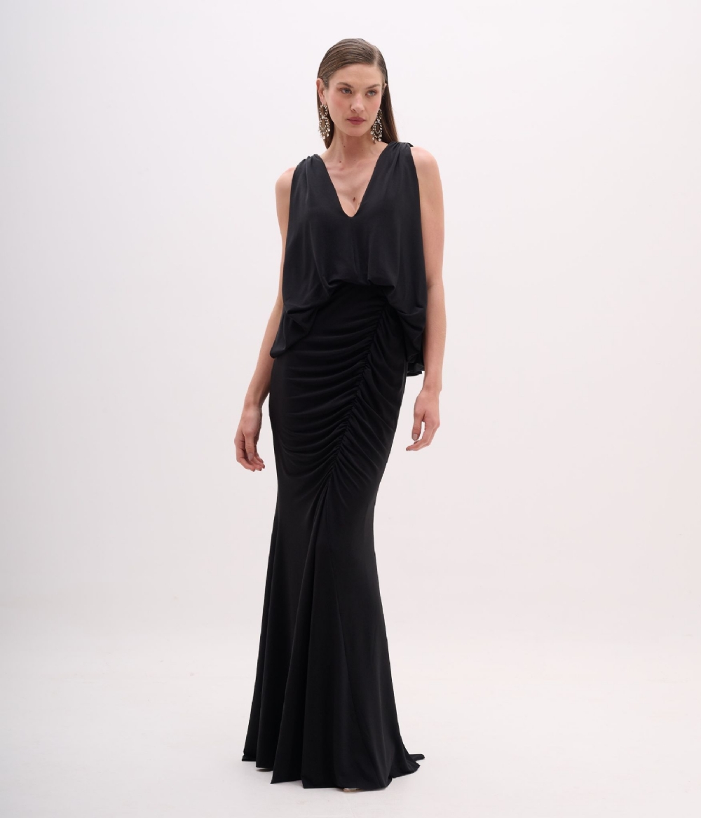 Vestido longo de festa na cor preta, que equilibra elegância e fluidez com um design sofisticado. A parte superior conta com blusa sobreposta de caimento leve, com decote V profundo na frente e costas amplas e fluidas, criando um efeito capa delicado e envolvente. A saia longa é ajustada ao corpo, com drapeado lateral que destaca a silhueta e adiciona movimento à peça. O caimento é impecável, com leve abertura na barra que valoriza o caminhar.